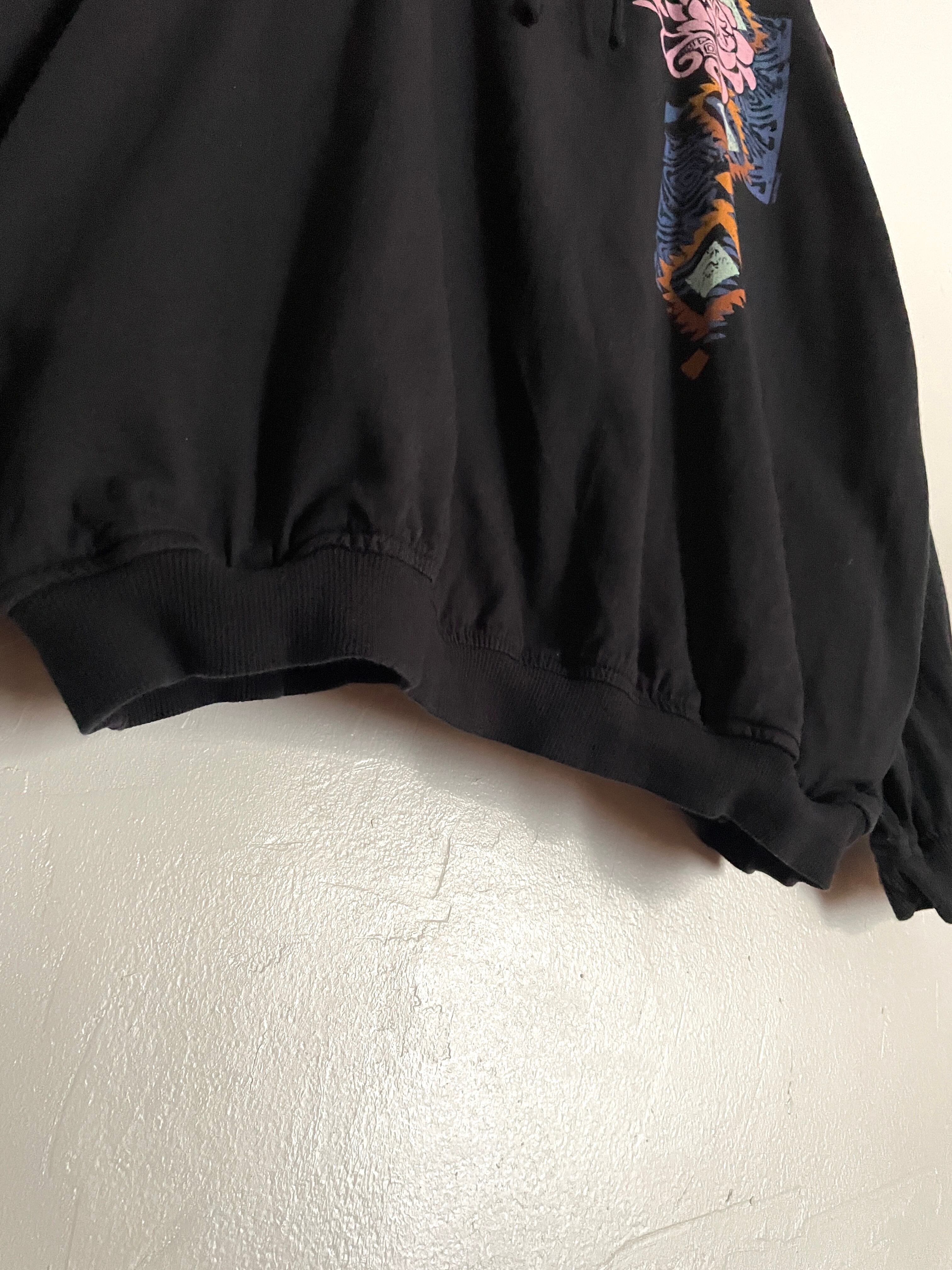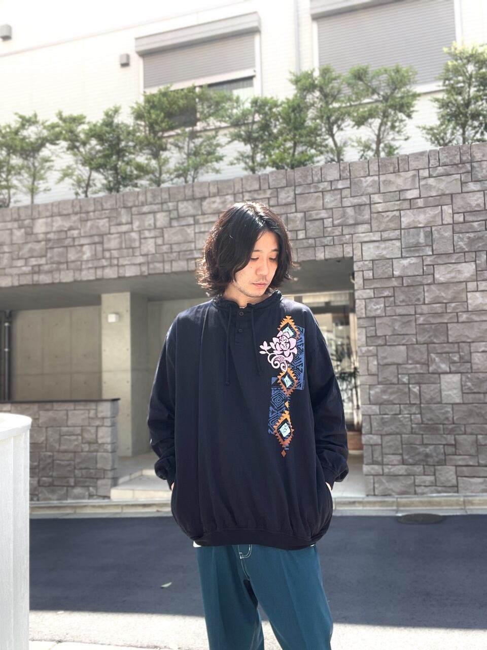 ブラックボディに民族調の柄が部分的にプリントされたプルオーバートップス。ボタン開きのネックでドローコード入りのデザイン、素材はコットン100%ですがスウェット地ではなく、シャツに使われているような布帛で作られています。両脇にはサイドポケット付き、袖口、裾はリブ仕様と、いろんなアイテムの要素を一つにまとめたお洒落なトップスです。