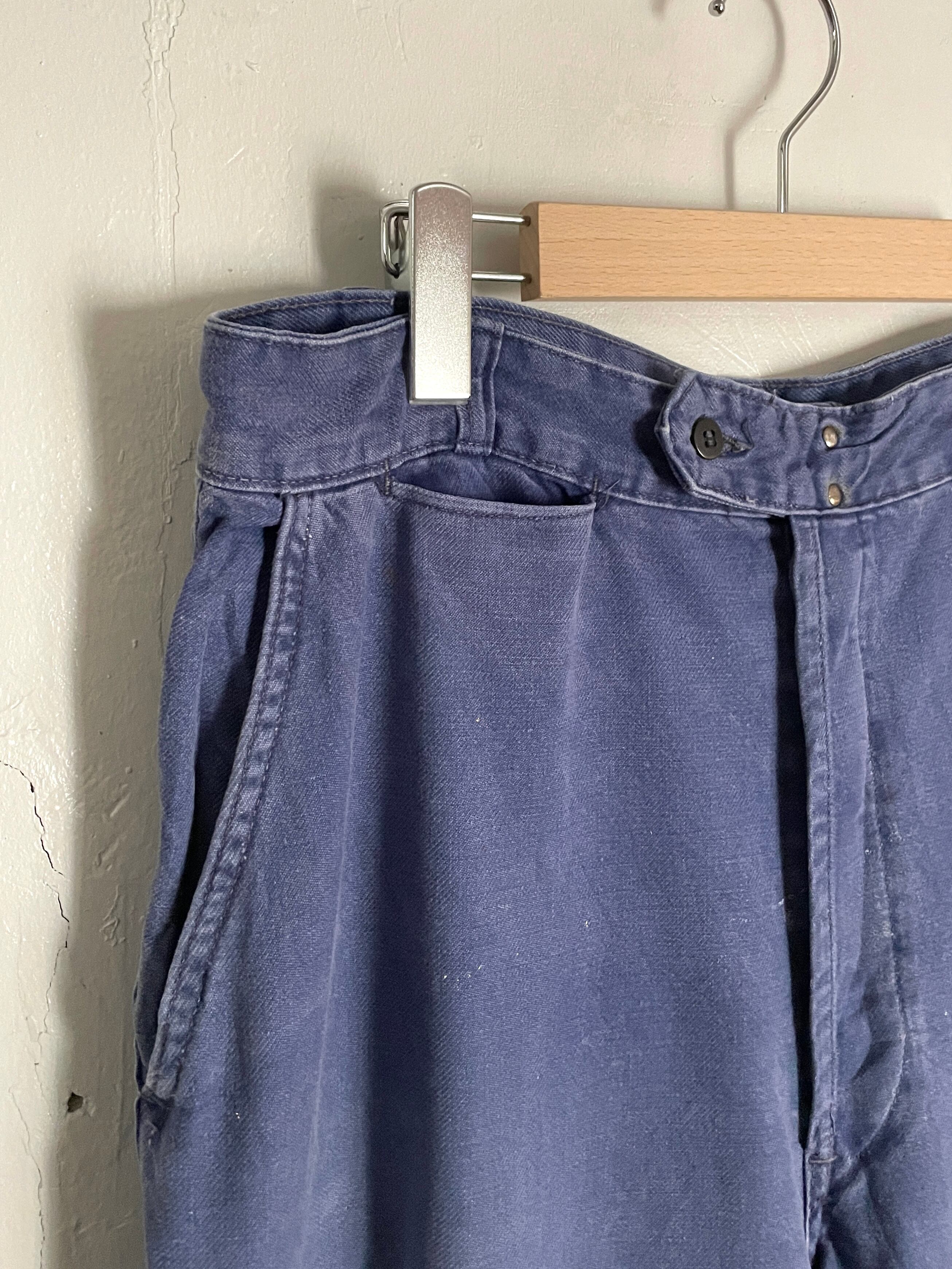 褪せ感のあるネイビーに所々ペンキ跡が見られる、ユーロのワークパンツ。やや細身のストレートシルエットです。ウエスト部分にはコインポケット付き、バックポケットは右側のみで、右脇には小さな玉淵ポケットも付いています。ペンキ跡は見られるものの、破れや着用の問題となるダメージは見られません。古着特有の雰囲気のあるパンツです。