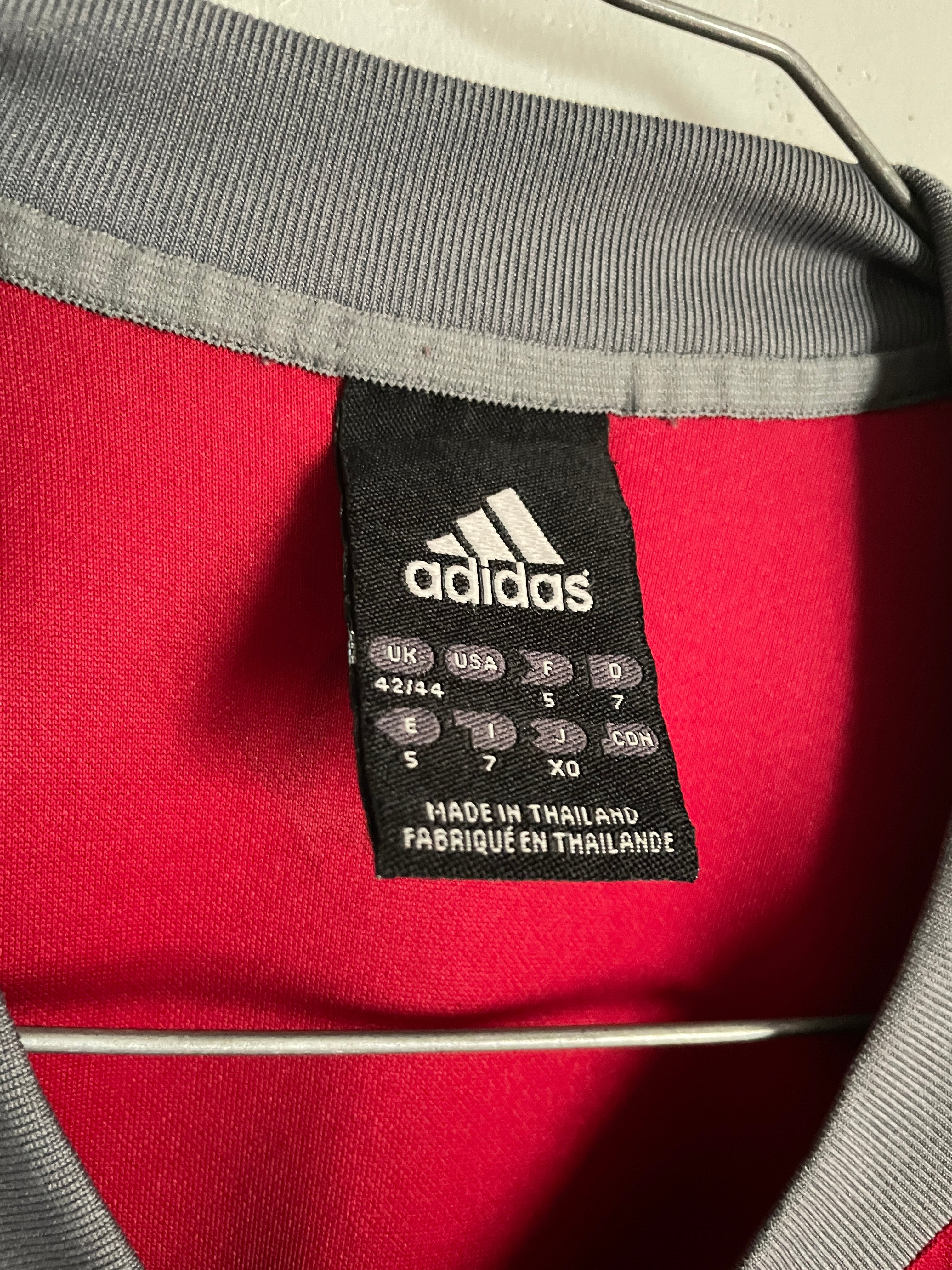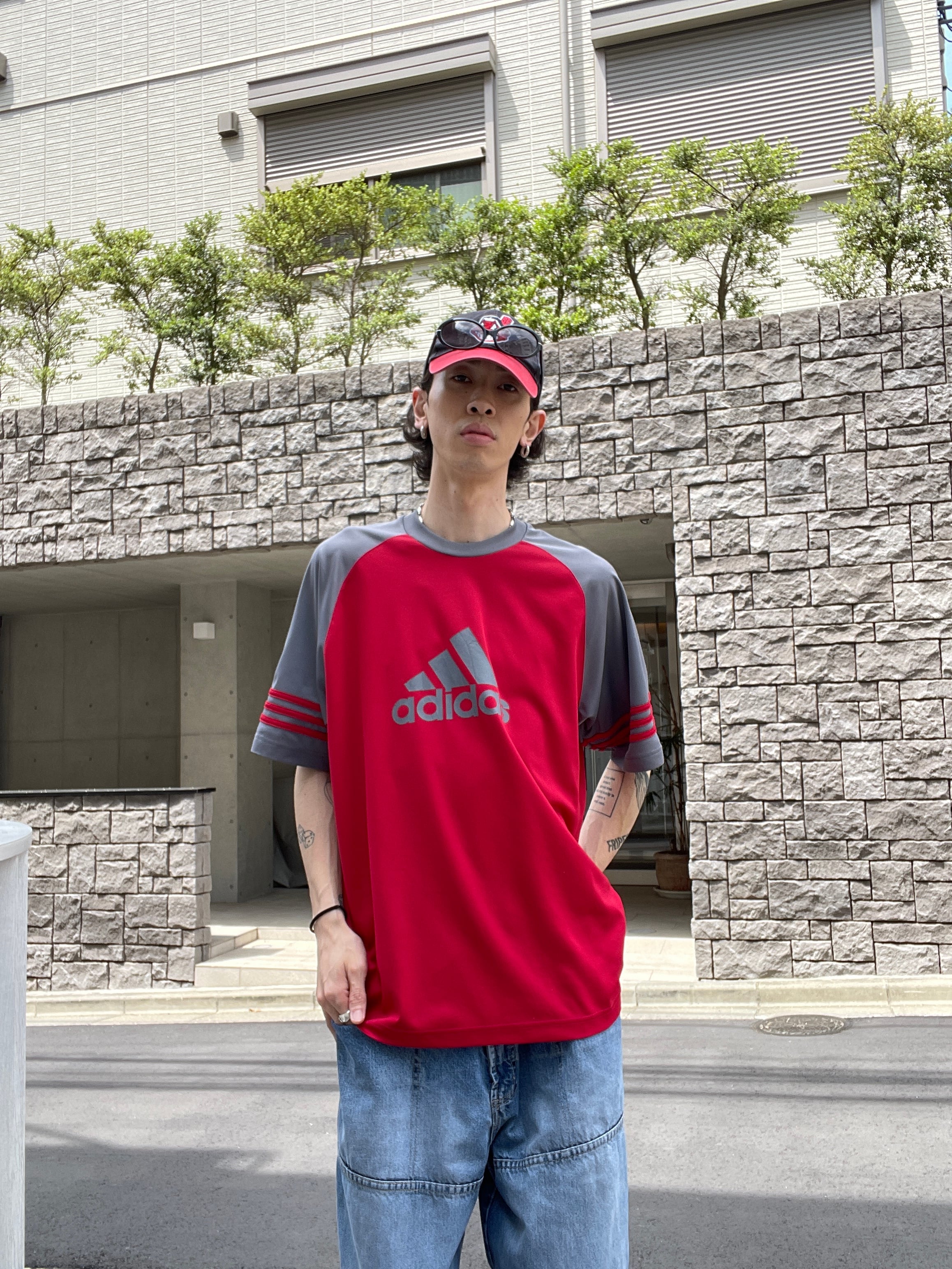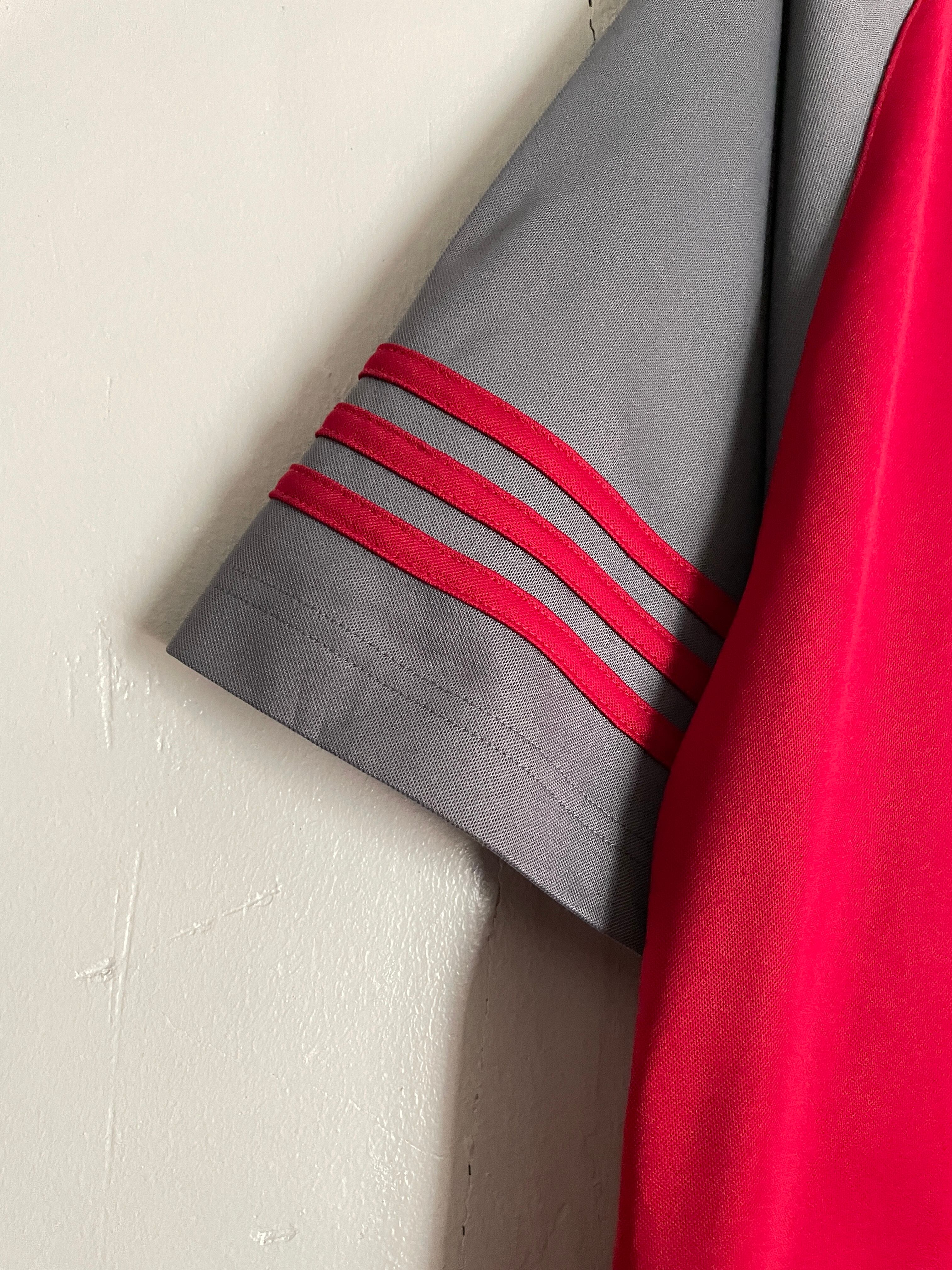深みのあるワインレッドに、グレーのラグラン袖が付いたアディダスのゲームシャツ。パフォーマンスロゴがフロントにプリントされており、袖には3ライン。背中にはスポンサーや背番号の付かないシンプルで使いやすいデザインです。サイズも大き過ぎず小さ過ぎない、丁度良い感じ。スラックスなどの綺麗めなボトムスと合わせるのも良さそうです。