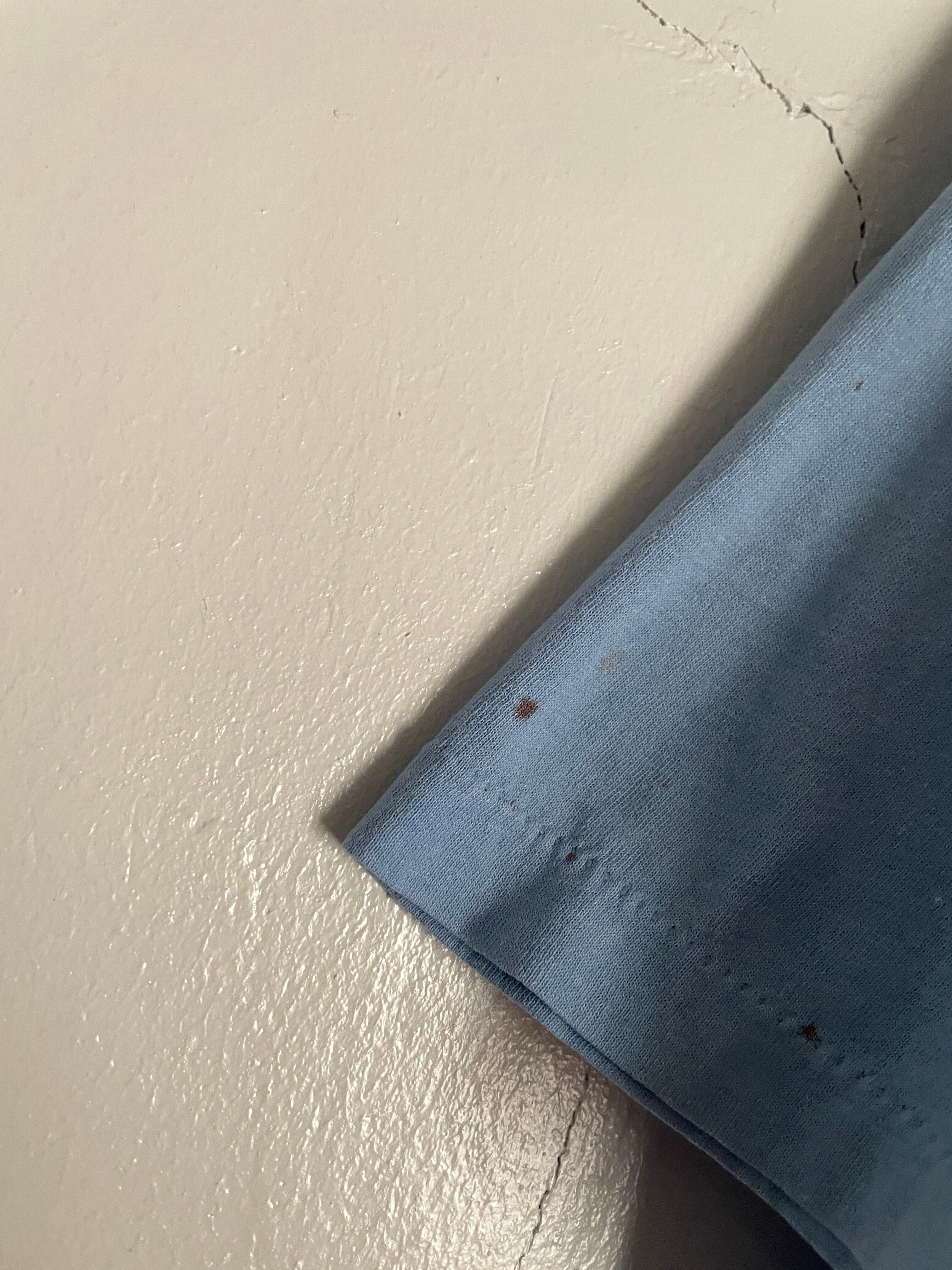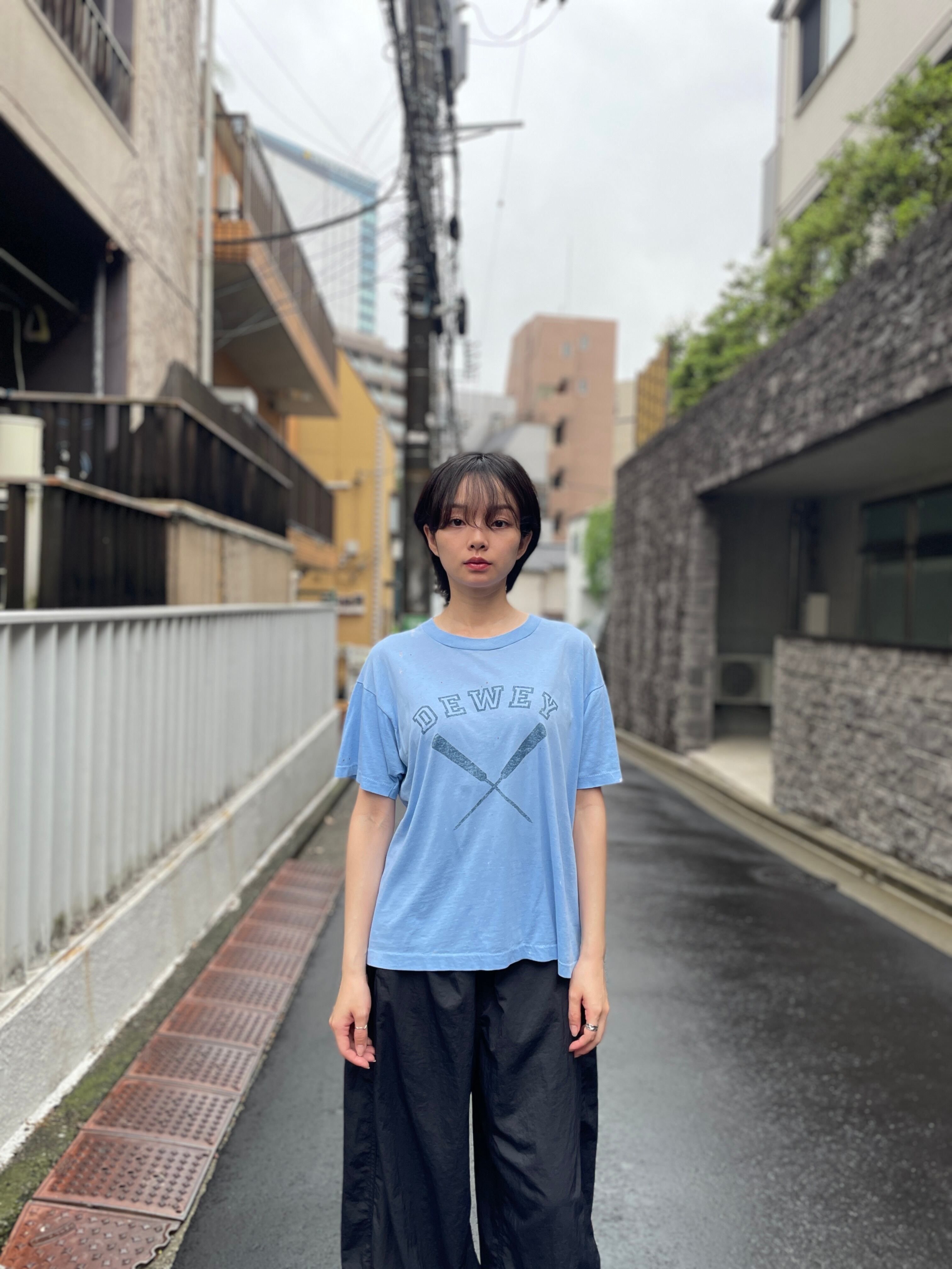 ライトブルーボディに、”DEWEY"とオールがプリントされたTシャツ、DEWEYとは主に、図書館学者”メアリー・アン・デューイ”や哲学者”ジョン・デューイ”を指す際に使われる名詞のようです。軽めのコットンポリ素材。短丈めなのに対して、身幅はたっぷりめの今っぽいシルエットになっています。シングルステッチでUSA製。所々に汚れが見られますが、それも込みで雰囲気ありの一着です。