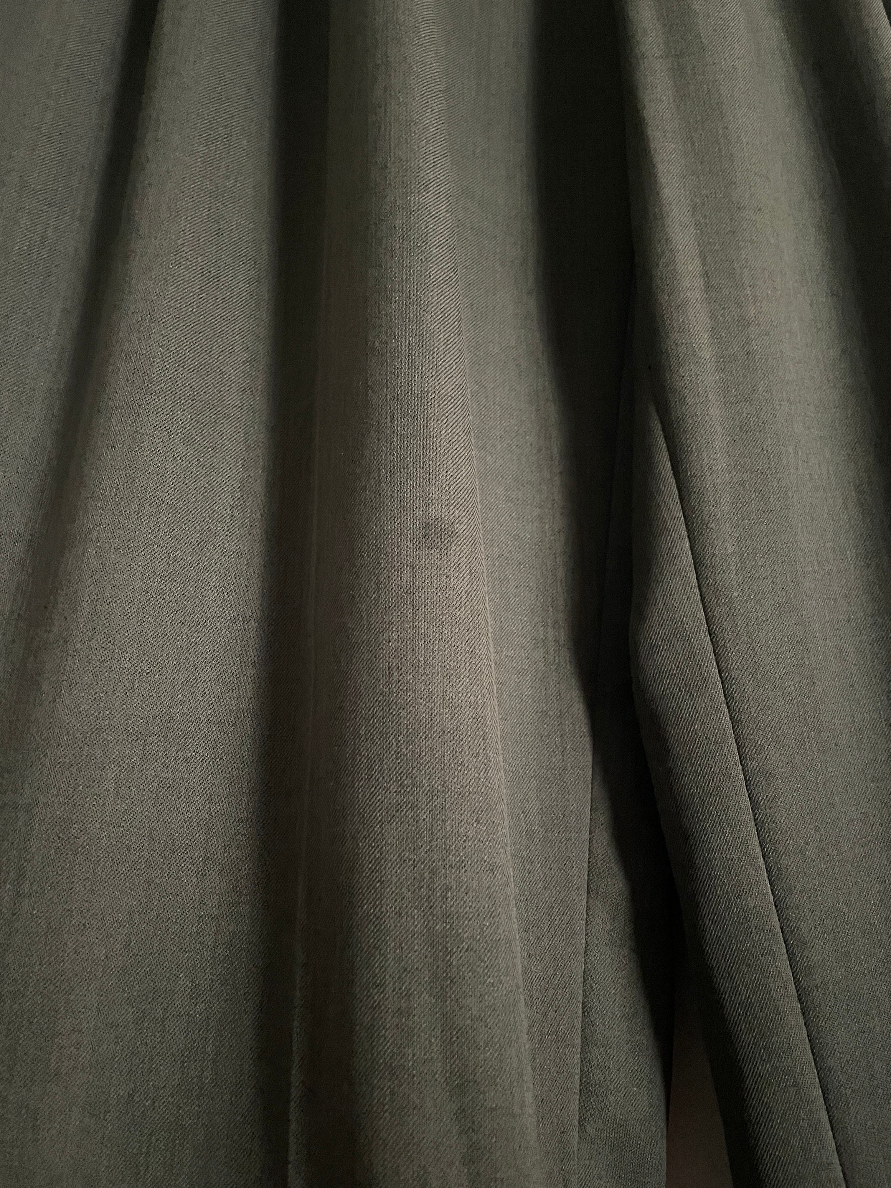 カーキに近いグレーカラーで、2タックの入った綺麗なワイドシルエットが魅力的なスラックス。サラッとしたポリとウールの混合素材。まさに今の時期にぴったりのスラックスです。様々なトップスとの相性が良く、一本は持っておきたいアイテムです。