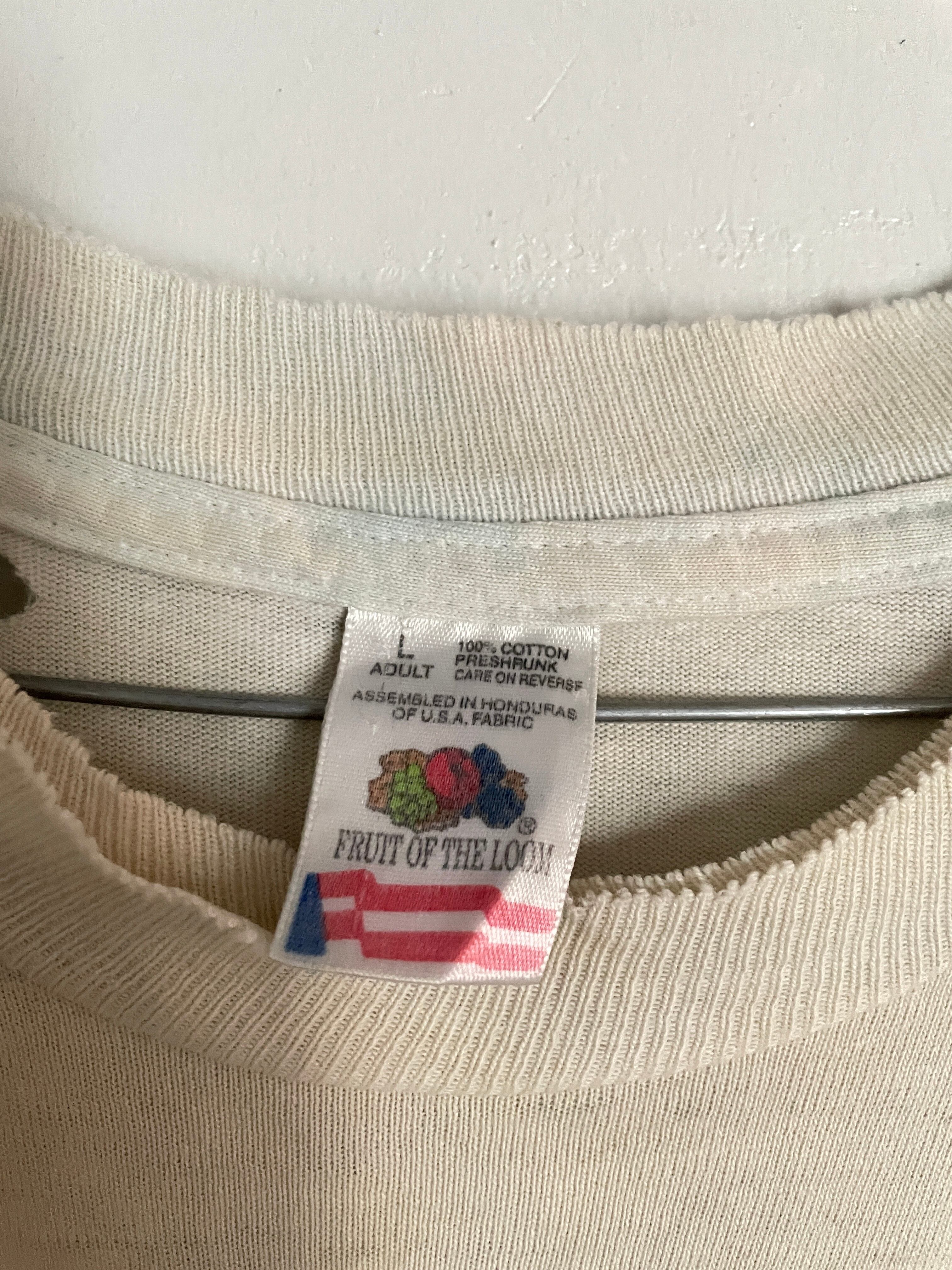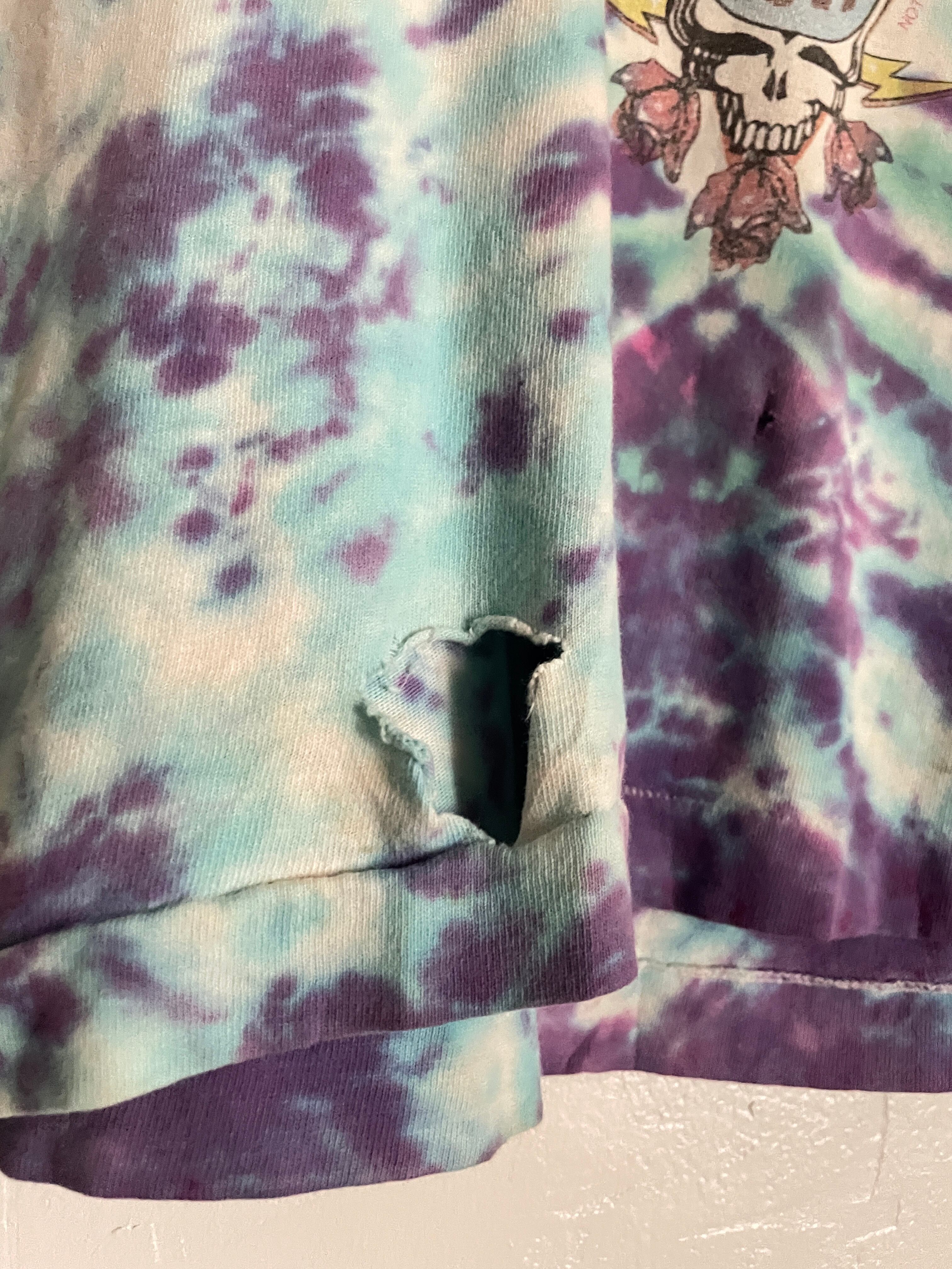 独特な色味のタイダイ柄ボディに、アメリカのロックバンド、”グレイトフル・デッド”の94年から95年に行われたウィンターツアーの両面プリントカットオフTシャツ。シンボルでのある骸骨がスキーをしている様子がプリントされています。USスキーチームとある為コラボか何かでしょうか。ボディ、プリント共にインパクト大のプリントになっています。袖部分は大胆にカットオフされています。あえて雑なのがグッドです。所々にダメージなどが見られますが、それも込みで雰囲気抜群の一着。コピーライト入りでシングルステッチ。もちろんUSA製です。間違い無くファッションの主役になってくれるアイテムです。