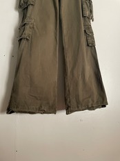 やや褪せたカーキカラーで、ポケットが豊富で、所々のリペアデザインやダメージからY2Kな雰囲気が感じられる、オールドネイビーのフレアカーゴパンツ。裾幅が大きく広がった綺麗なフレアシルエット。股上浅めのローライズ。サイドポケット、バックポケットから出ている紐のデザインもお洒落です。サラッとしたコットン素材なので、今の時期には活躍してくれる一本です。