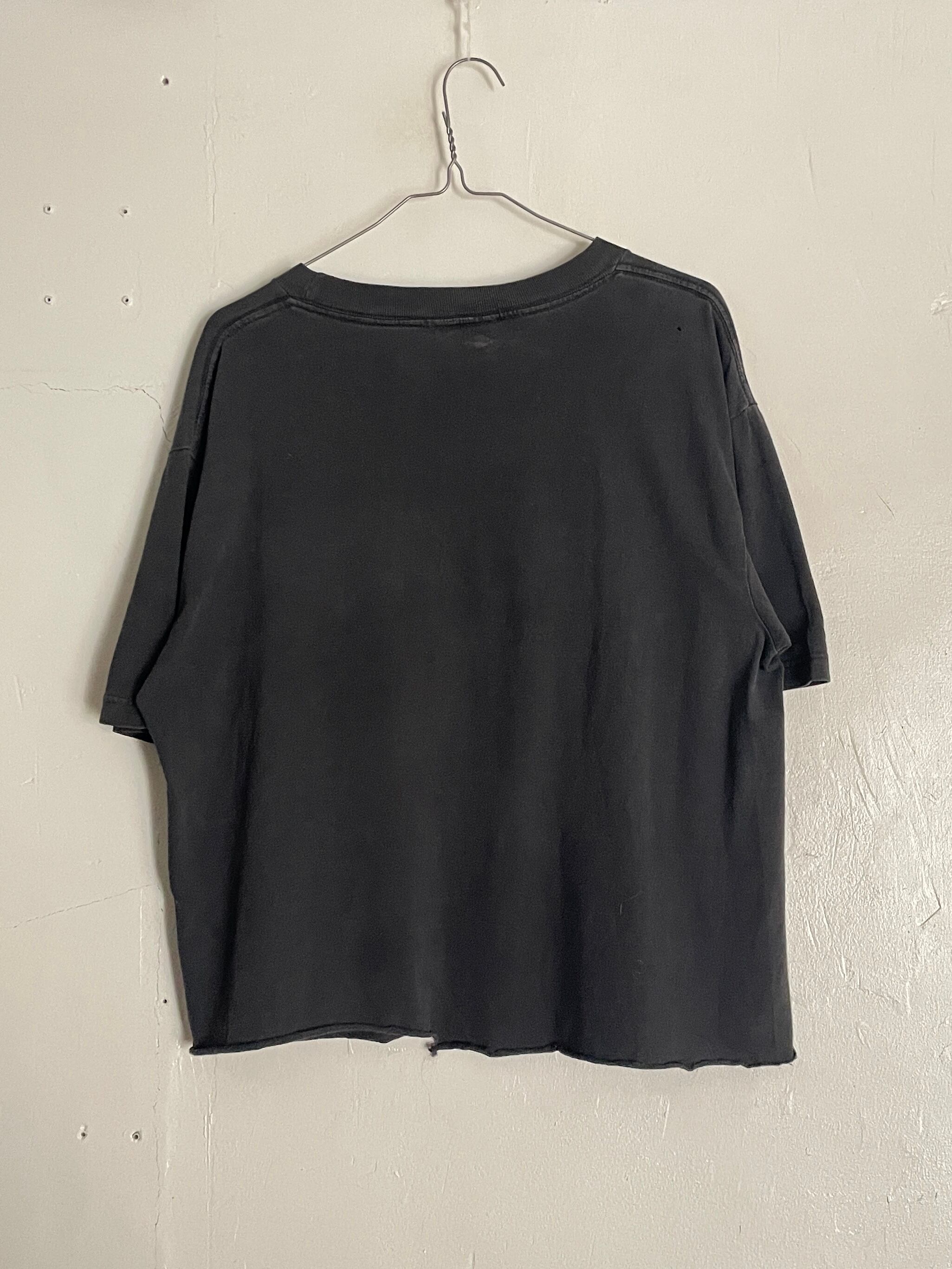 やや褪せたブラックボディに、配色の良いプリントが施されたTシャツ。コピーライトに”ノートン”とあって、調べてみると、サイバーセキュリティのソフトウェアを提供する企業のようです。プリントはコンピューター関連でしょうか。裾部分が大胆にカットオフされていて、今っぽい身幅広めの短丈シルエットに仕上がっています。USA製なのもポイントが高いです。女性の方はもちろん、男性の方にもおすすめしたいTシャツです。