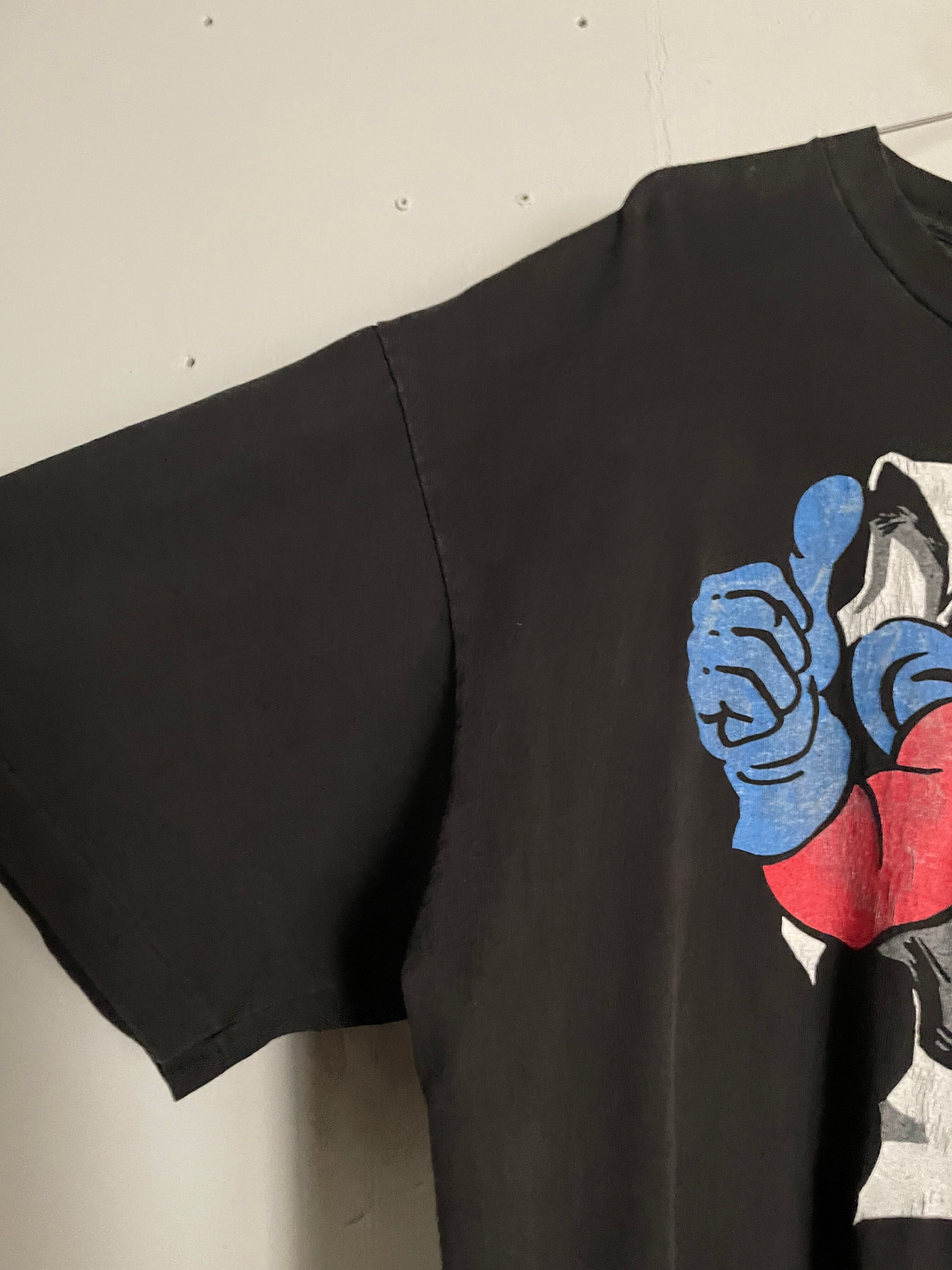 ビールで世界的に有名な”バドワイザー”のイメージキャラクター"バドマン”がプリントされたTシャツ。やや褪せたブラックボディに、ひび割れしたコミカルなバッドマンがかなりシュールです。笑 こういった遊び心が感じられるプリントTは着ていて楽しいですよね。91年のコピーライト入りで、USA製。サイズもXLとゆったりめ。夏には1枚で着たいアイテムです。