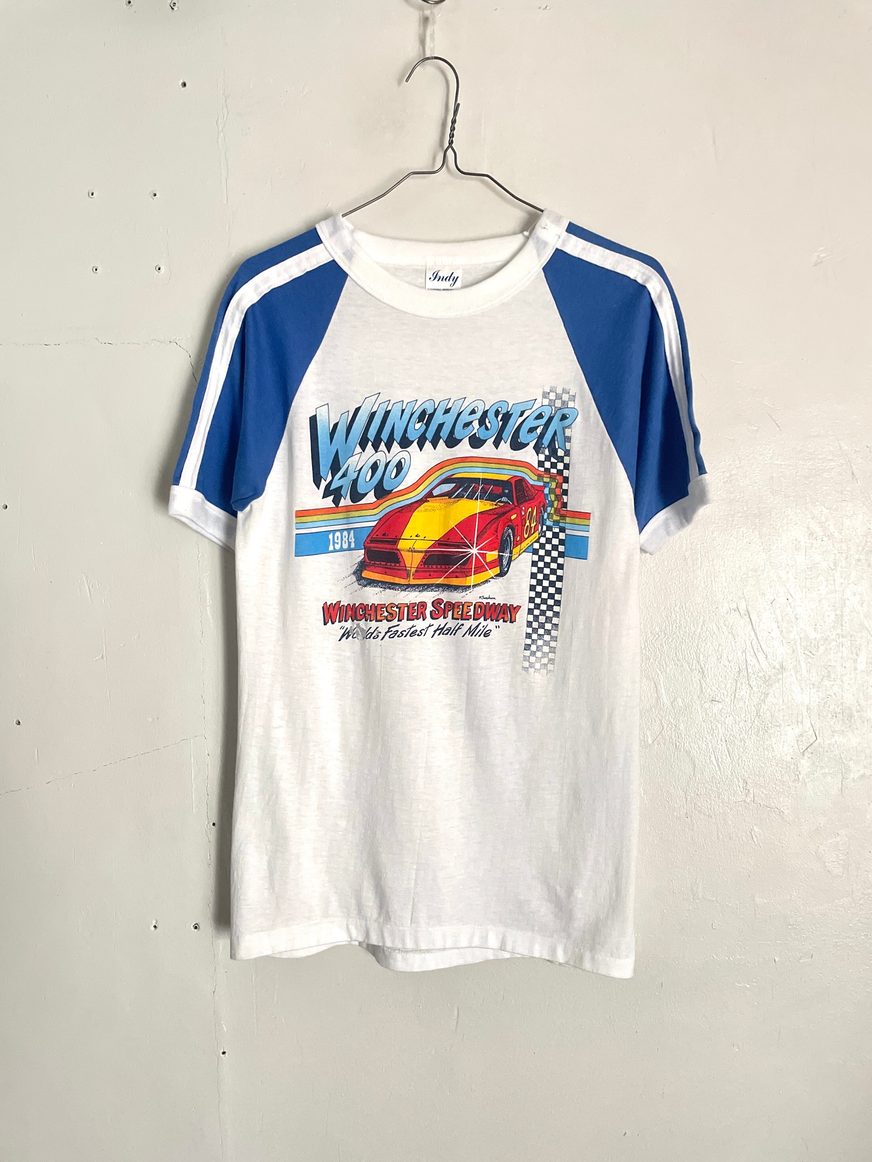 白ボディに青のラグラン袖、ネックと袖口には白のリブが付いたラグランT。カーレースの両面プリントが施されています。80年代頃のアイテムで、この時代特有の身幅狭めでやや縦長、全体的にタイトめなシルエットです。古着ならではの雰囲気を感じられる一枚。フロント部分にダメージが見られます。