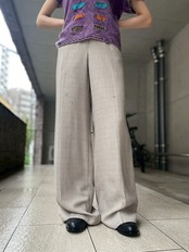 素材の織りによってうっすらとチェック柄が表現されたワイドスラックス。ややゆったり目の腰回りから裾に向かってまっすぐ落ちる非常に綺麗なシルエットです。ウエスト部分にベルト切り替えがないためスッキリした印象。膝辺りまで裏地も付いているので履き心地が良いです。ベルトループが広めなのでいろんなベルトで遊べそう。ポケットは付いていません。