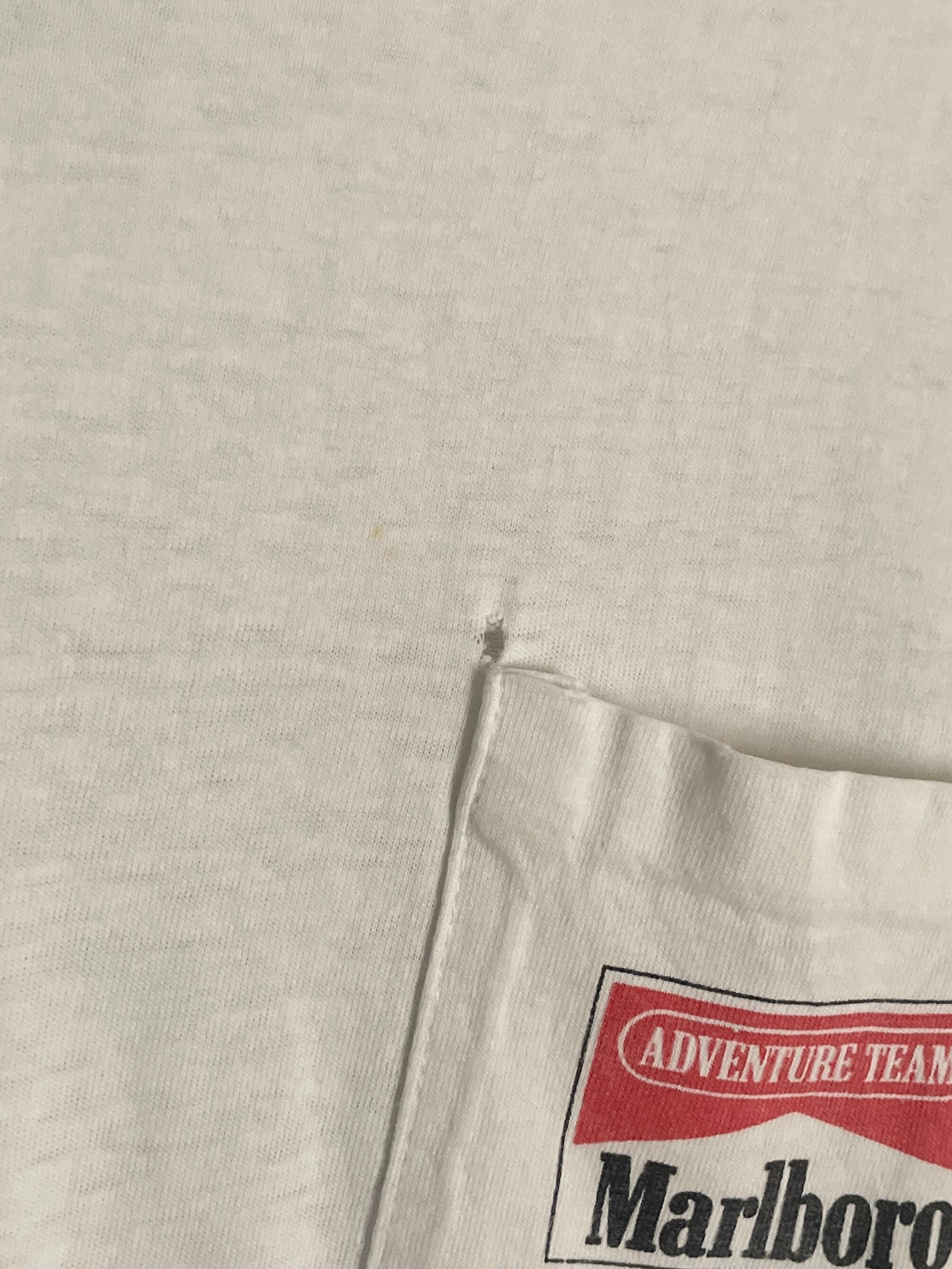 大胆に袖がカットオフされた、マルボロのポケットノースリーブT。ちょっと雑めにざっくりと袖か切り落とされていて、いかにも古着っぽい雰囲気です。前はシンプル目なワンポイントロゴ、背中にはマップとトカゲ、ロゴコンパスが大きめにプリントされています。裾はシングルステッチのためボディは90年代、マルボロタグが付いたオフィシャルアイテムです。