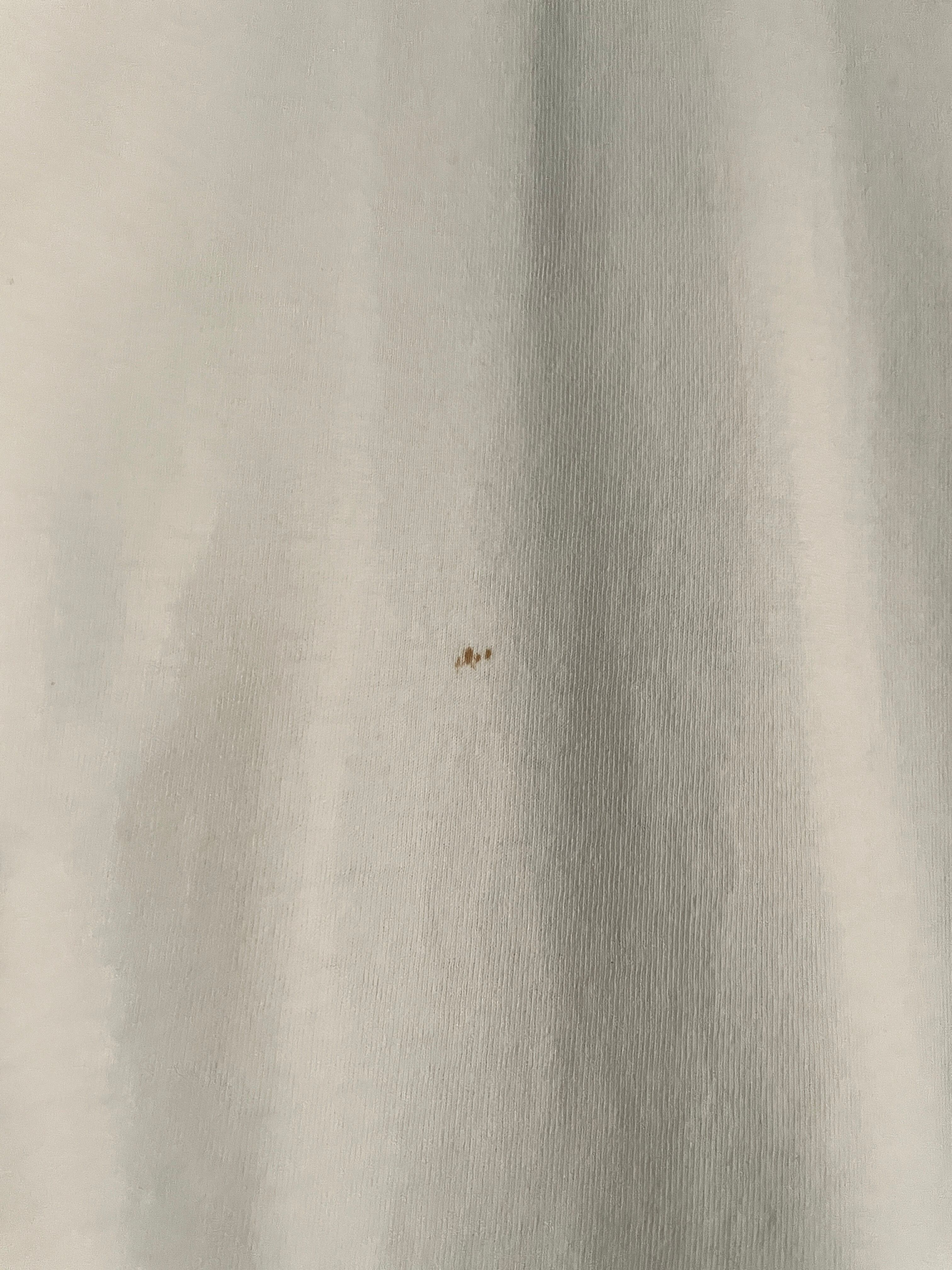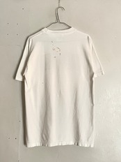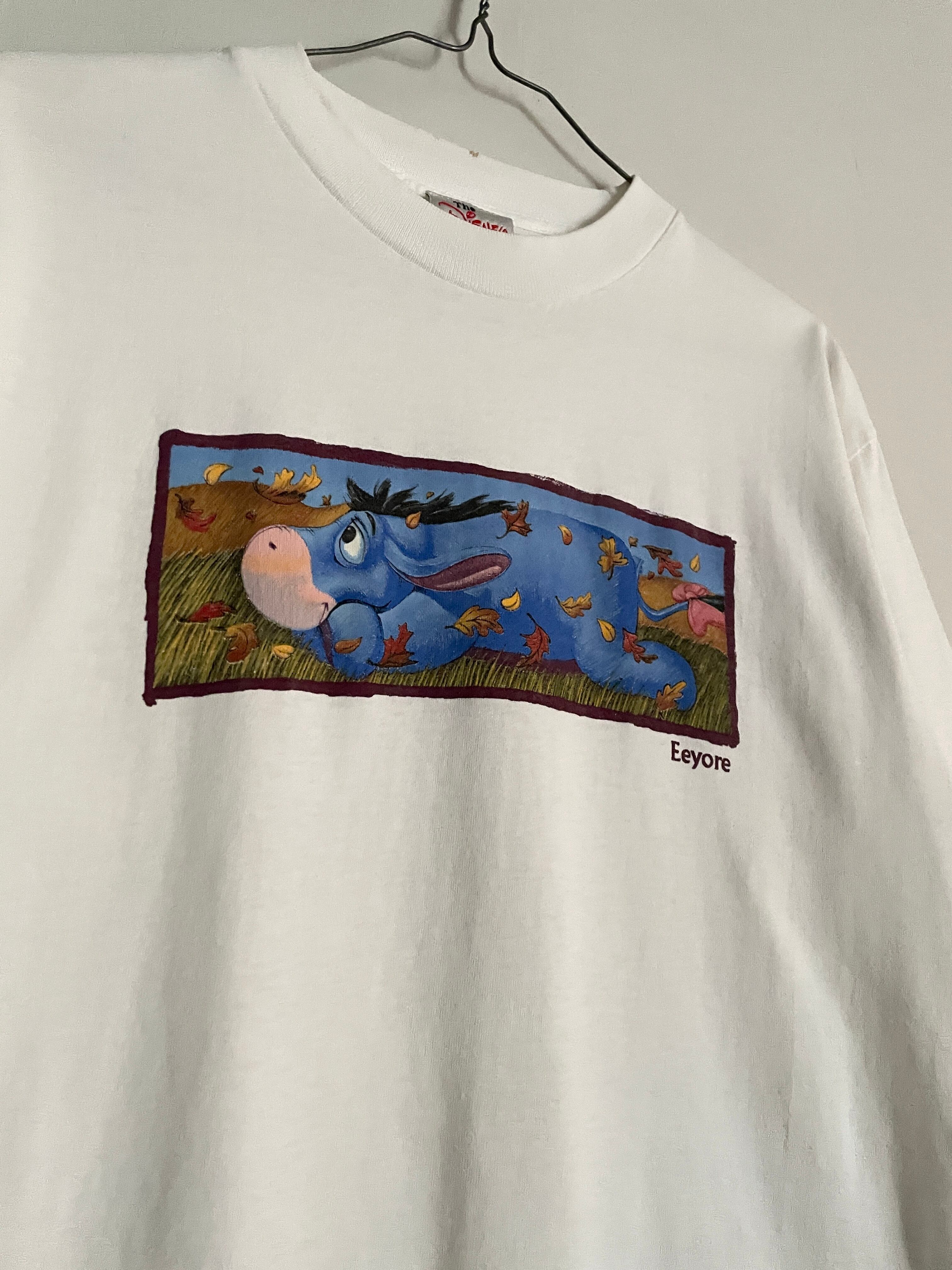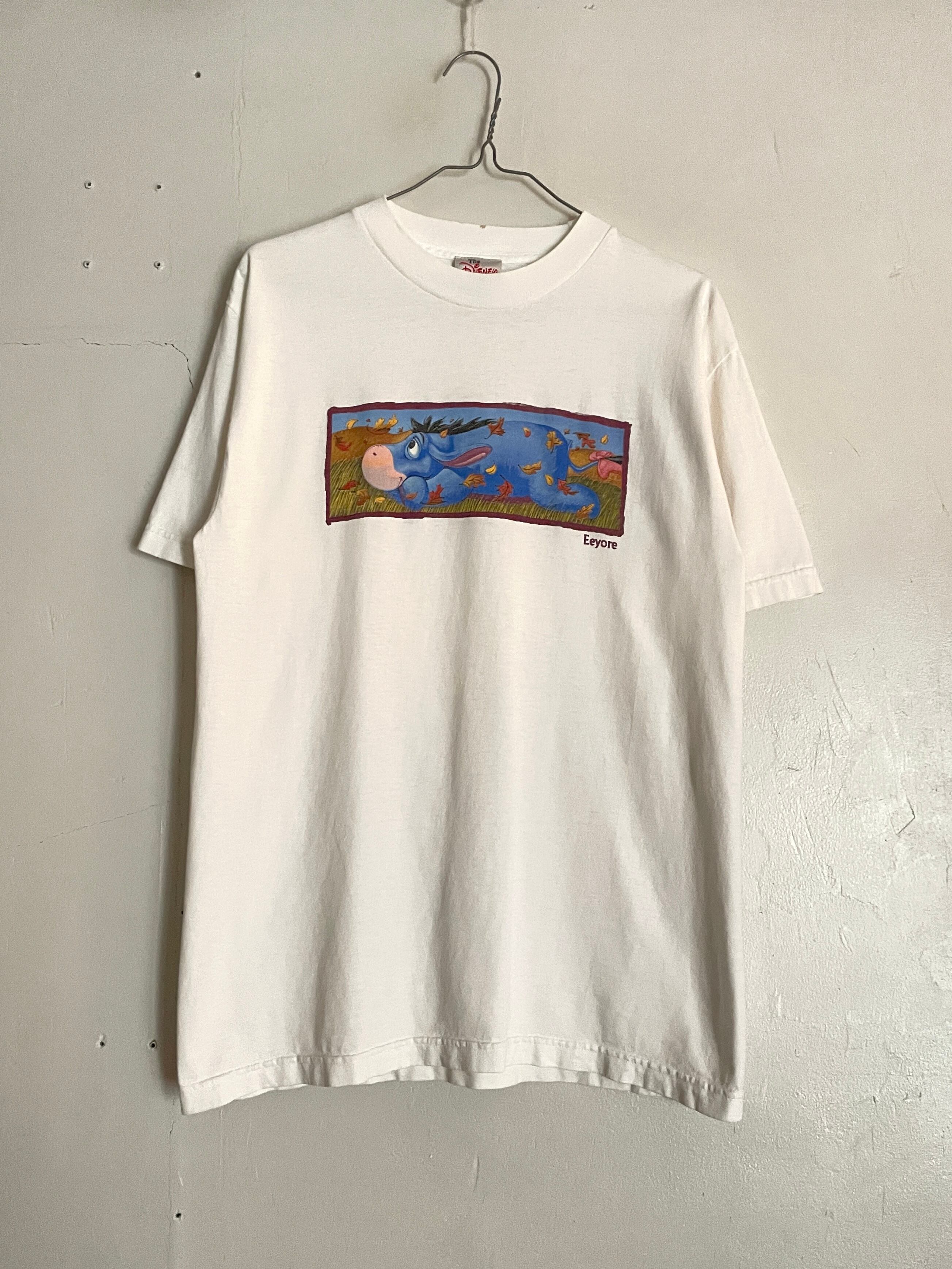 ホワイトボディに、ディズニーキャラクターの”イーヨー”がうつ伏せになっている様子がプリントされたTシャツ。コンパクトめな横長プリントです。可愛らしさもあり、シュール感もあるデザインがグッドです。大き過ぎず、小さ過ぎない程良いサイズ感。男女共におすすめしたい1着です。USA製なのも魅力的です。バック部分に汚れが見られます。