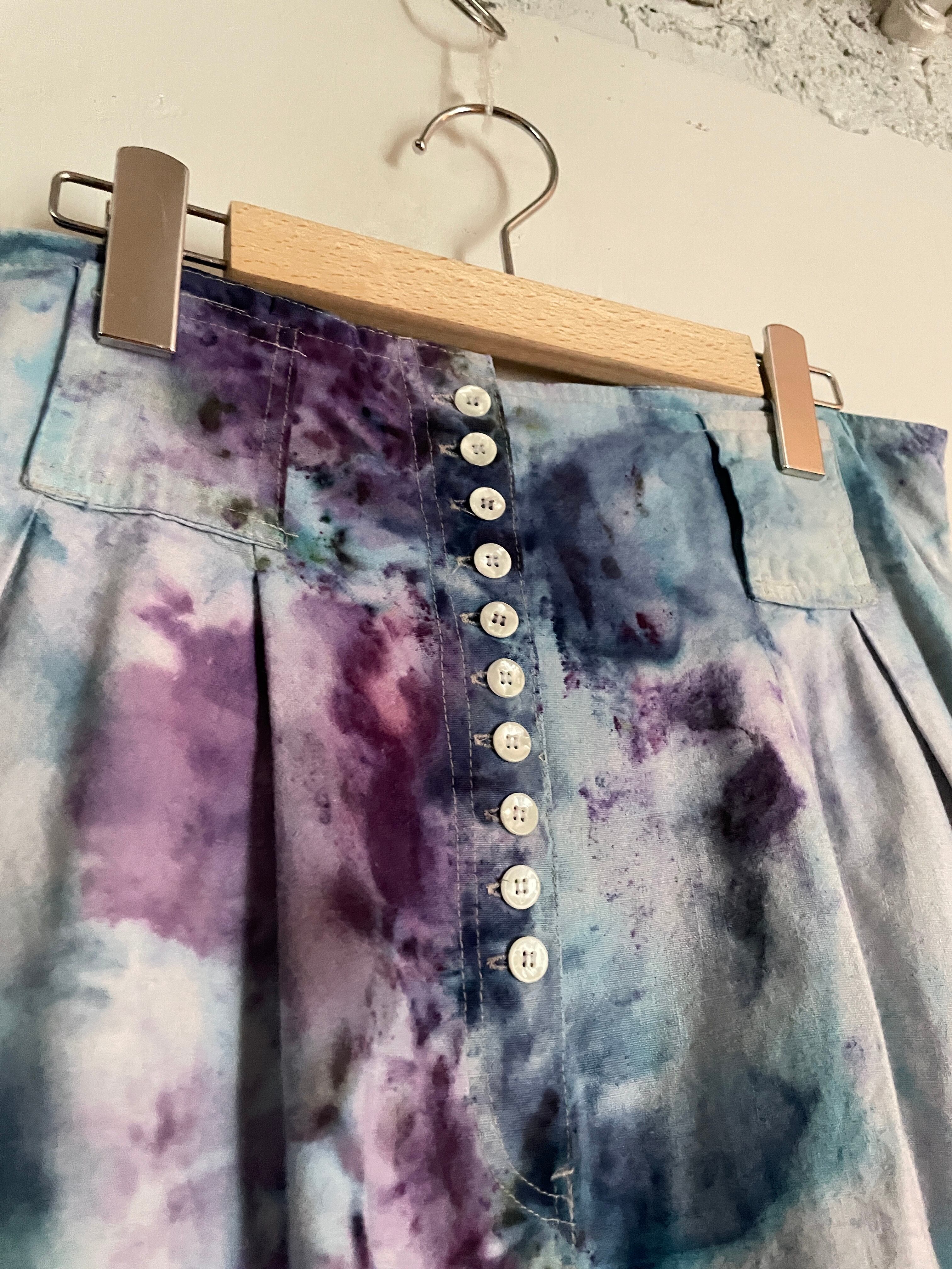 派手さのあるタイダイ柄で、ラミーとコットン素材のしっかりとした生地感が魅力的なショーツ。ツッコミどころ満載の一本です。なんと言ってもボタンの多さに目がいきます。こういったショーツには珍しい2タック入り。デザイン性に優れたショーツです。ワイドストレートシルエットで、今の時期にはファッションのメインを張ってくれるアイテムです。
