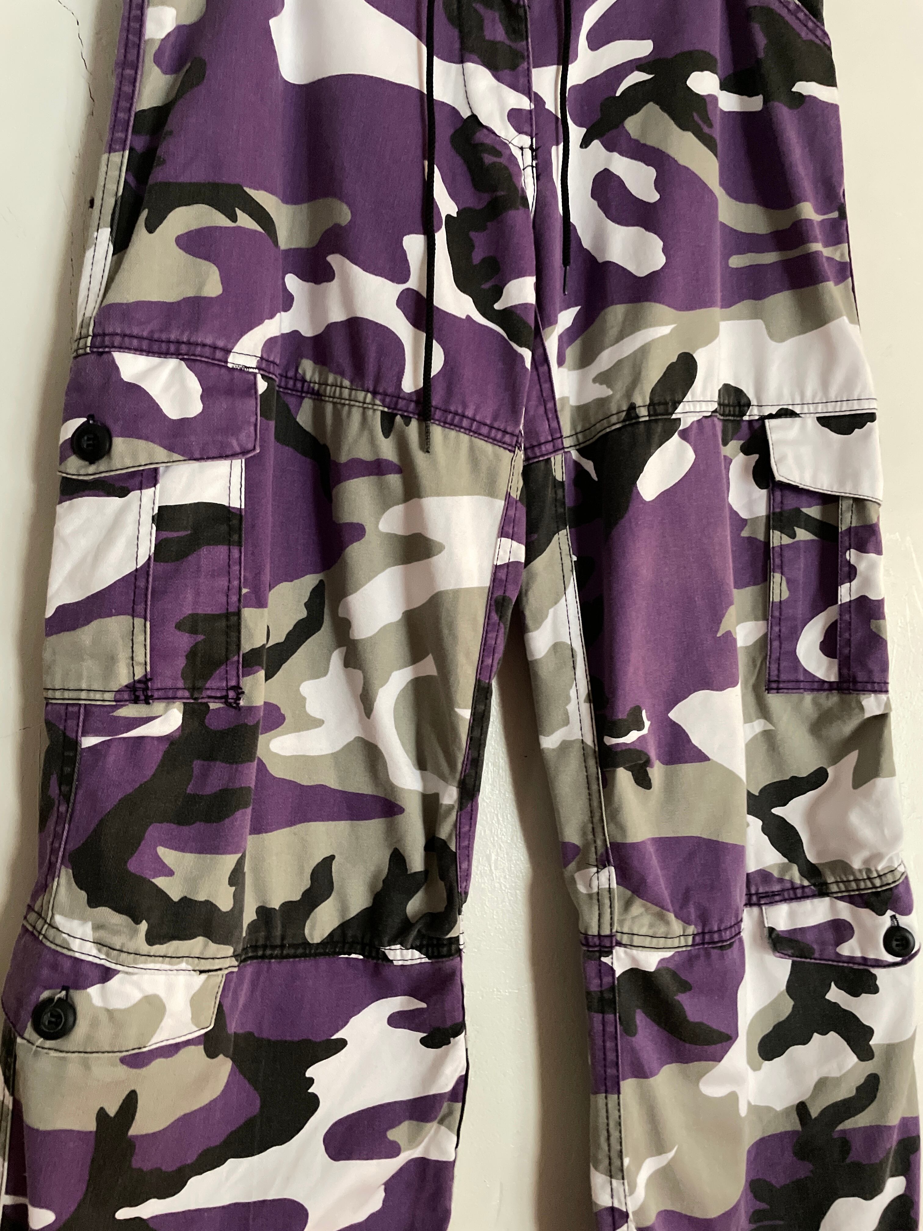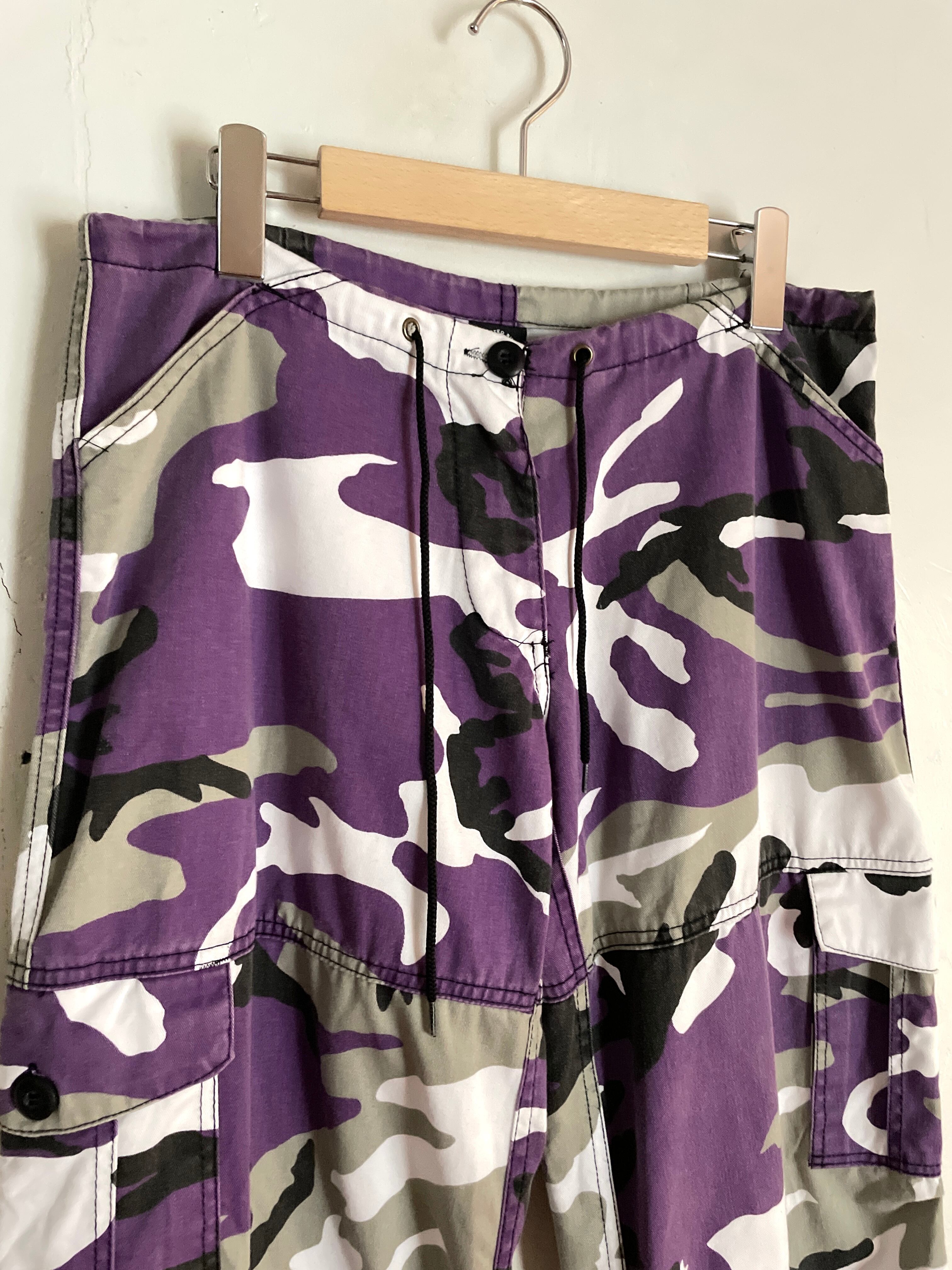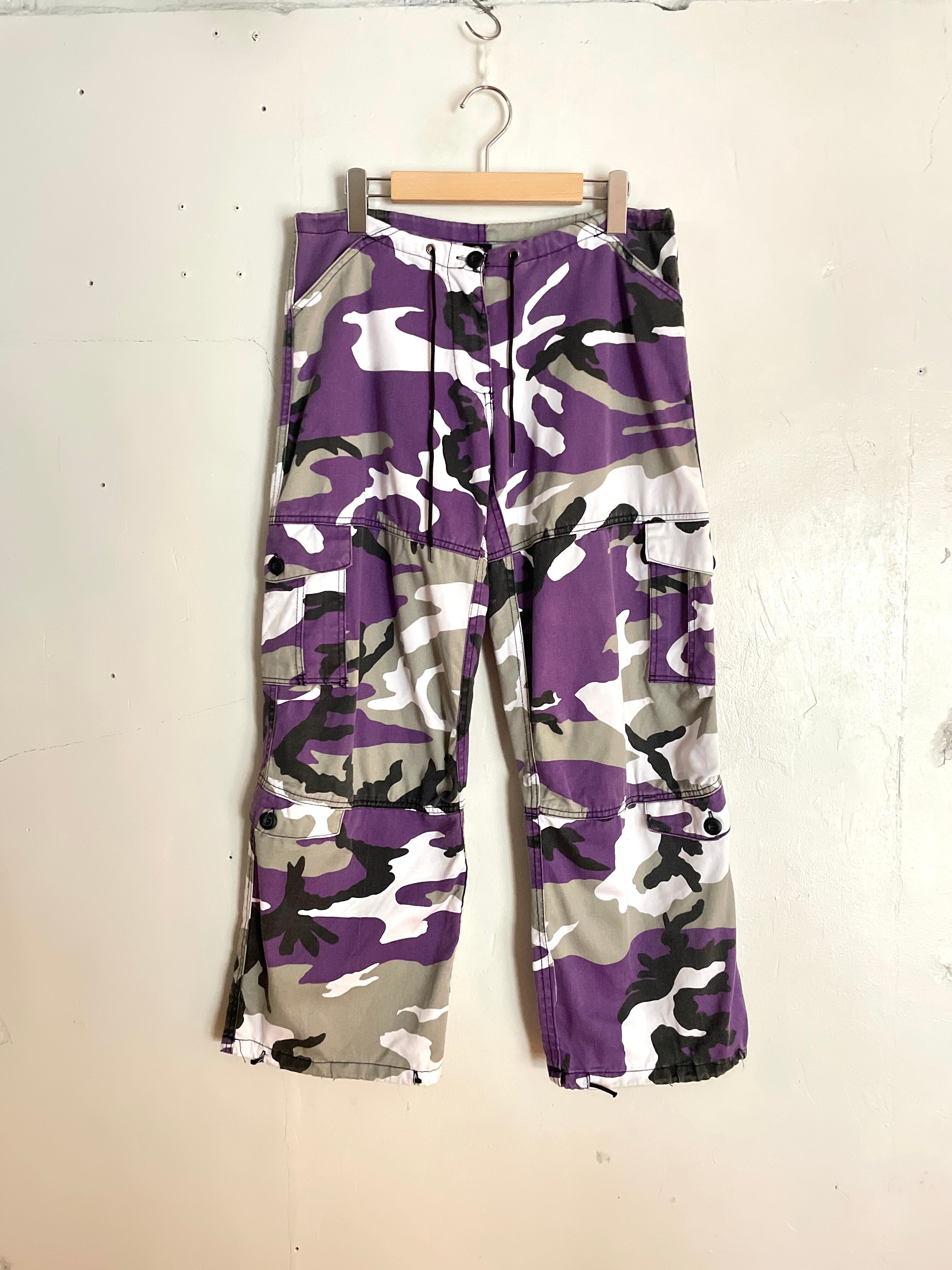 紫をメインとしたウッドランドカモ柄が特徴の、アーミーカーゴパンツ。太もも辺りのサイドポケットのプラスして、その下にもサイドポケットがついています。股上浅めのややローライズ、ウエスト部分にはドローコードが入っているため幅広いサイズに対応。コーディネートにいいアクセントを与えてくれそうです。