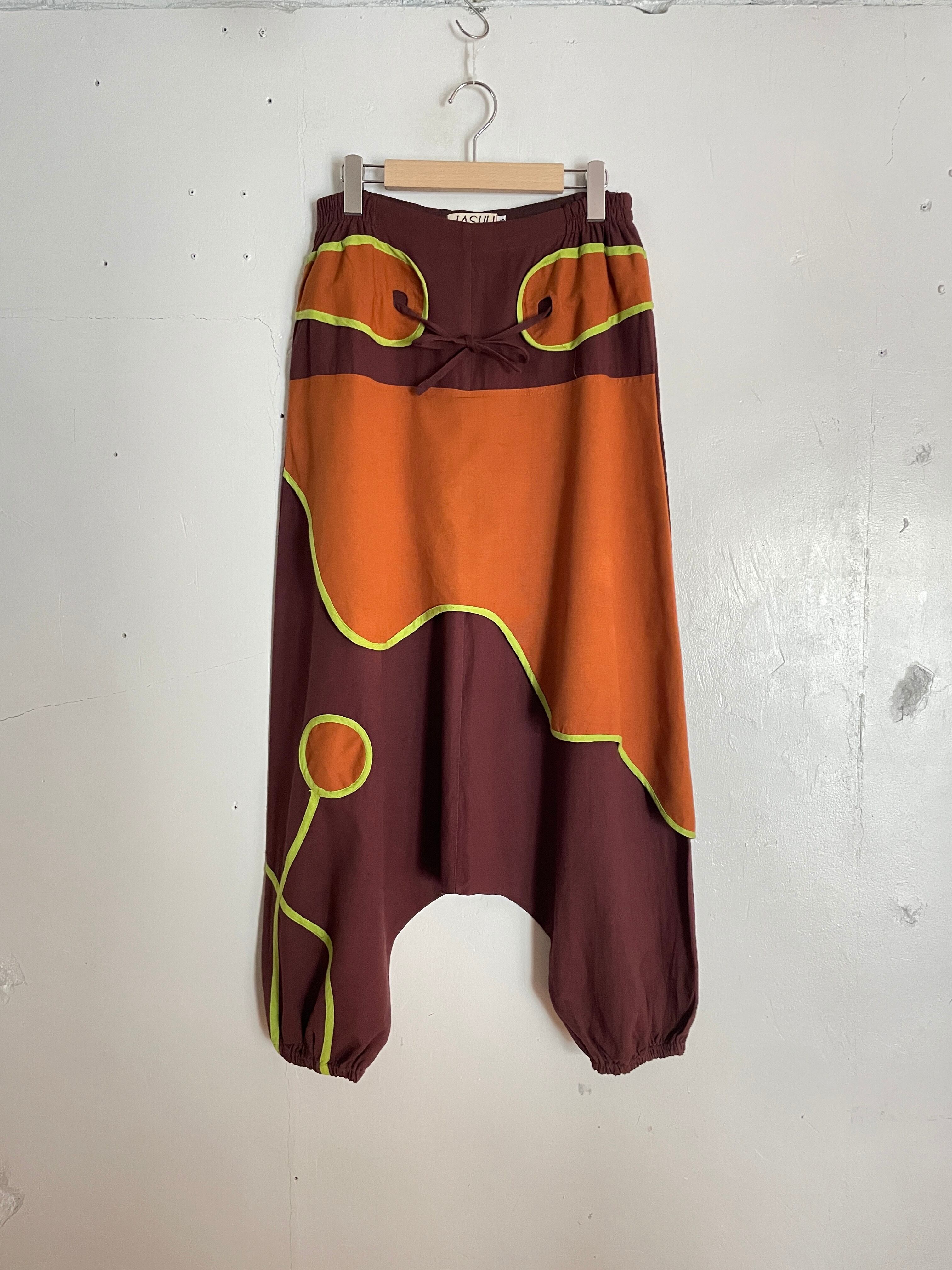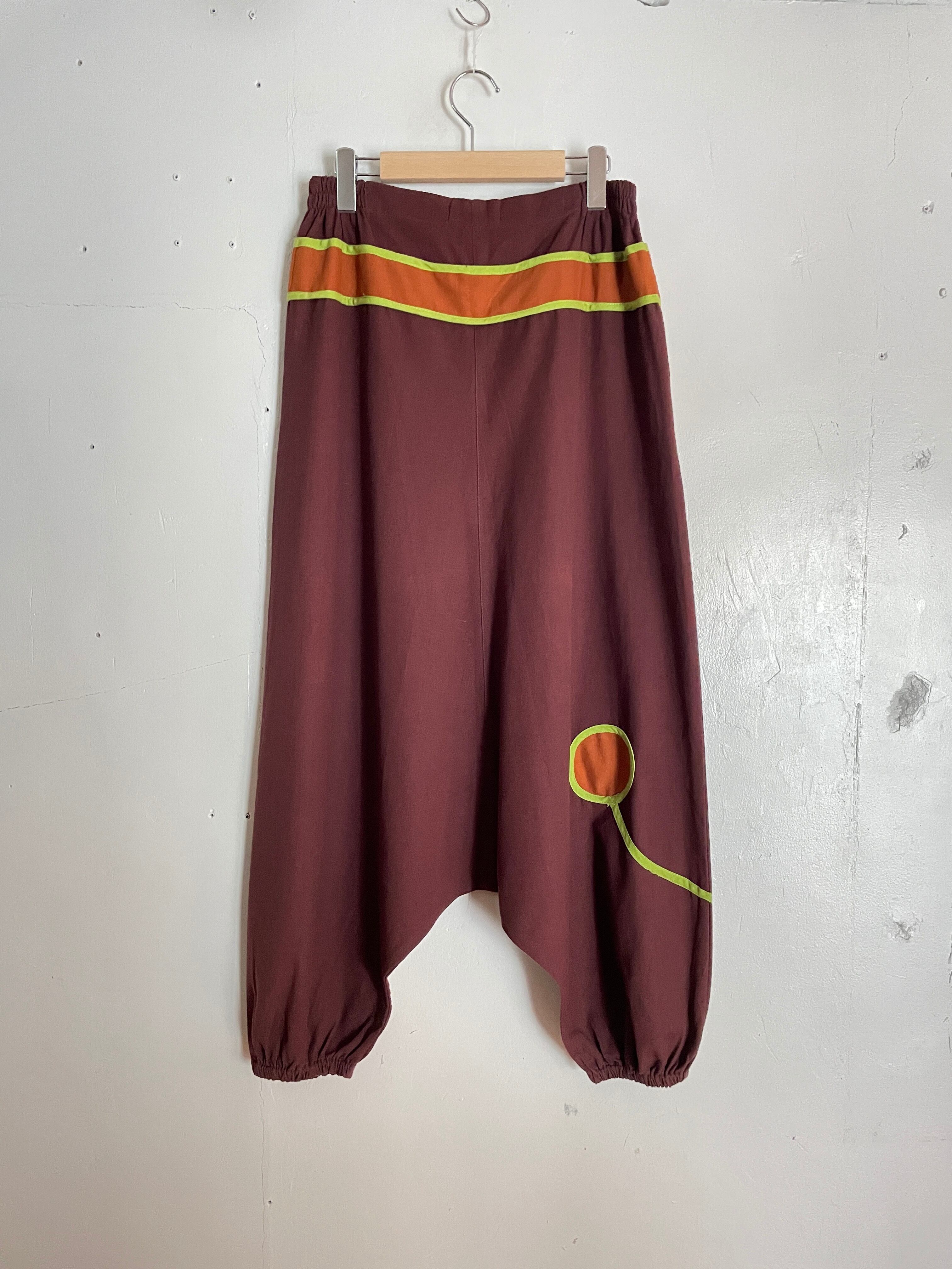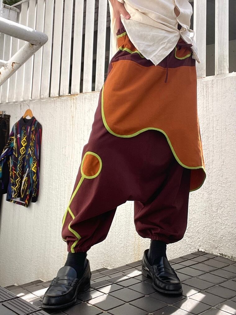 民族調の雰囲気で、深ーい股上が特徴のサルエルパンツ。部分的に縫い付けられた当て布や、裾にゴムが入っていることで生まれる独特のシルエットが個性的な一本です。ウエスト部分にはドローコードが入っていたり、両脇にゴムが入っていることで幅広いサイズに対応。着心地も非常に楽です。