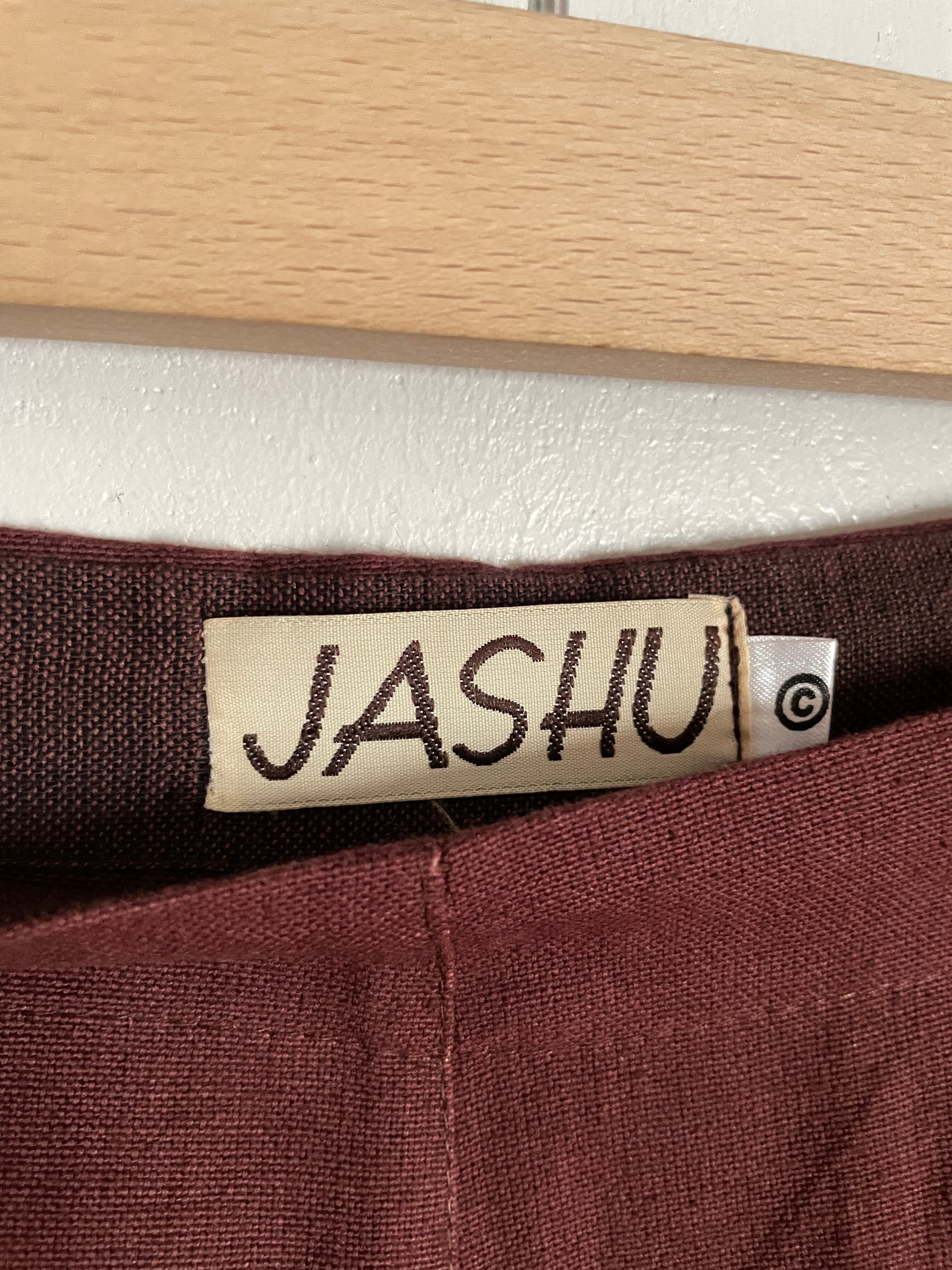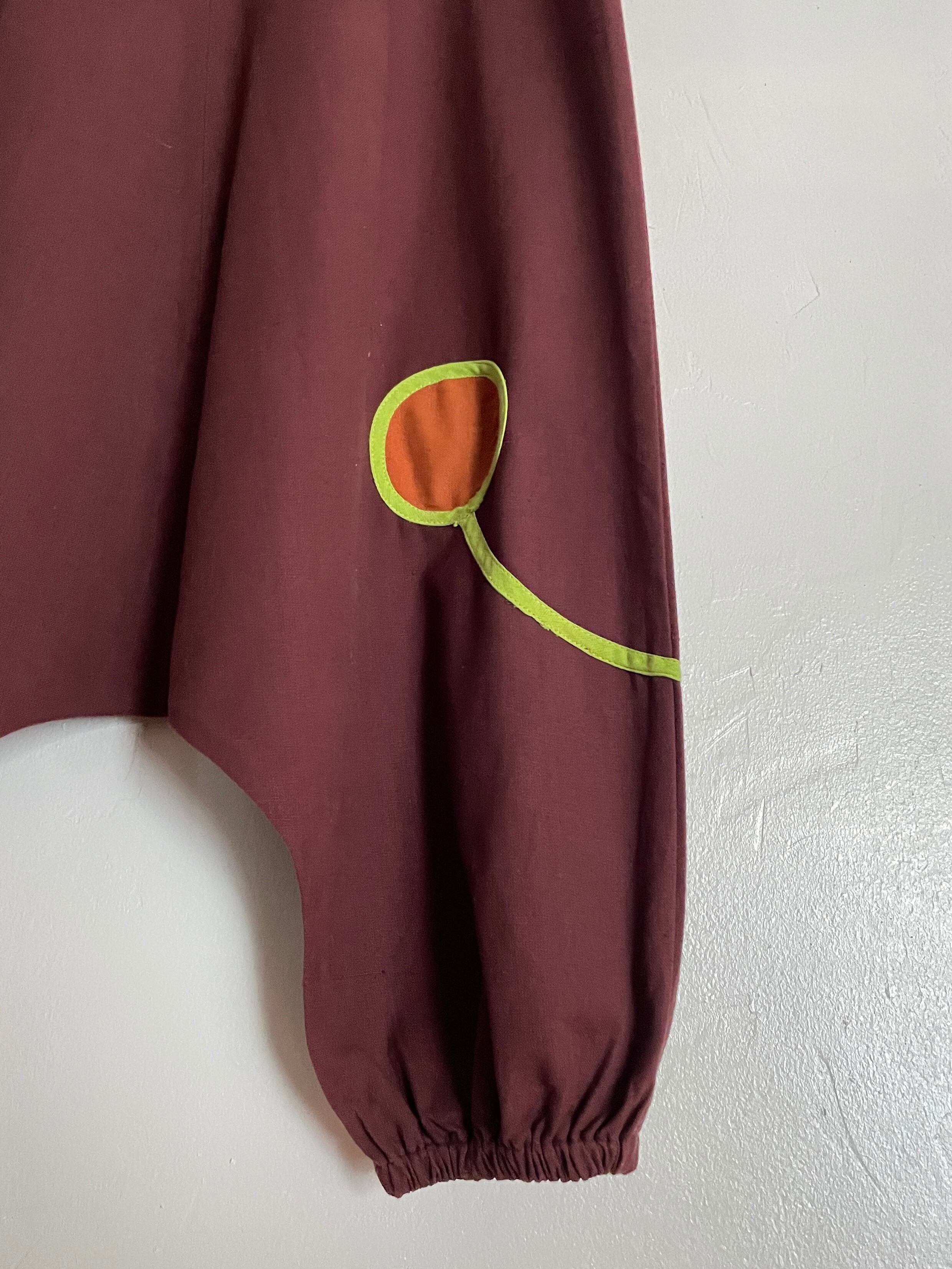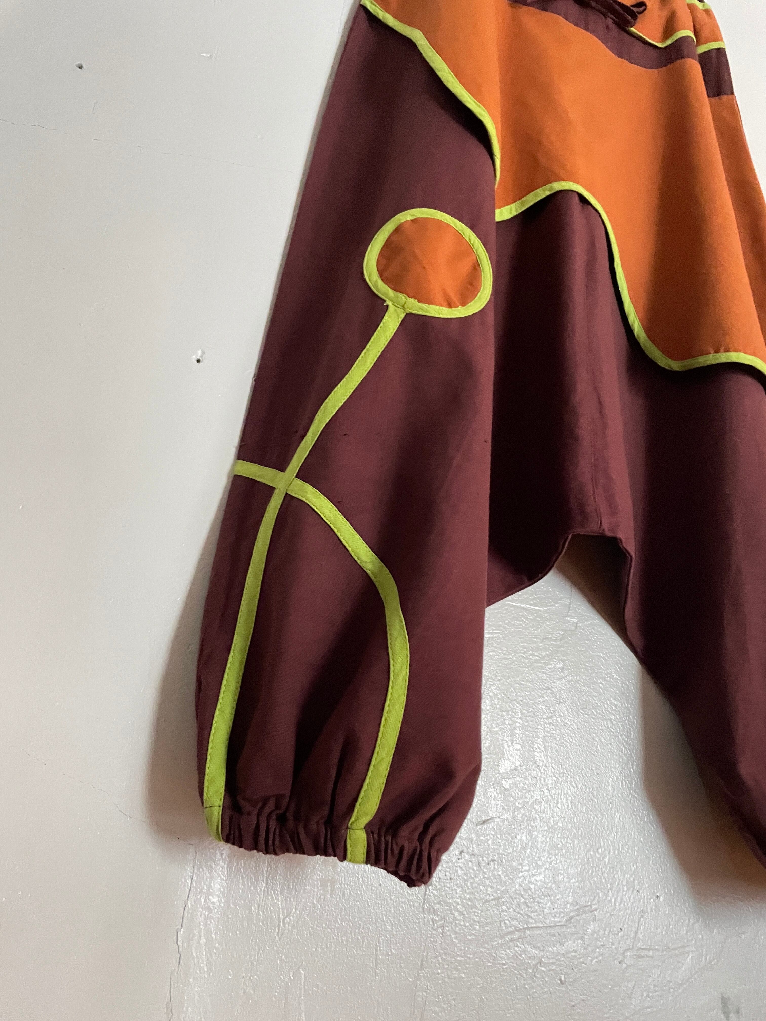 民族調の雰囲気で、深ーい股上が特徴のサルエルパンツ。部分的に縫い付けられた当て布や、裾にゴムが入っていることで生まれる独特のシルエットが個性的な一本です。ウエスト部分にはドローコードが入っていたり、両脇にゴムが入っていることで幅広いサイズに対応。着心地も非常に楽です。
