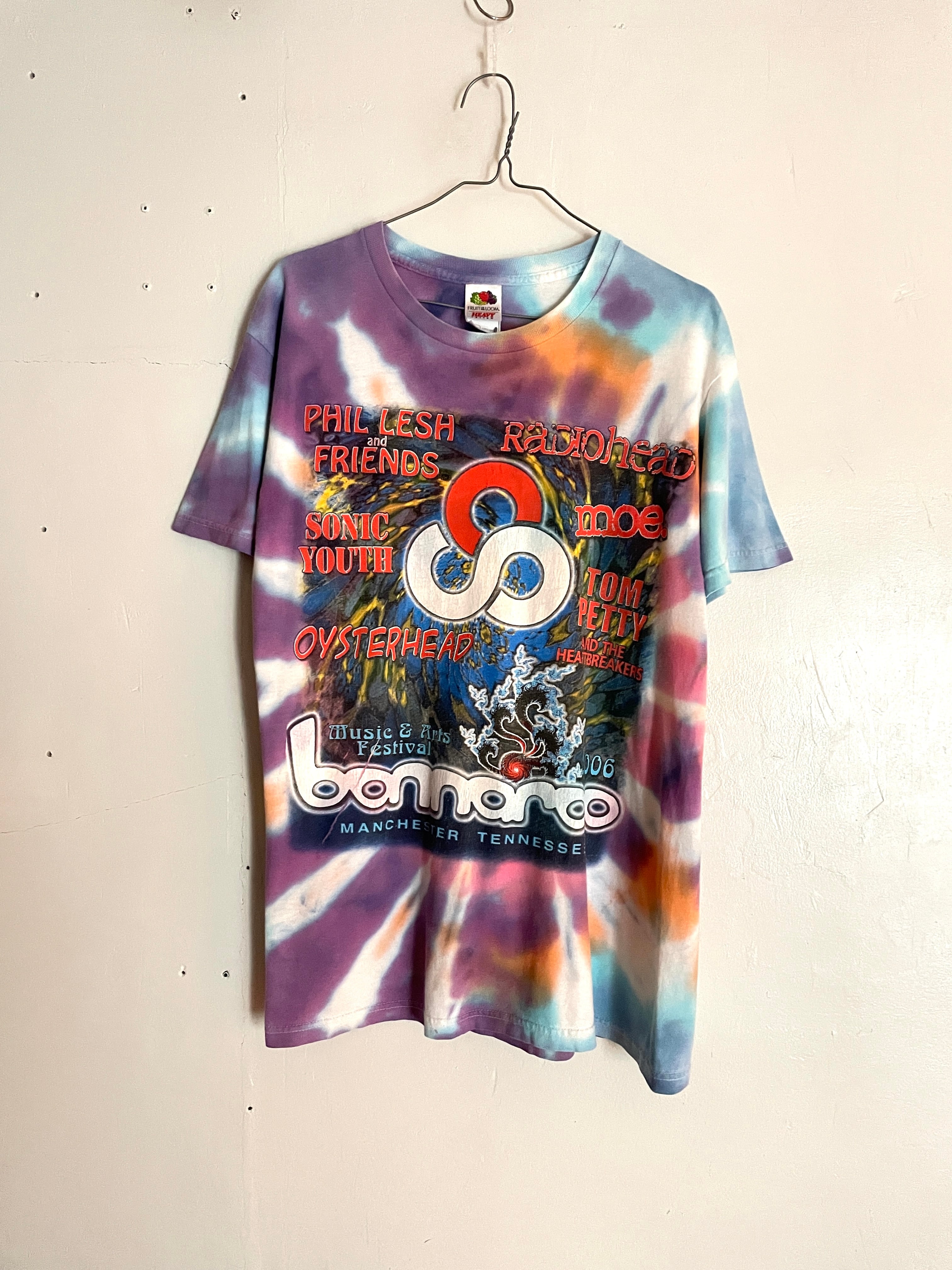 アメリカ・テネシー州にて毎年行われるミュージック・フェス「ボナルー・ミュージック・アンド・アーツ・フェスティバル」の両面プリントTシャツ。こちらは2006年に開催された時のもので、タイダイボディに様々なアーティストのネームがプリントされています。顔ぶれを見てみると、ロックにカントリー、ヒップ・ホップと様々なジャンルのアーティストが集まっていることがわかります。お洒落着としてはもちろん、これを着て今年の音楽フェスに参戦するのもありかもしれません。