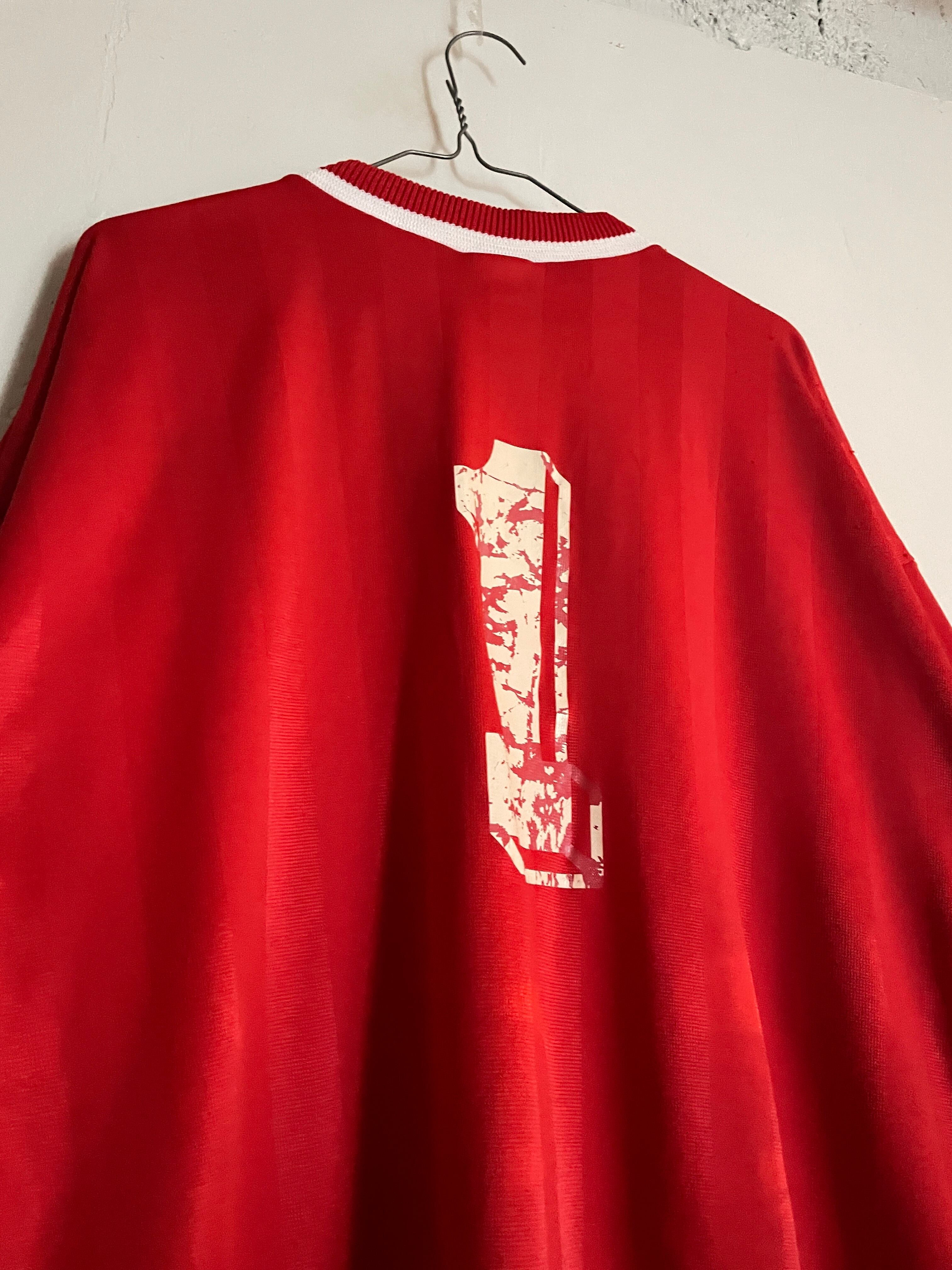 光沢のあるレッドボディに、アンブロのデカロゴがプリントされたゲームシャツ。デカロゴには細かくラインが施された珍しいデザイン。フロント部分にはアンブロロゴとテキサス州・ローゼンバーグのスポーツ同好会のプリントロゴ。背番号は1番で、掠れたプリントが古着らしくてグッドです。程良い丈感に対して、たっぷりめな身幅。通気性も良く、今っぽいシルエットで着られる一着です。しっかりとUSA製なのもポイントが高いです。
