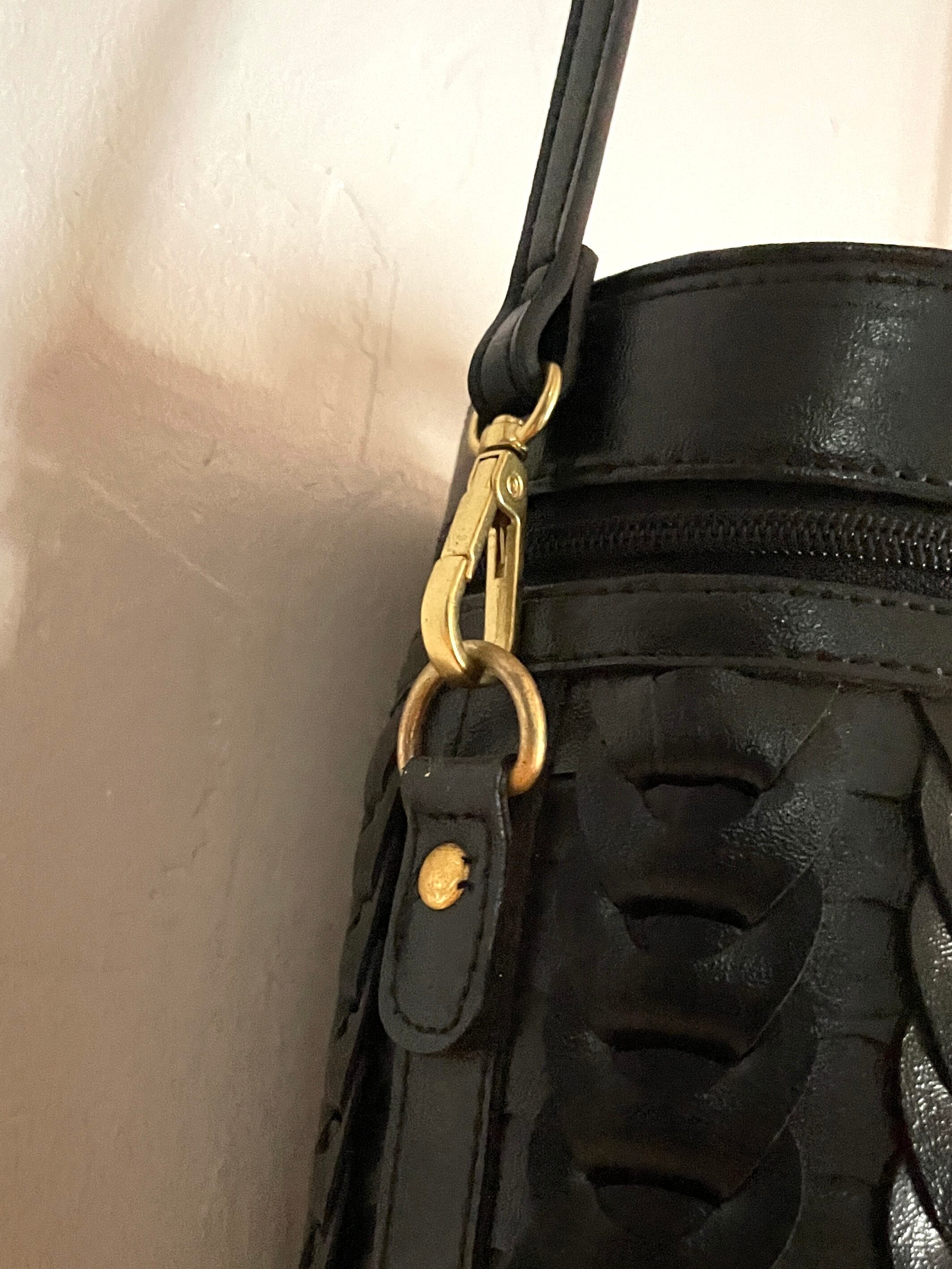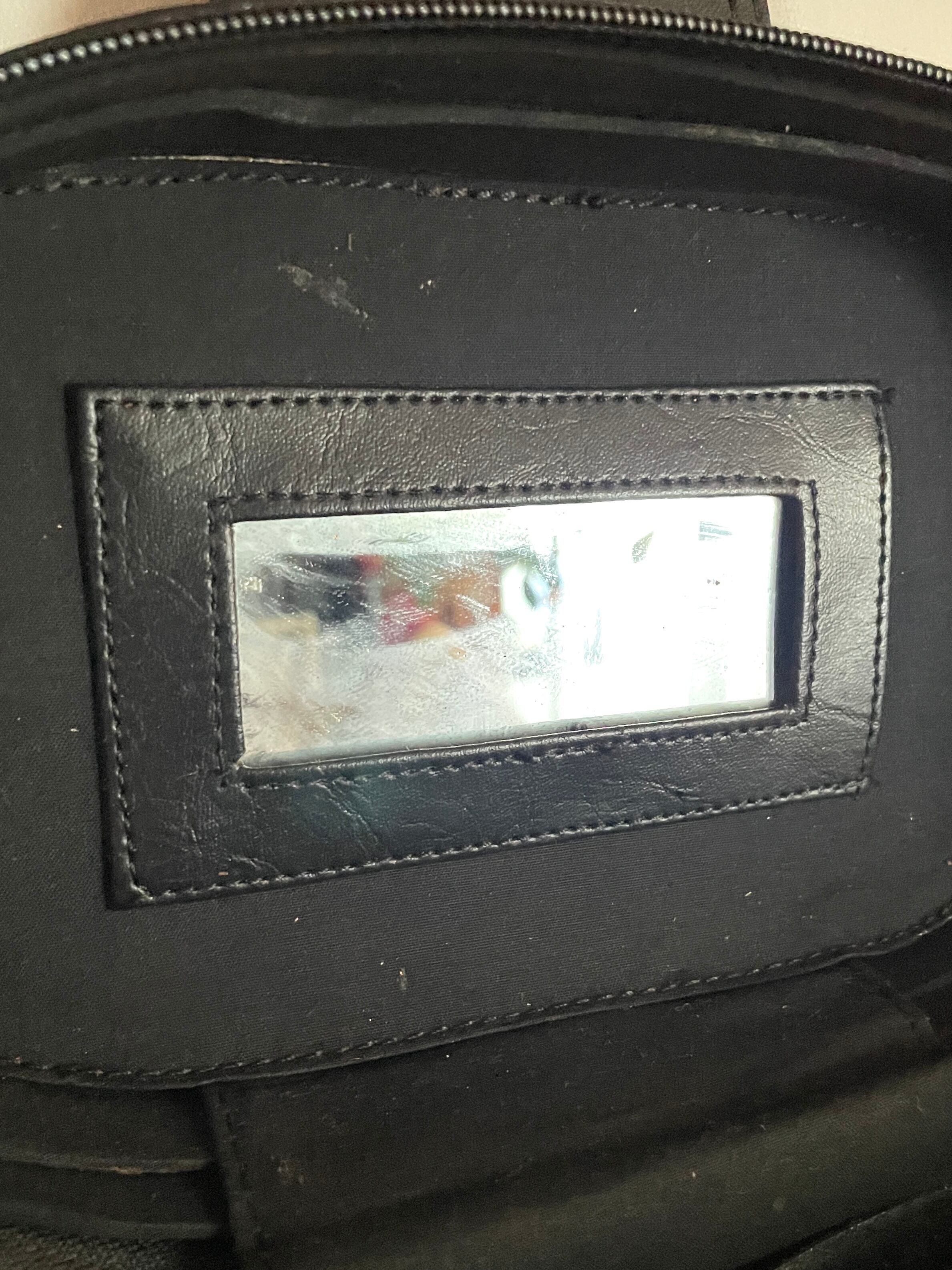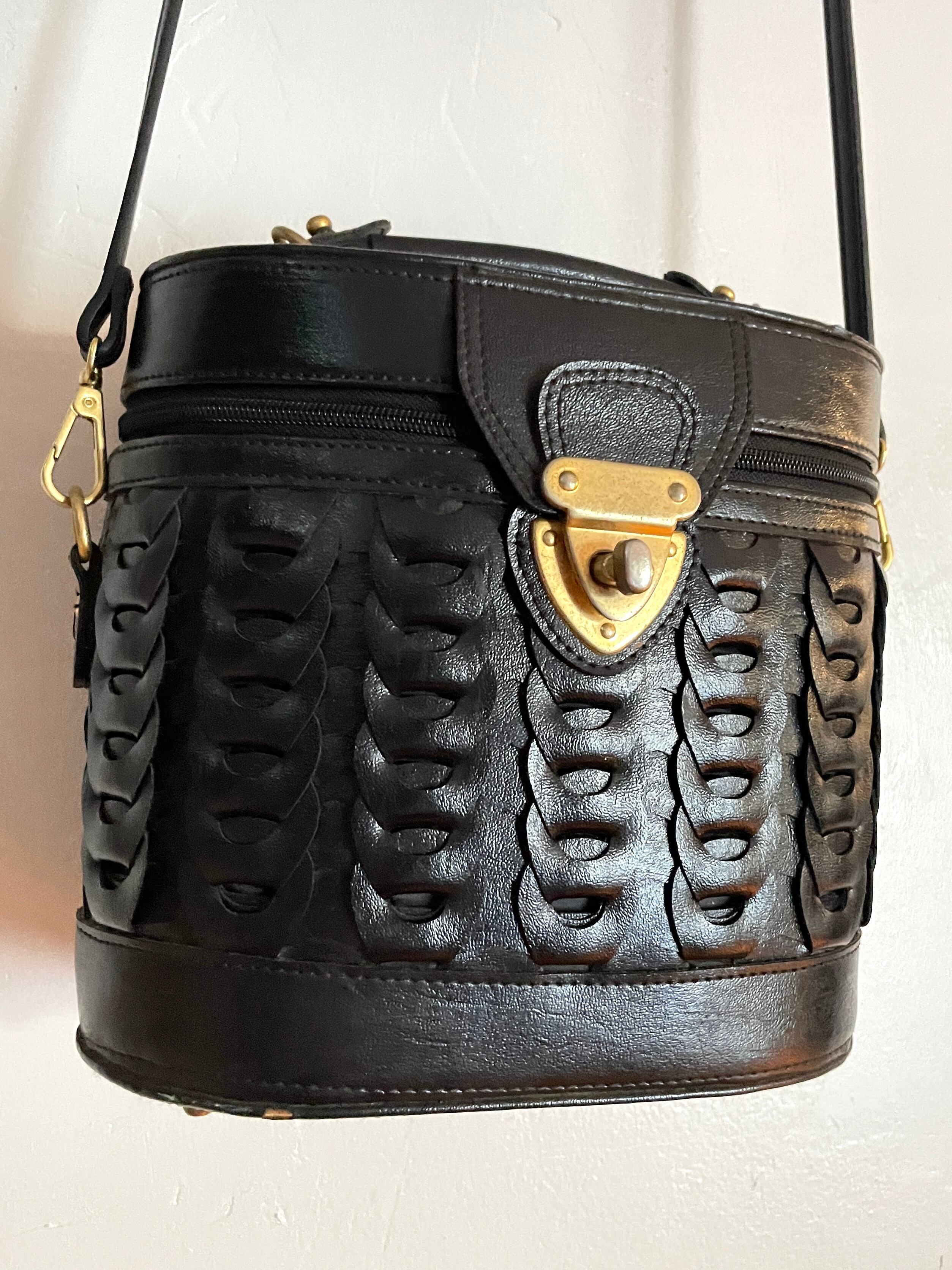 楕円形の珍しい形で、ジップとひねりタイプの錠前が付いたレザーバッグ。編み込みのような独特のデザインも特徴的です。上には手持ちも付いていて、細い肩掛け用のベルトは取り外しと長さ調整が可能。開けると小さな鏡と、内側にはカードケースも付いています。メイクボックスとしても使えそう。形の崩れないしっかりとした作りです。