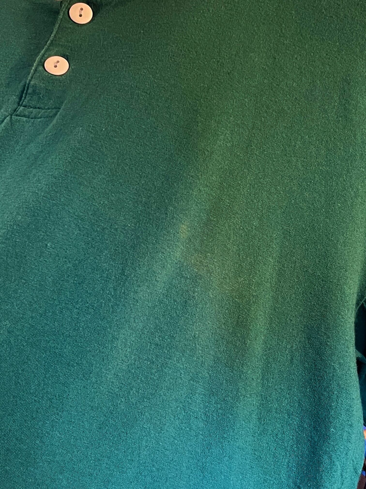 濃いめのグリーンで、ヘンリーネックタイプのTシャツ。ネック、袖口にボーダーリブが使われています。両脇には小さめのスリット入り。袖口のリブもテンションが強過ぎないため、窮屈さがなくスッキリ着れます。シンプルなデザインの中に、ちょっとしたアクセントを加えたなかなかセンスのある一着です。