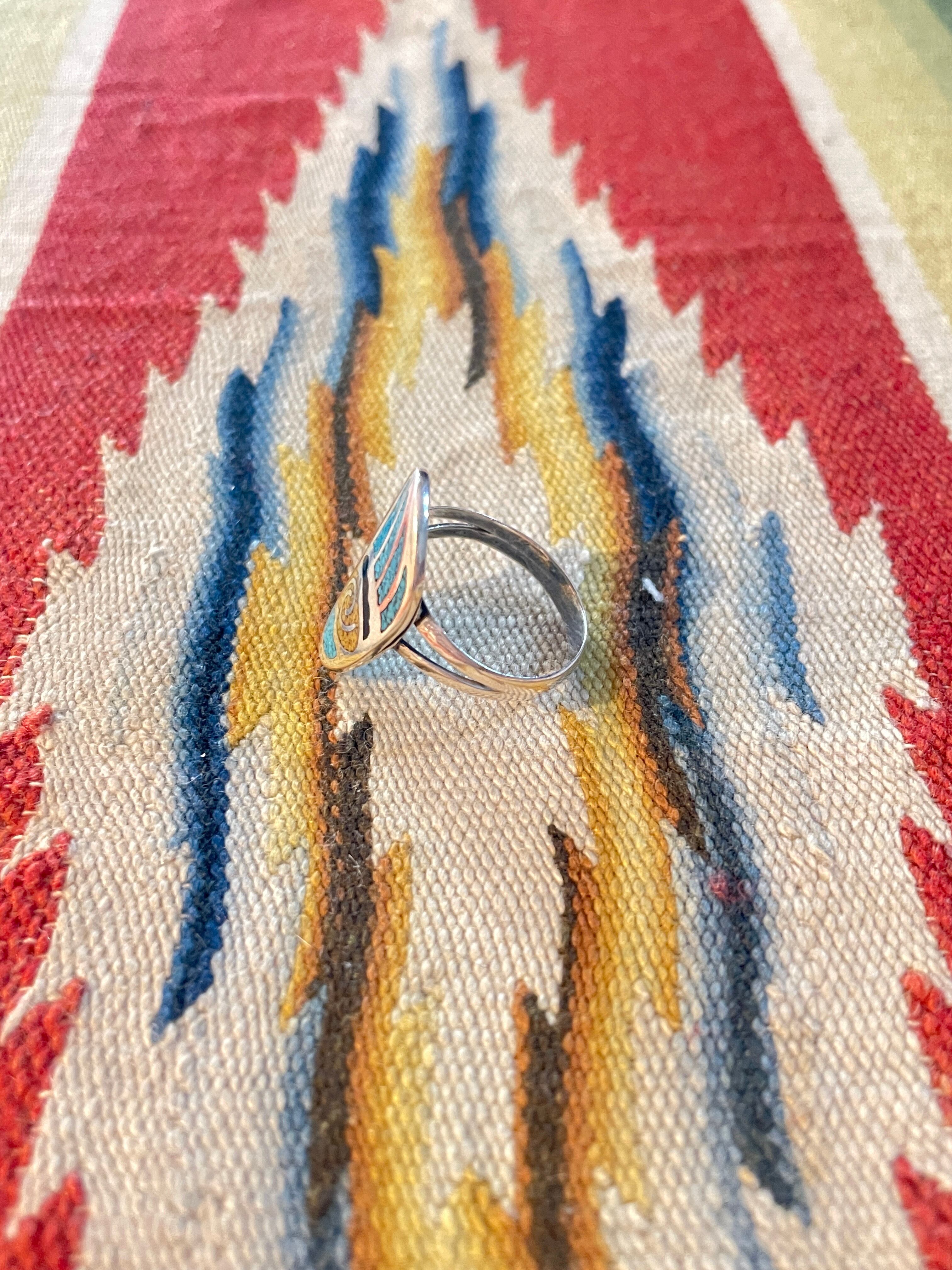 熊の足跡?のようなデザインが、ターコイズ柄によって表現されたシルバー925のリング。1つ付けるだけでかなり雰囲気のでそうなリングです。高級感のあるシルバーで、重過ぎず、軽過ぎない程良い重量感になっています。シンプルになりがちな夏にはもってこいのリングかと思います。