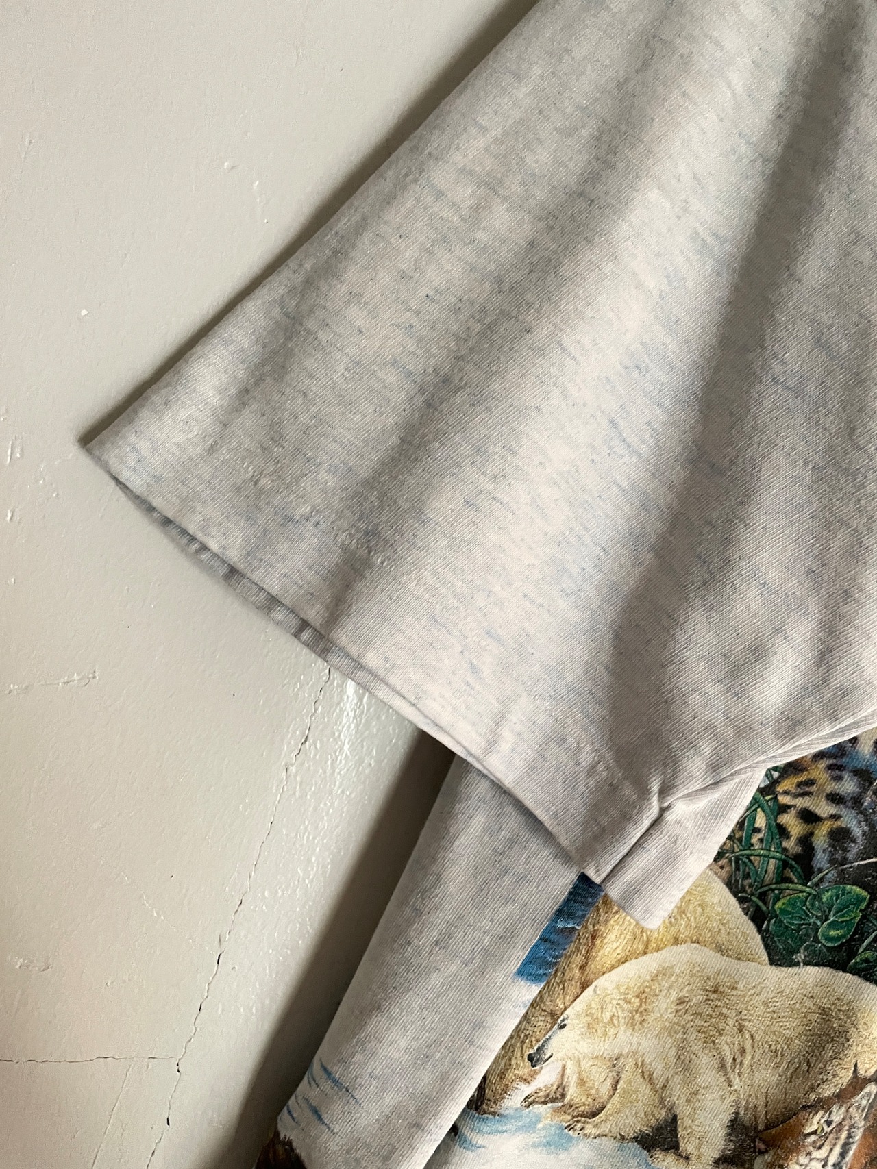 若干ライトブルーが混ざった、杢グレーボディに、様々な動物が両面にプリントされたTシャツ。
