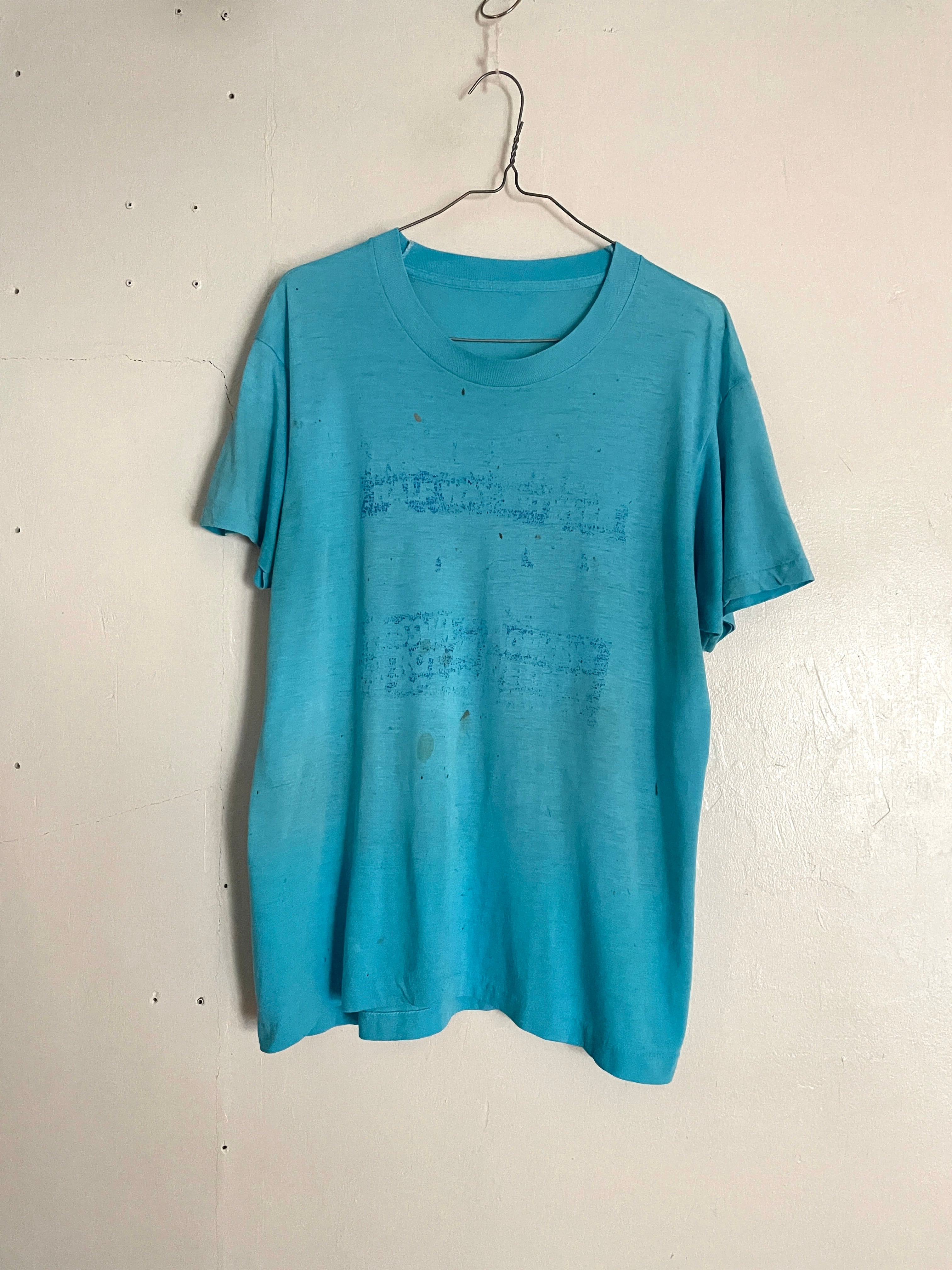 水色ボディにほとんど消えかかったプリント、所々ペンキ跡が見られるTシャツ。タグが欠損していますが、ボディはおそらくコットンとポリエステルの混紡素材。コットン100%では見られない透け感が、古着特有の雰囲気を出しています。袖口、裾はシングルステッチ、やや縦長で袖丈が短めのシルエットから、80年代頃のものであることが予想できます。古着Tシャツ ”らしさ” を感じられる一枚。
