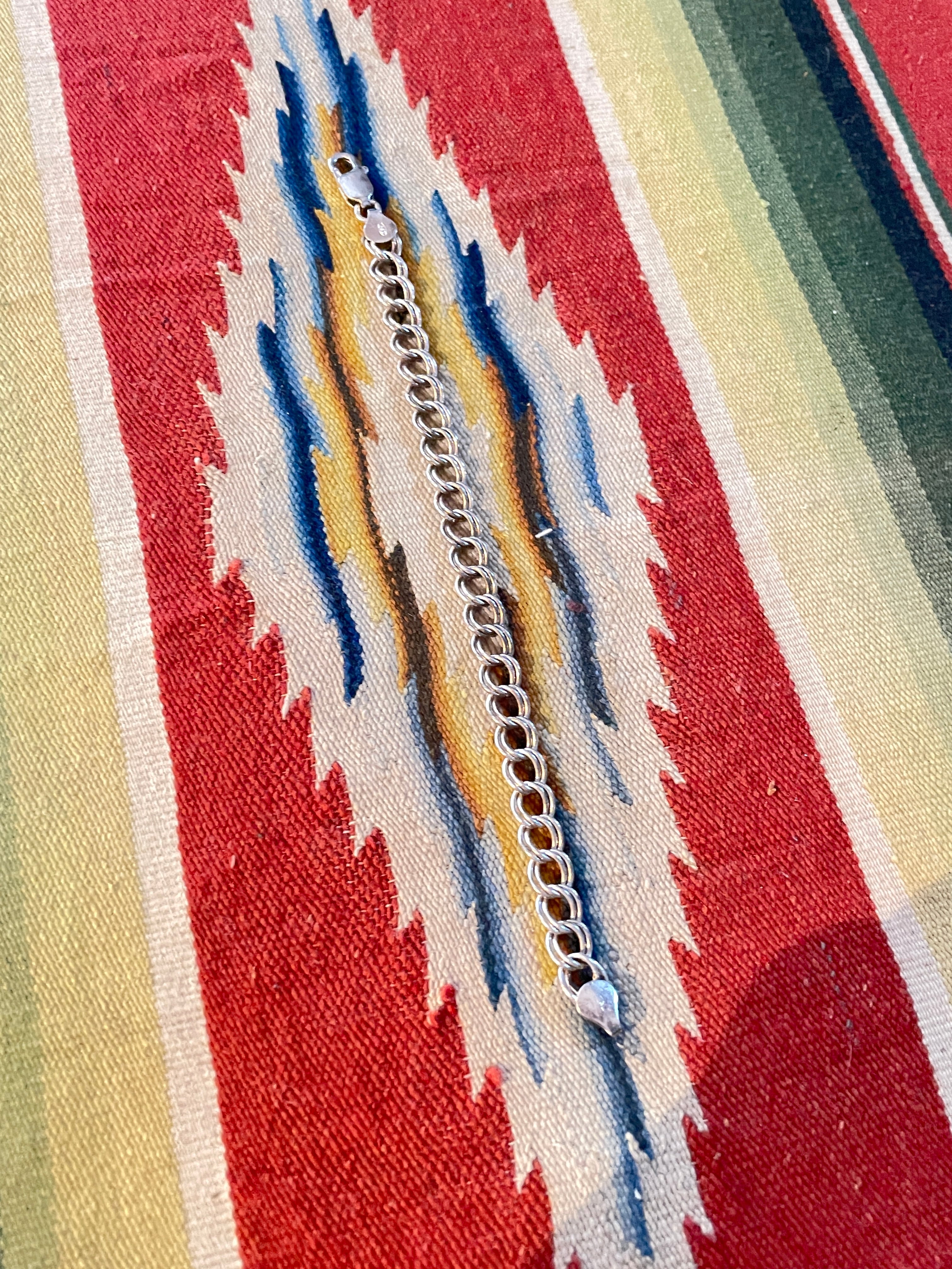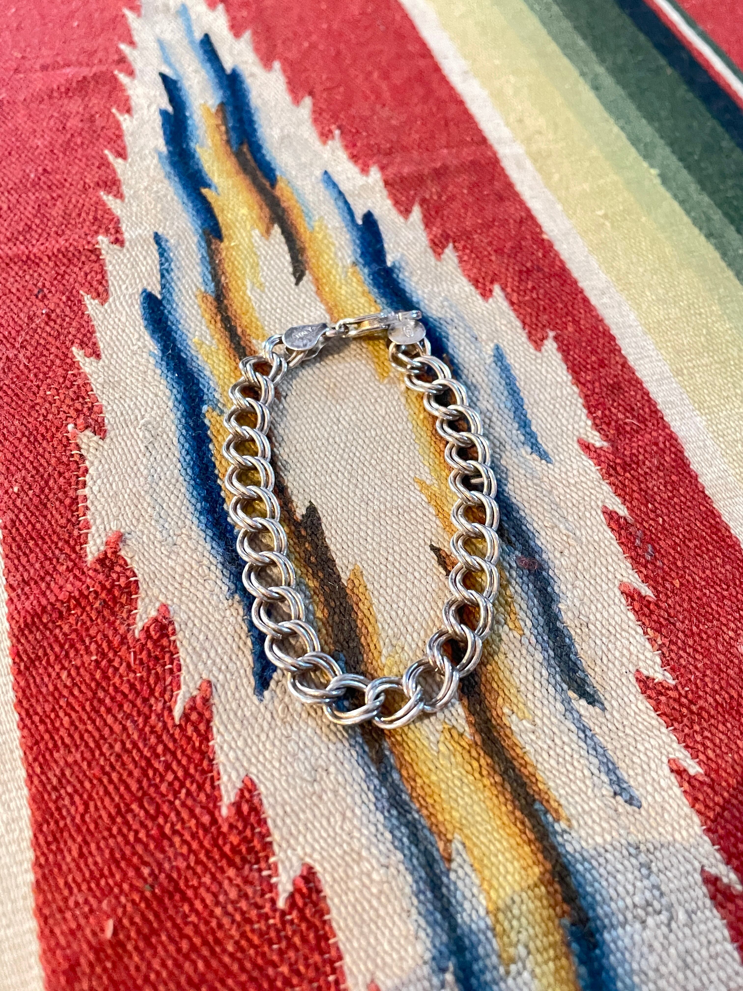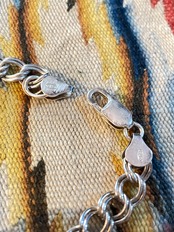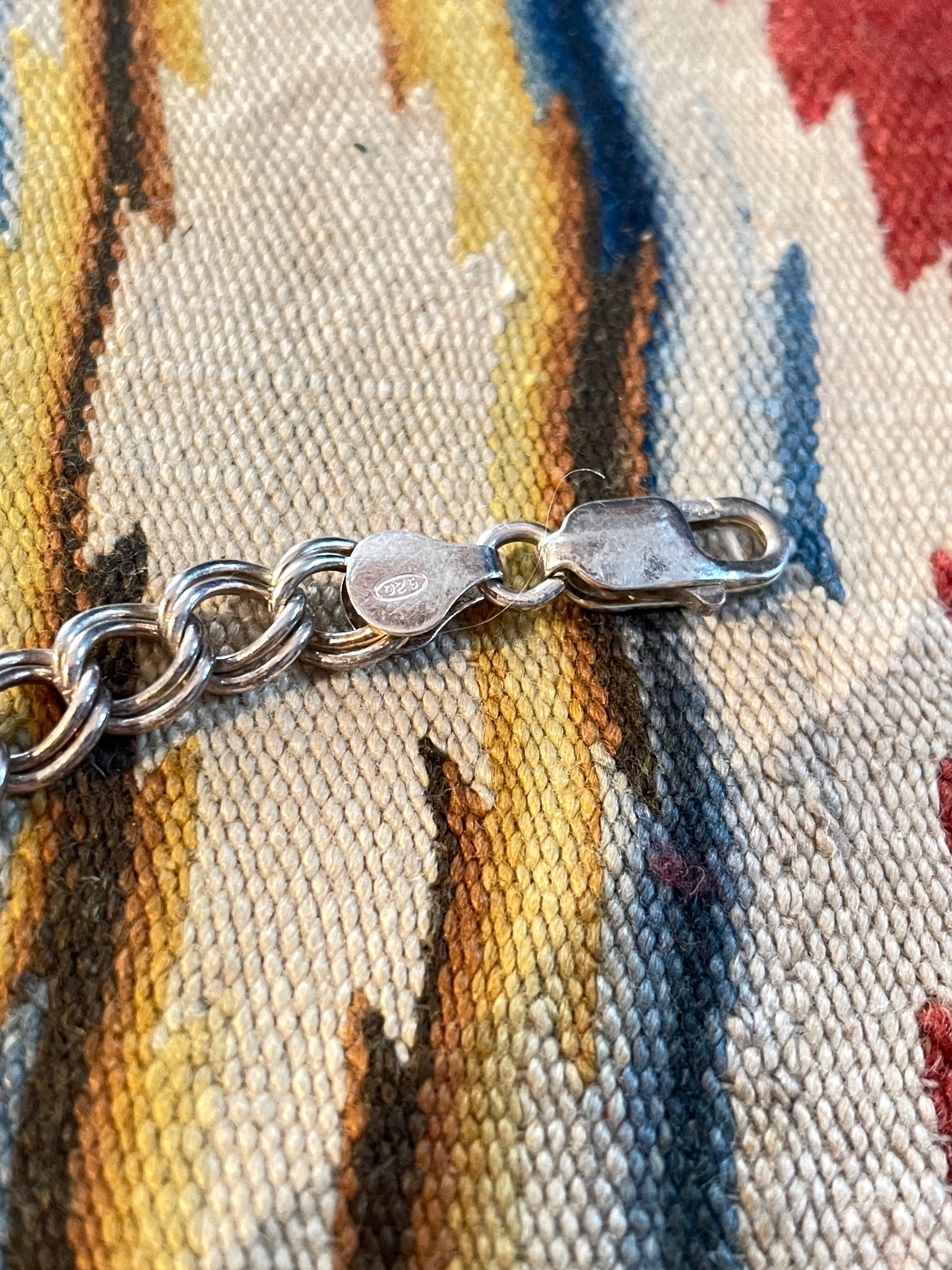 光沢のあるシルバー925で、二重デザインのチェーンブレスレット。程良い太さで、どんなファッションにもハマるブレスレットです。イタリア製なのもポイントが高いです。今の時期さりげなくこういったブレスレットを付けるだけでかなり雰囲気が変わります。