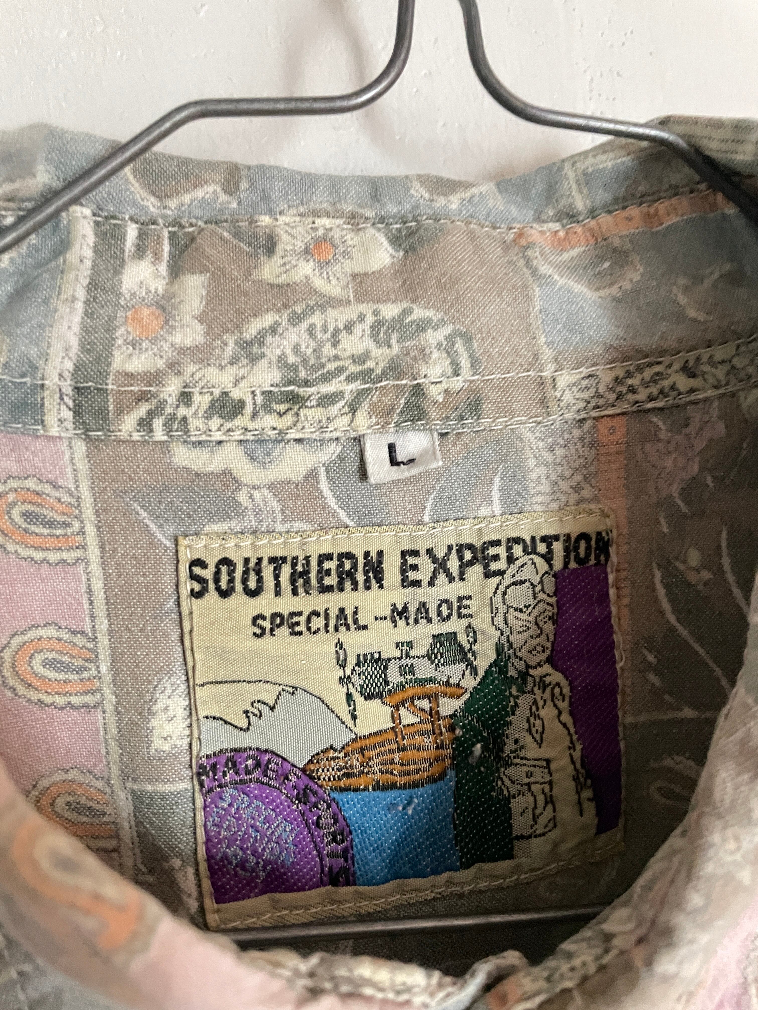 フェードしたボディに、ペイズリーや花柄などお洒落なデザインが施された、コットンシャツ。薄めなトーンで、ミステリアスな雰囲気が感じられる総柄デザイン。間違い無く今の時期にファッションの主役になってくれるシャツかと思います。ゆったりとラフに着られるサイズ感で、男性の方にはもちろん、女性の方も大きめで着たら可愛らしいかと思います。