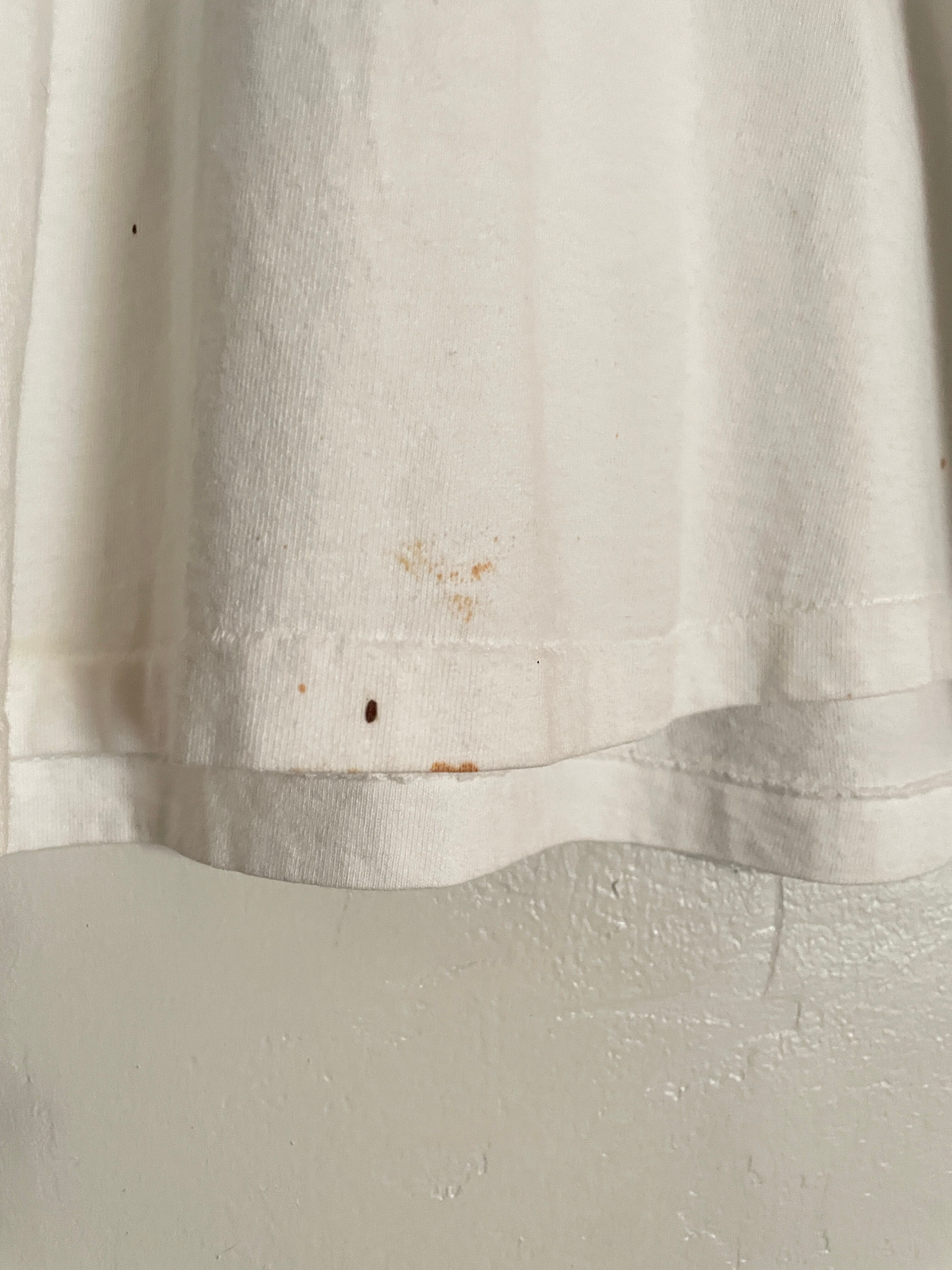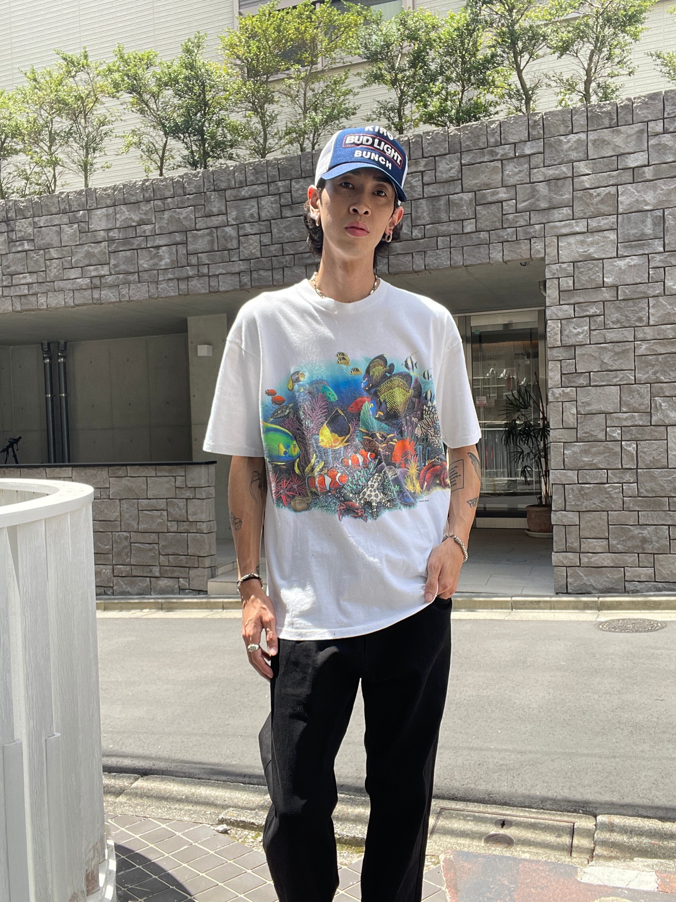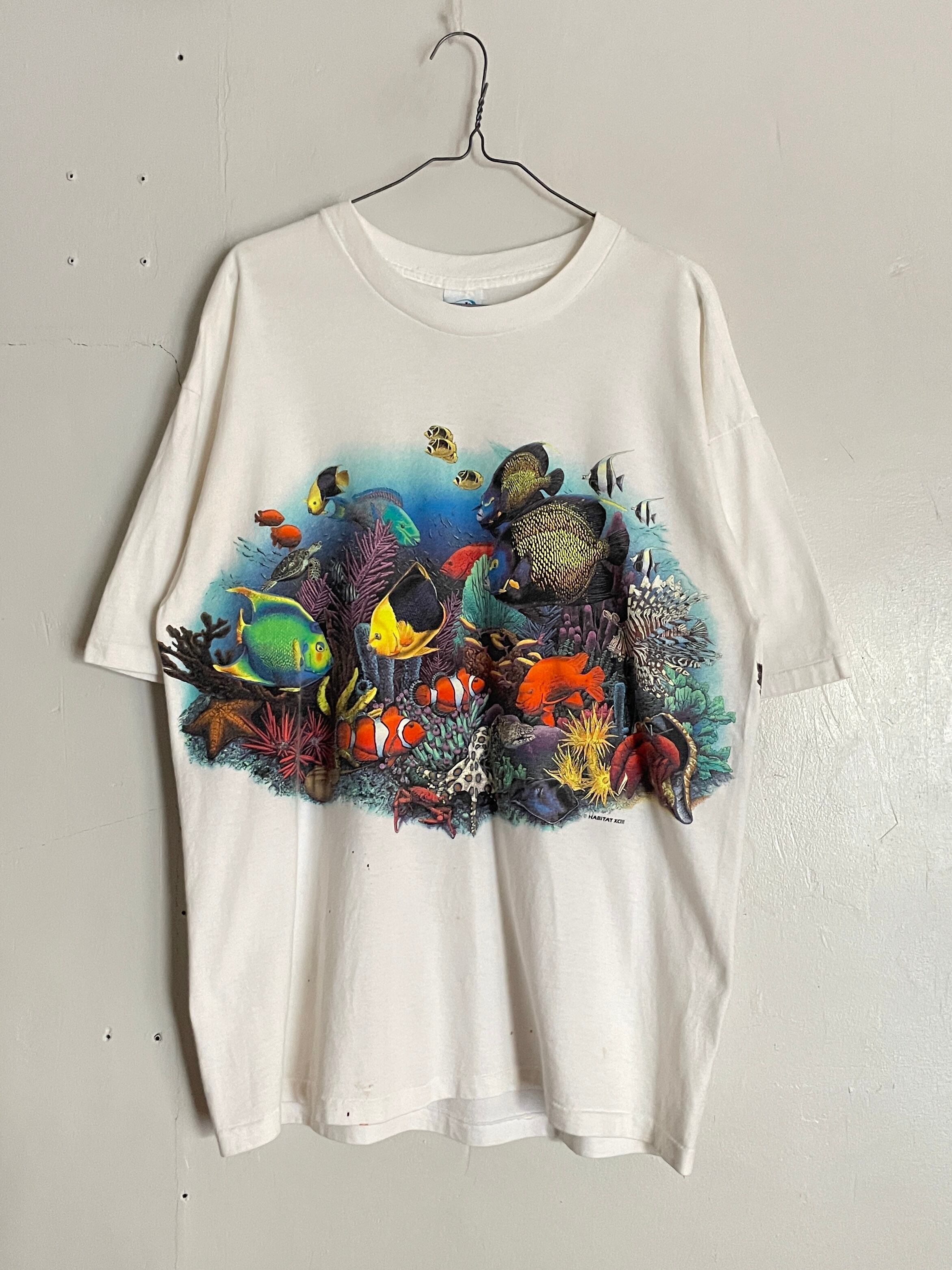 ホワイトボディに、カラフルな色味で、サンゴ礁をバックに海洋生物が両面プリントされたTシャツ。プリントの右下には”HABITAT XCIII"という文字が入っていて、これは”生息地 1993”といった意味で、デザインのテーマにしているかと思われます。魚やカメやカニなど見ているだけで、楽しい気持ちになります。ゆったりとしたサイズ感でラフに着られるのも魅力的です。シングルステッチでUSA製の一着です。やや汚れやシミが見られます。