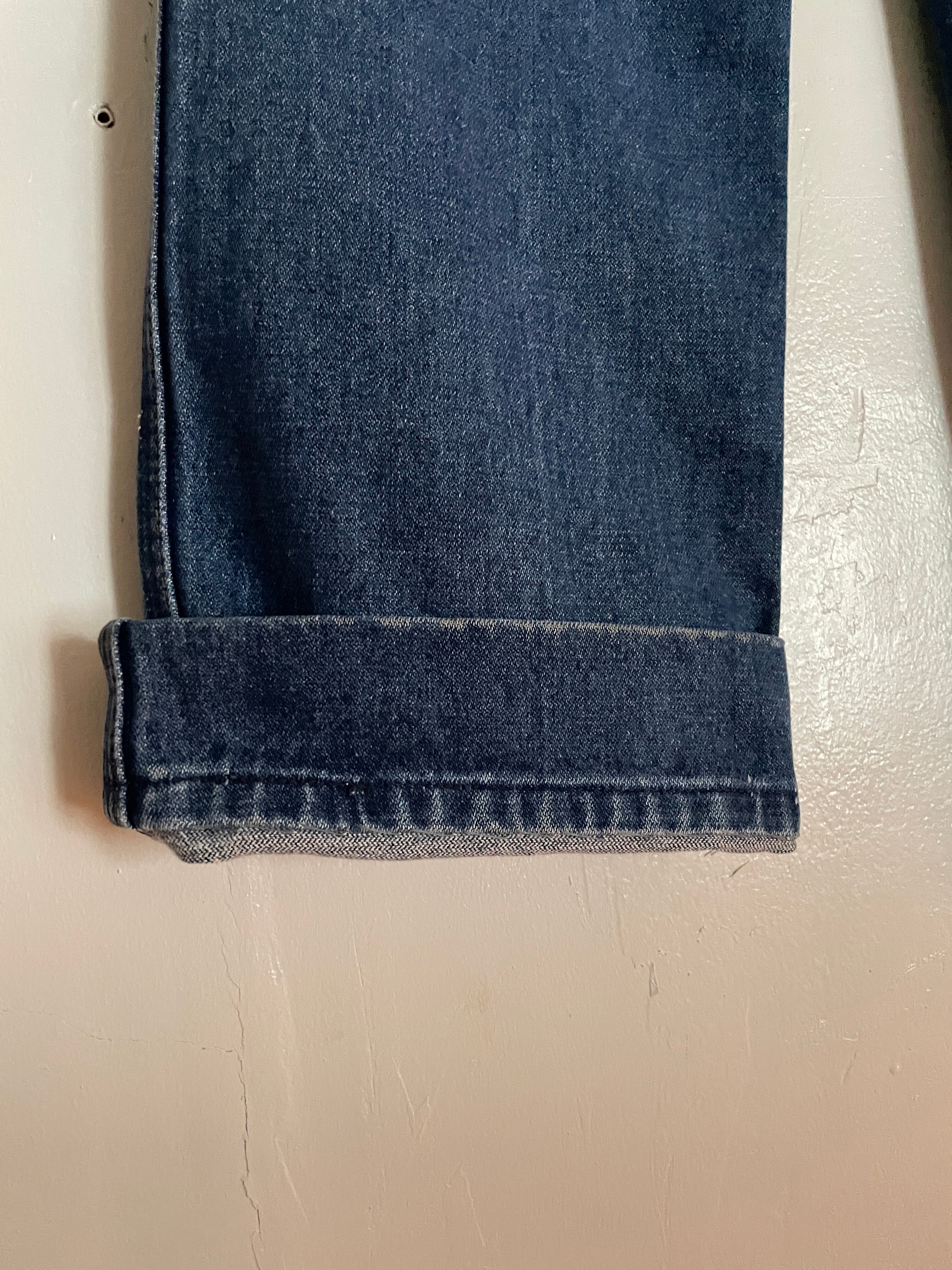 褪せた色味で、程良いダメージが加えられた、フレアデニムパンツ。細身で裾にかけての綺麗なフレアシルエットが魅力的な一本です。まさに美脚デニムといったところ。裾上げされている事によって、程良い丈感になっています。太めなパンツが流行りつつありますが、こういった細身デニムもやっぱりかっこいいです。USA製なのもポイントが高いです。