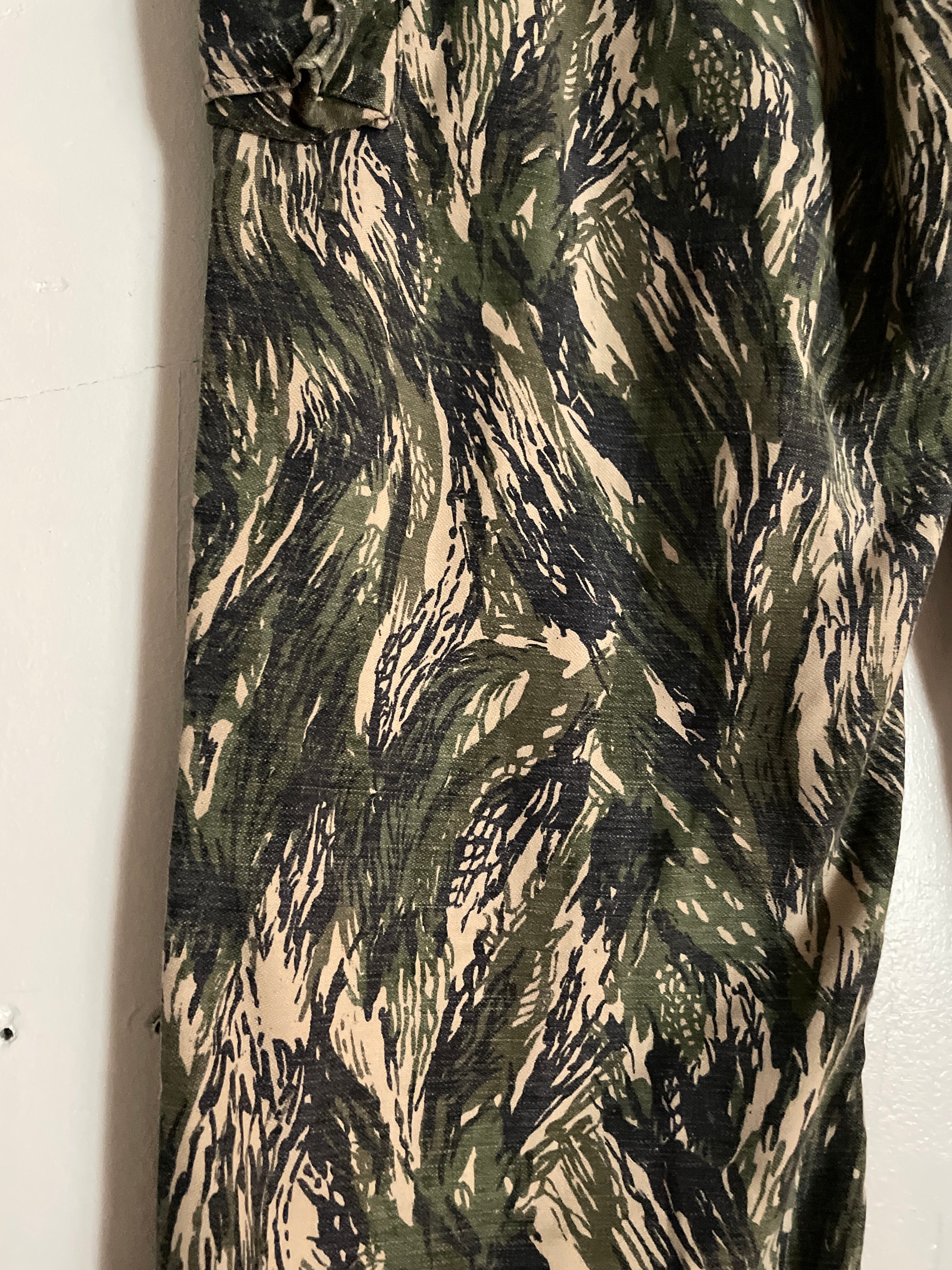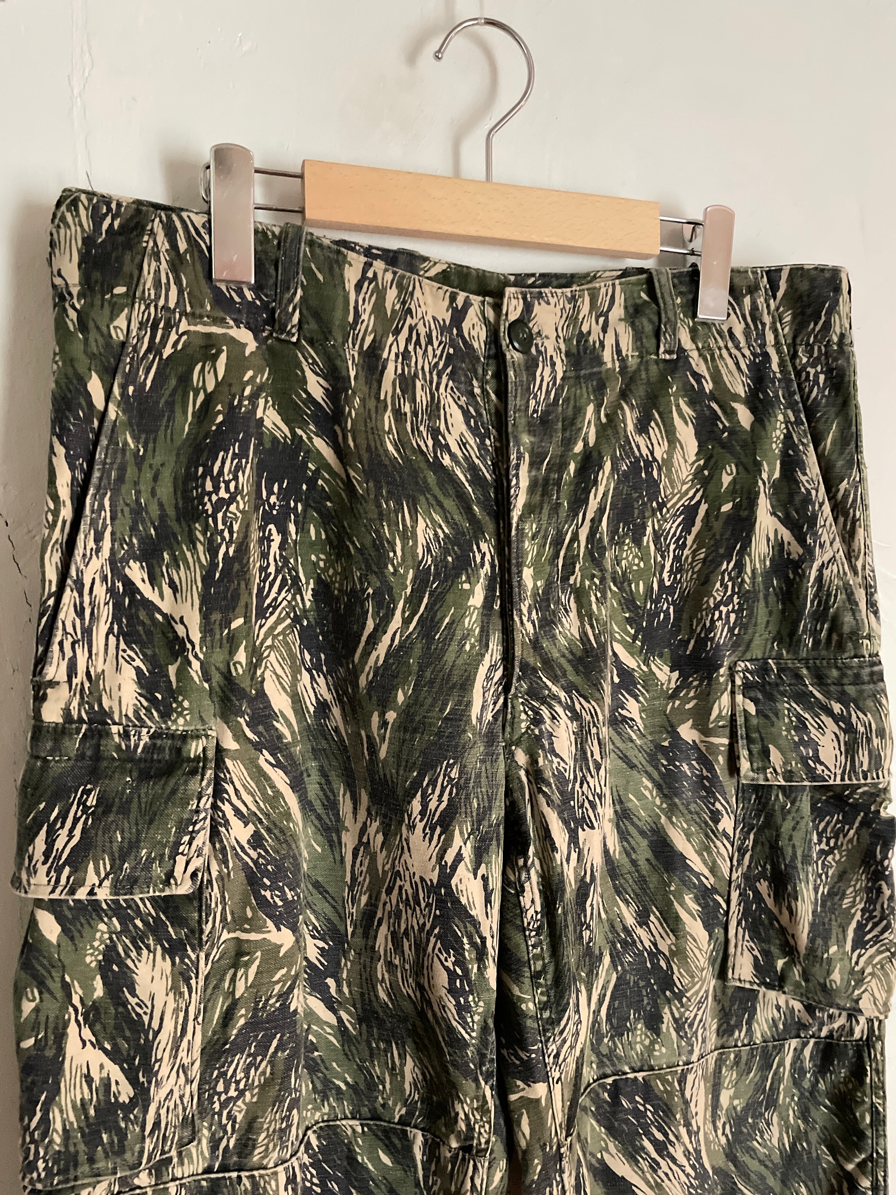 筆で書き殴ったような珍しい迷彩柄のアーミーパンツは、ギリシャ軍のもの。どうやら70年代頃のもののようです。迷彩の呼称は「Seaweed Camo」。日本語で海藻の意味ですが、言われてみればそんな感じにも見えますね笑 アメリカやヨーロッパの軍モノとはまた一味違い、詳細がなかなか出てこない非常に珍しい一本。裾にはドローコードがついているため、シルエットに変化を与えることも可能。ウエスト、丈感のサイズバランスも抜群で、気になるダメージも見当たりません。なかなかお目にかかれない、希少なミリタリーアイテムです。