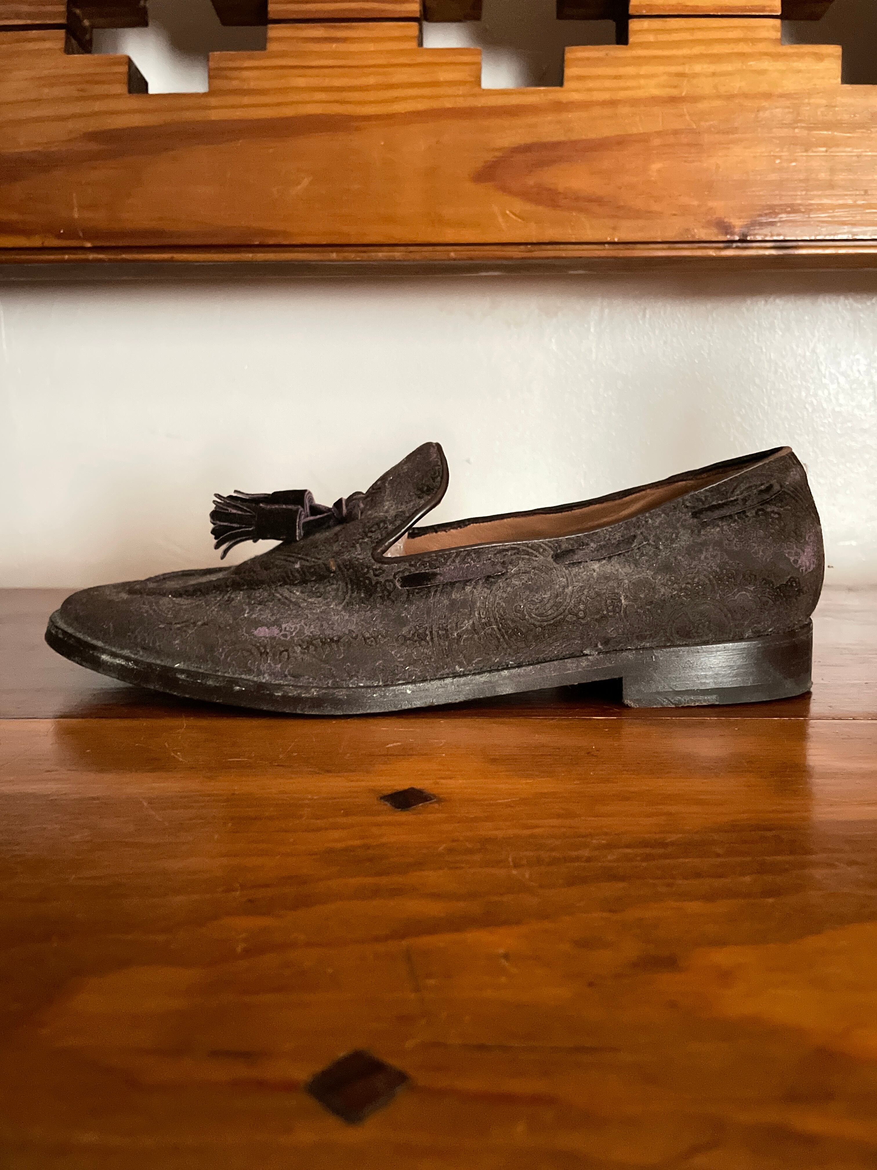 全体に柄が入り、部分的にやや紫がかったタッセルローファー。靴本体の素材はレザーだと思われますが、Tシャツやスウェットなどに見られるフロッキー加工のような特殊な仕様で柄が表現されている珍しいデザインです。アウトソールは28cmありますが、履き口がタイト目な作りのため、普段25.5〜26cm程度を履かれる方に良いかもしれません。イタリア製。