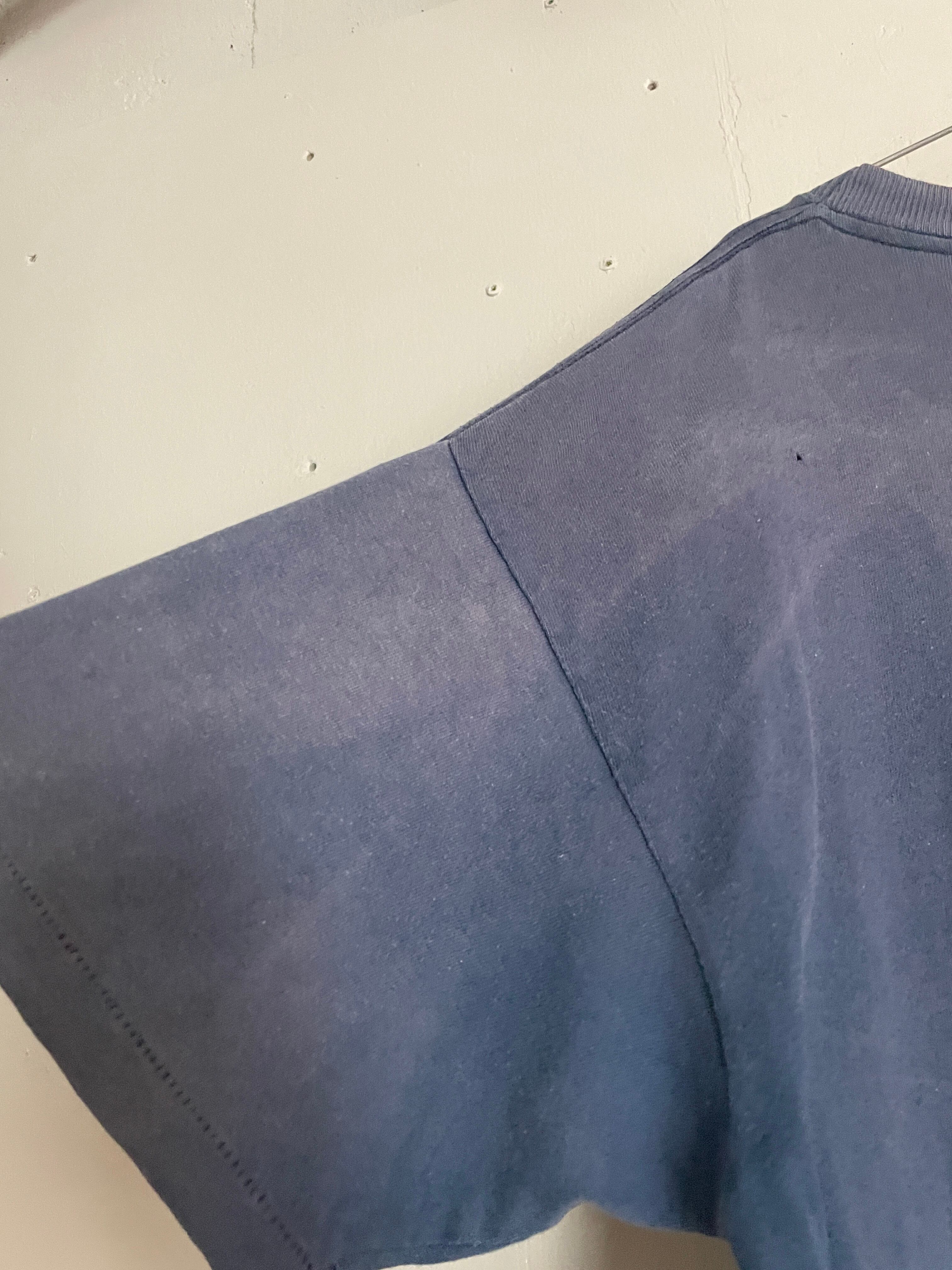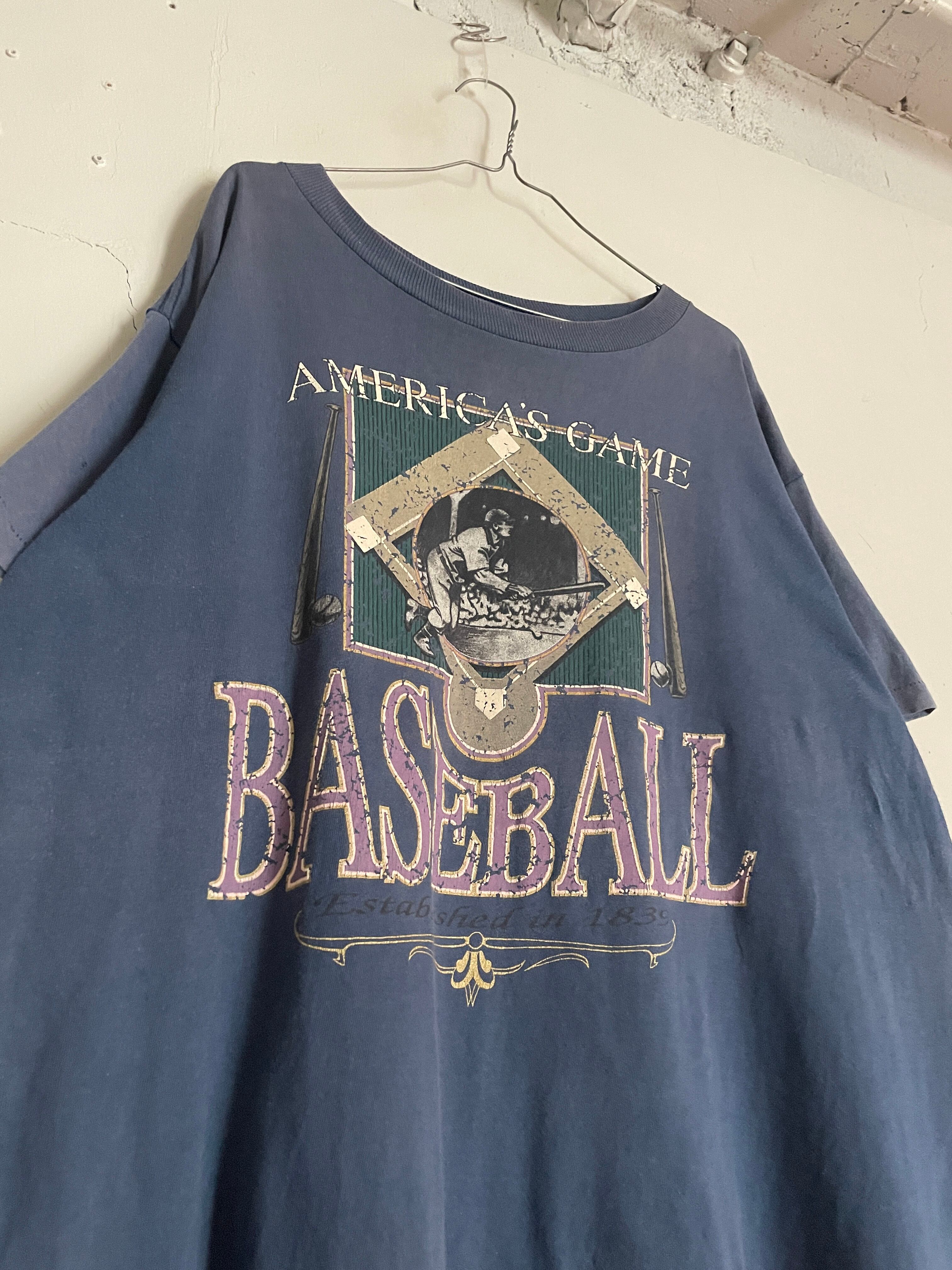良い褪せ方をしたネイビーボディに、野球をテーマにしたプリントが施された、アメリカンイーグルのTシャツ。スレた加工が施されたプリントから、ヴィンテージ感漂う一着。肩が落ちるようなゆったりとしたサイズ感で、今の時期には一枚でラフに着られそうです。シングルステッチでUSA製の一着です。所々に小穴が見られますが、それも込みで雰囲気抜群のアイテムです。