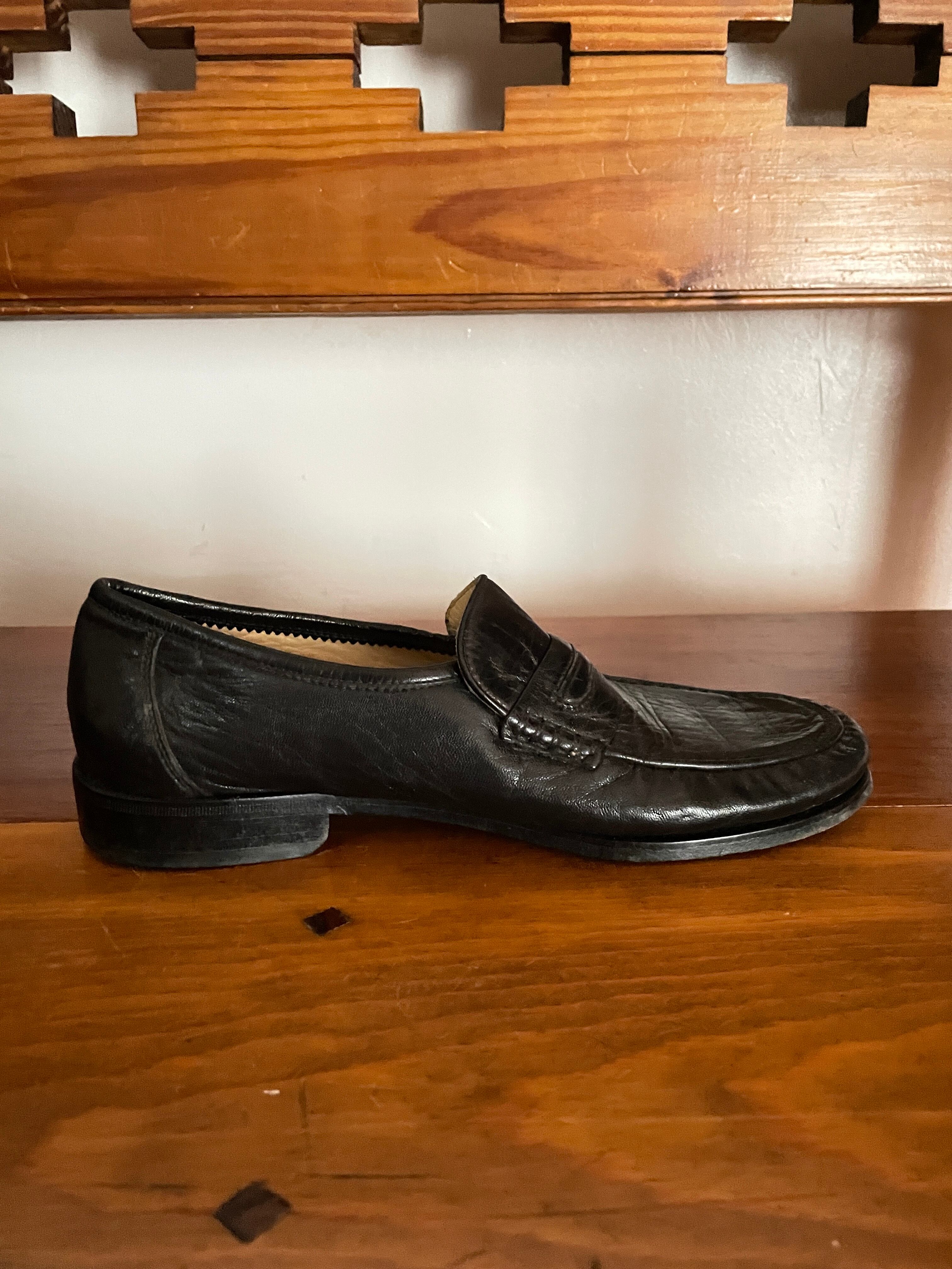 タバコなどで有名な”キャメル”のデザインローファー。光沢のあるブラックカラーで、柔らかく、ややシワ感のあるデザインが特徴的です。カチッとし過ぎていない、カジュアルめなディテールなのが魅力的です。ヒールの高さも丁度良く、非常に履きやすいローファーかと思います。多少の擦れなどは見られますが、目立った汚れやダメージもなく、コンディションは◎です。