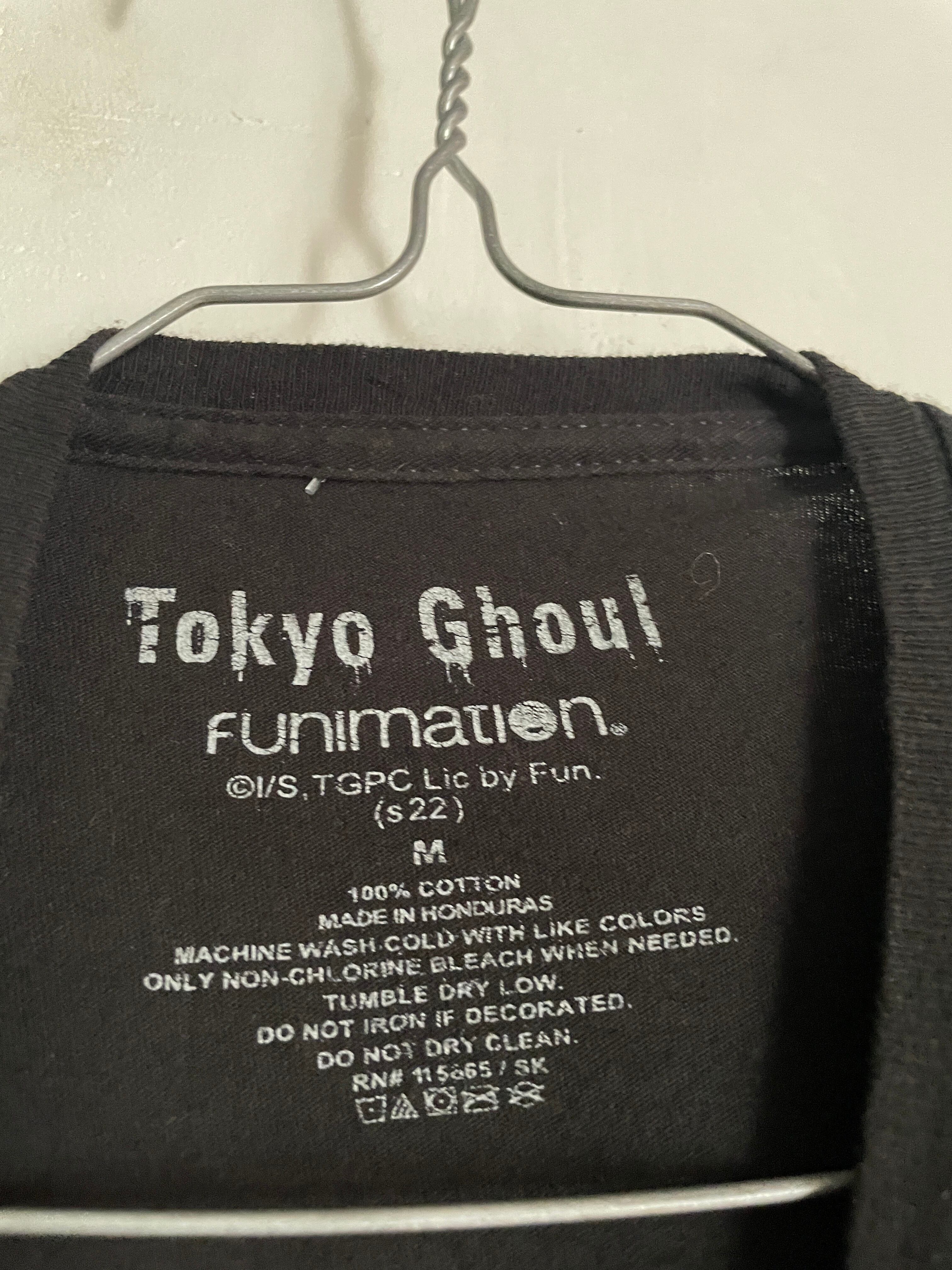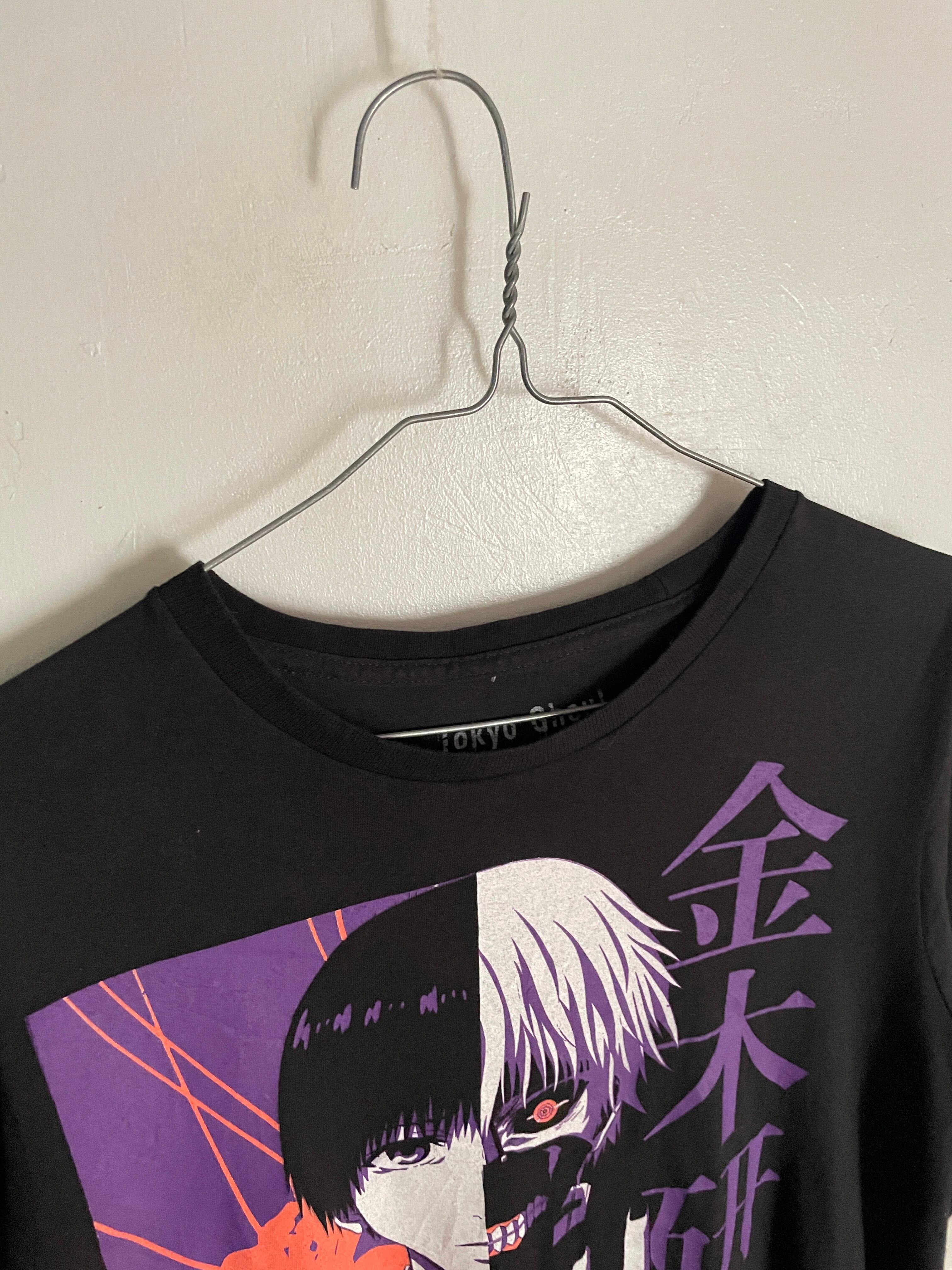 ブラックボディに、人気アニメ東京喰種の主人公”金木研”がプリントされたTシャツ。人間としての姿と、隻眼の喰種としての金木が左右に分かれて、プリントされています。ダークな雰囲気でクールすぎる一着。喰種好きにはたまらない一着ではないでしょうか。タイトめなシルエットで、女性の方はもちろん、男性の方もジャストめで着たら今っぽくてかっこいいかと思います。