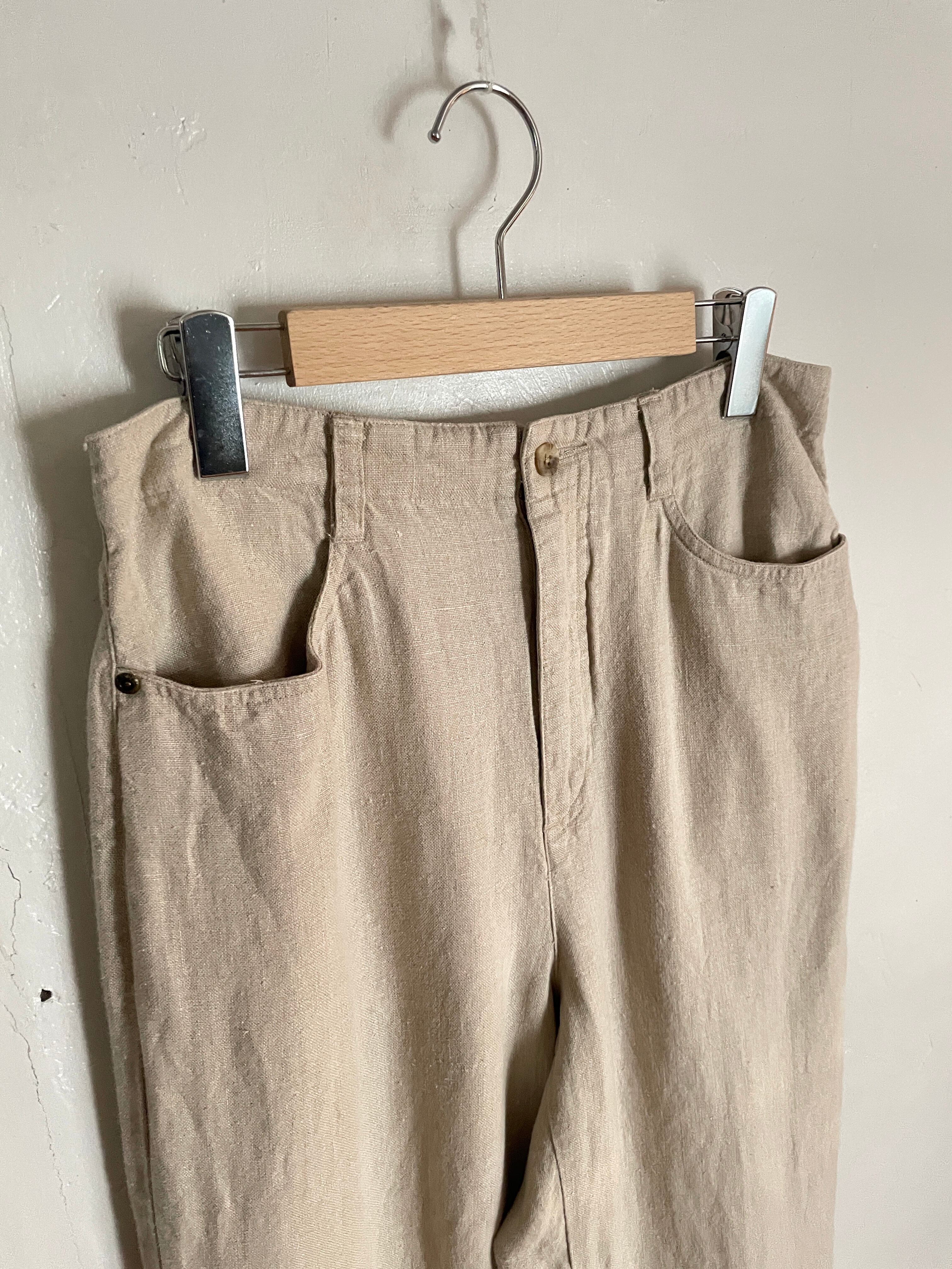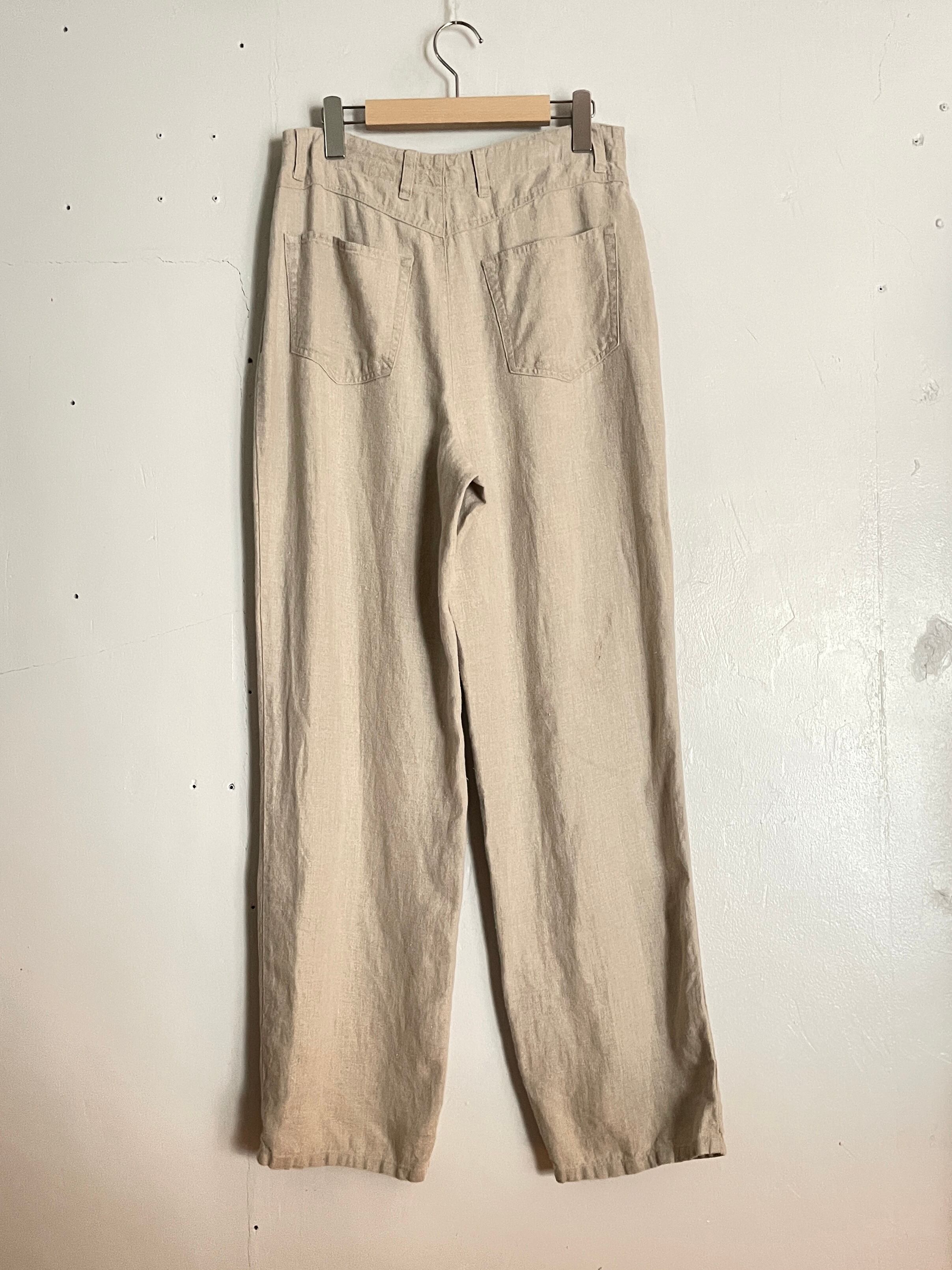 爽やかな印象のベージュカラーで、テロッとした上品な質感の、エディーバウアーのリネンパンツ。レディースアイテムにはなりますが、メンズの方でも履けるゆったりとしたワイドシルエット。丈感もルーズめ。通気性抜群で、今の時期には涼しげに楽に履けるのも魅力の一つです。Tシャツやシャツなど、様々なアイテムとの相性の良い一本です。
