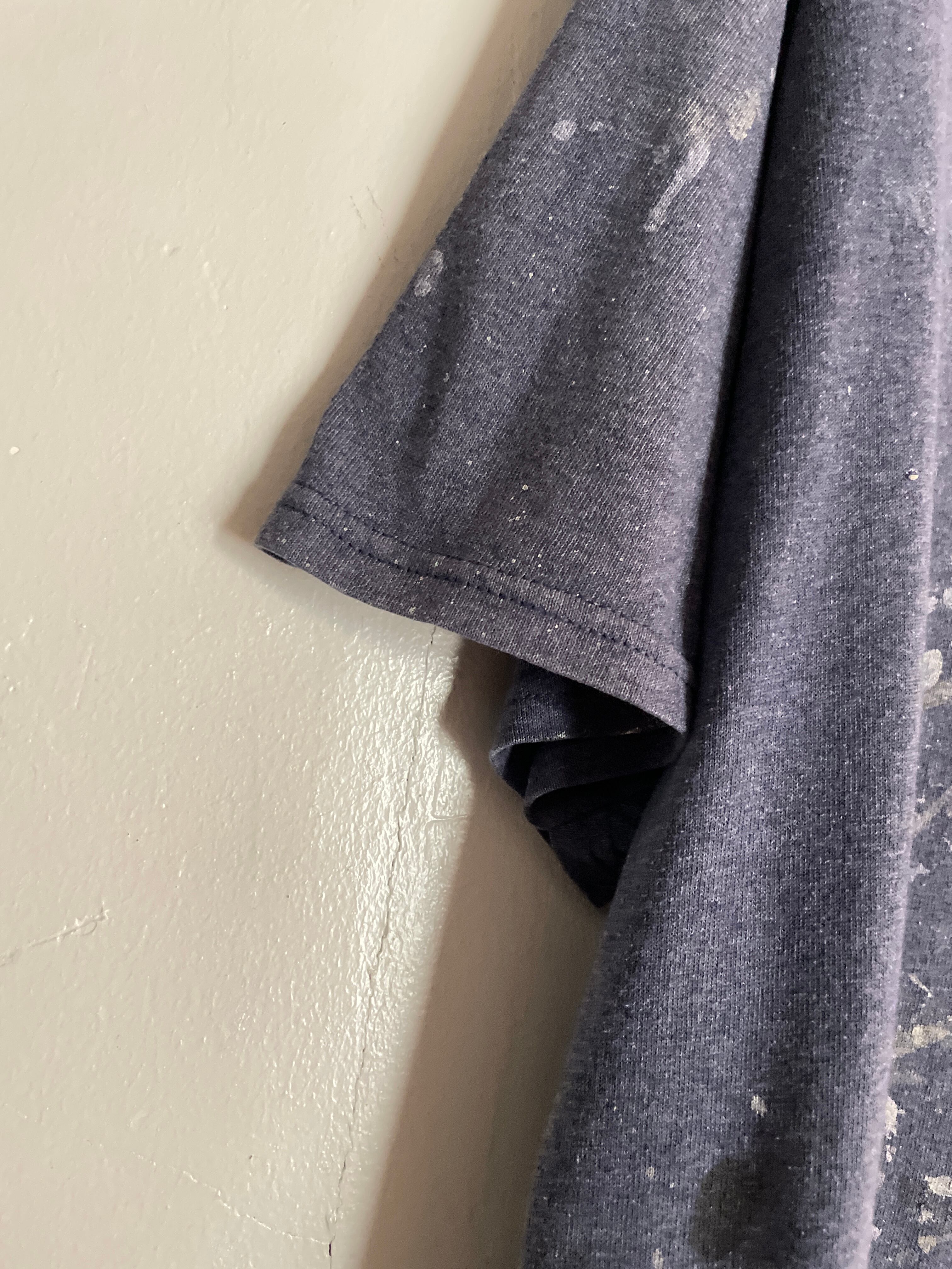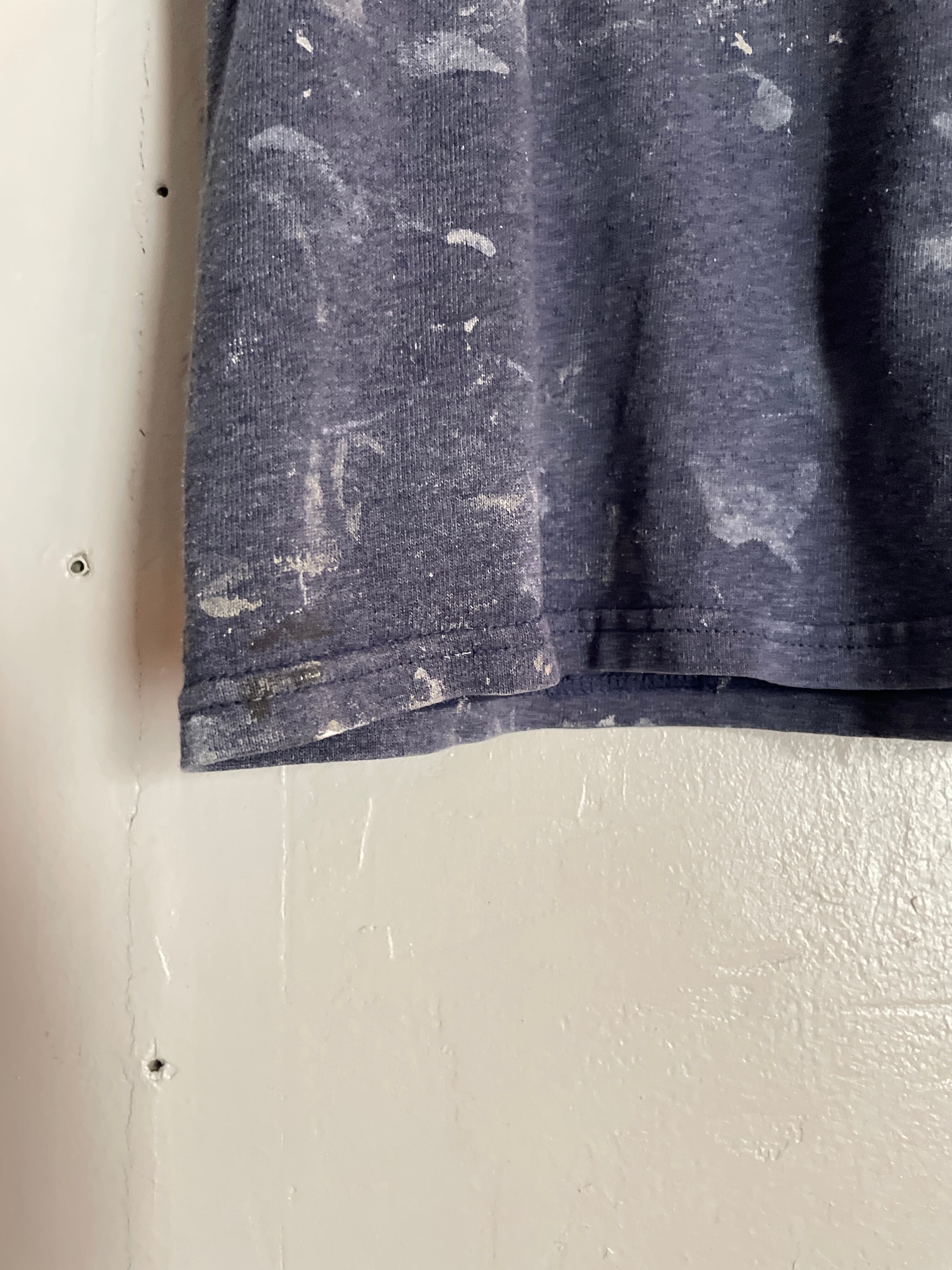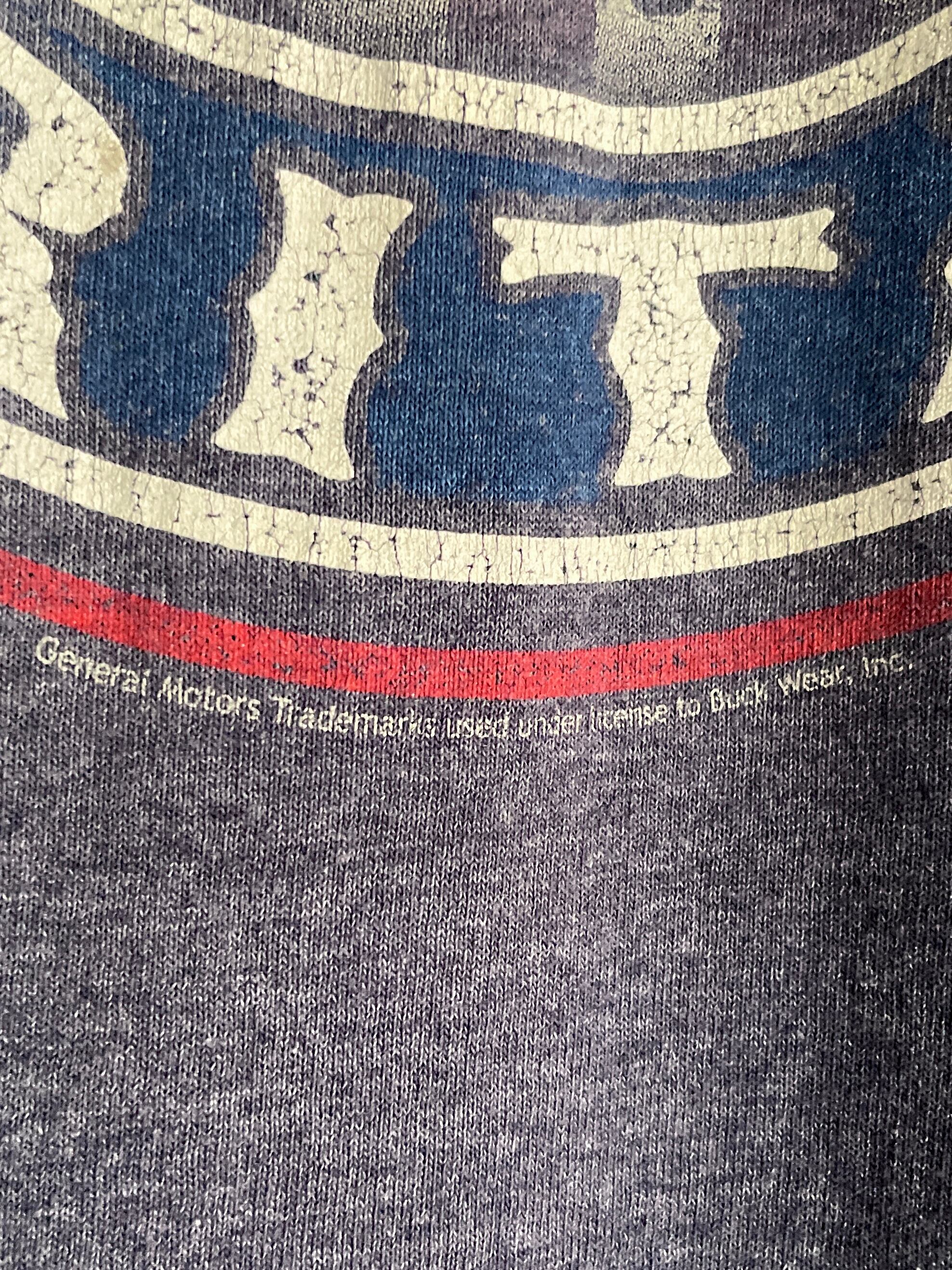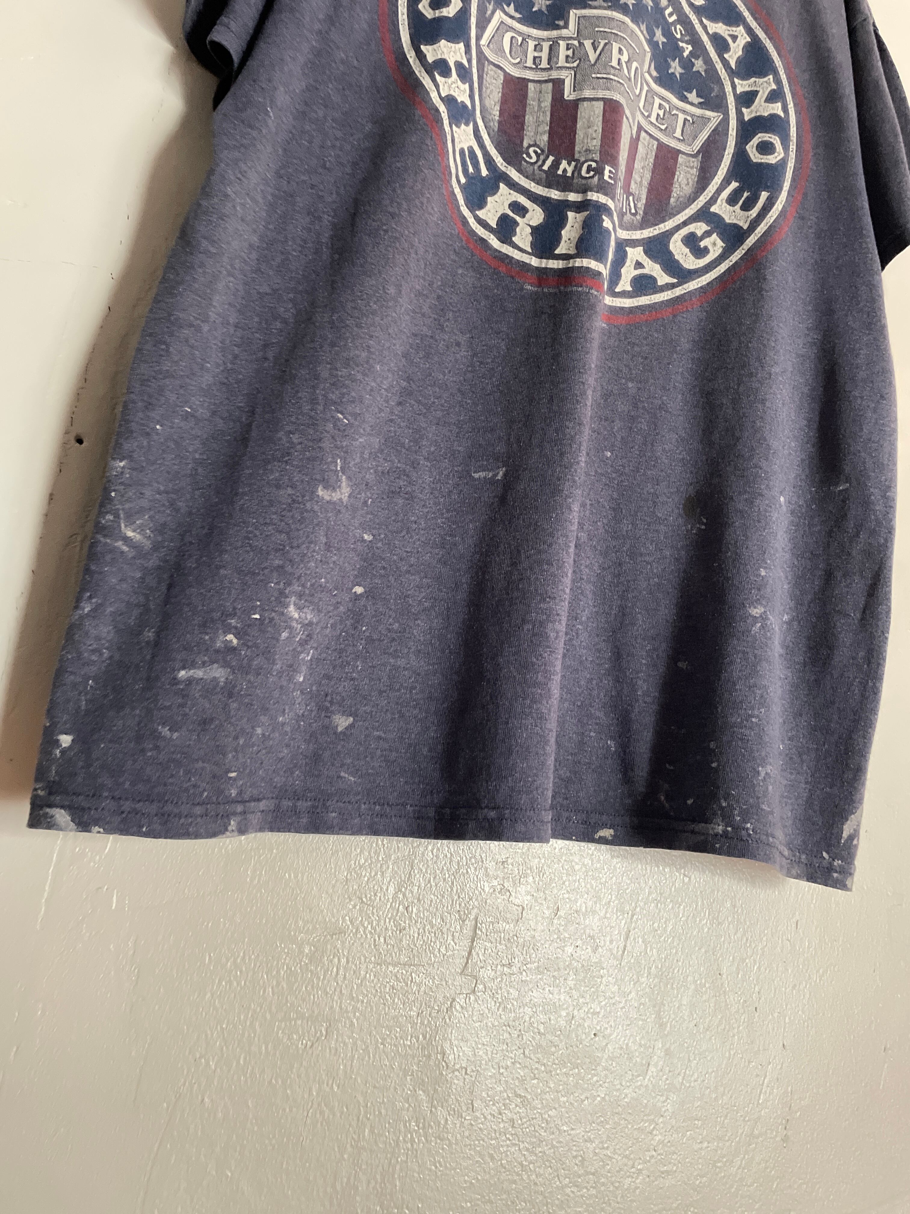グレーボディにガッツリペンキ跡、前はワンポイントで背中に大きめプリントのシボレーTシャツ。メーカーロゴを使ったプリントで、背中はアメリカンフラッグを掛け合わせたインパクトのあるプリントになっています。ダメージをデザインに昇華した、古着ならではの一枚はカッコいい雰囲気のあるTシャツに仕上がっています。