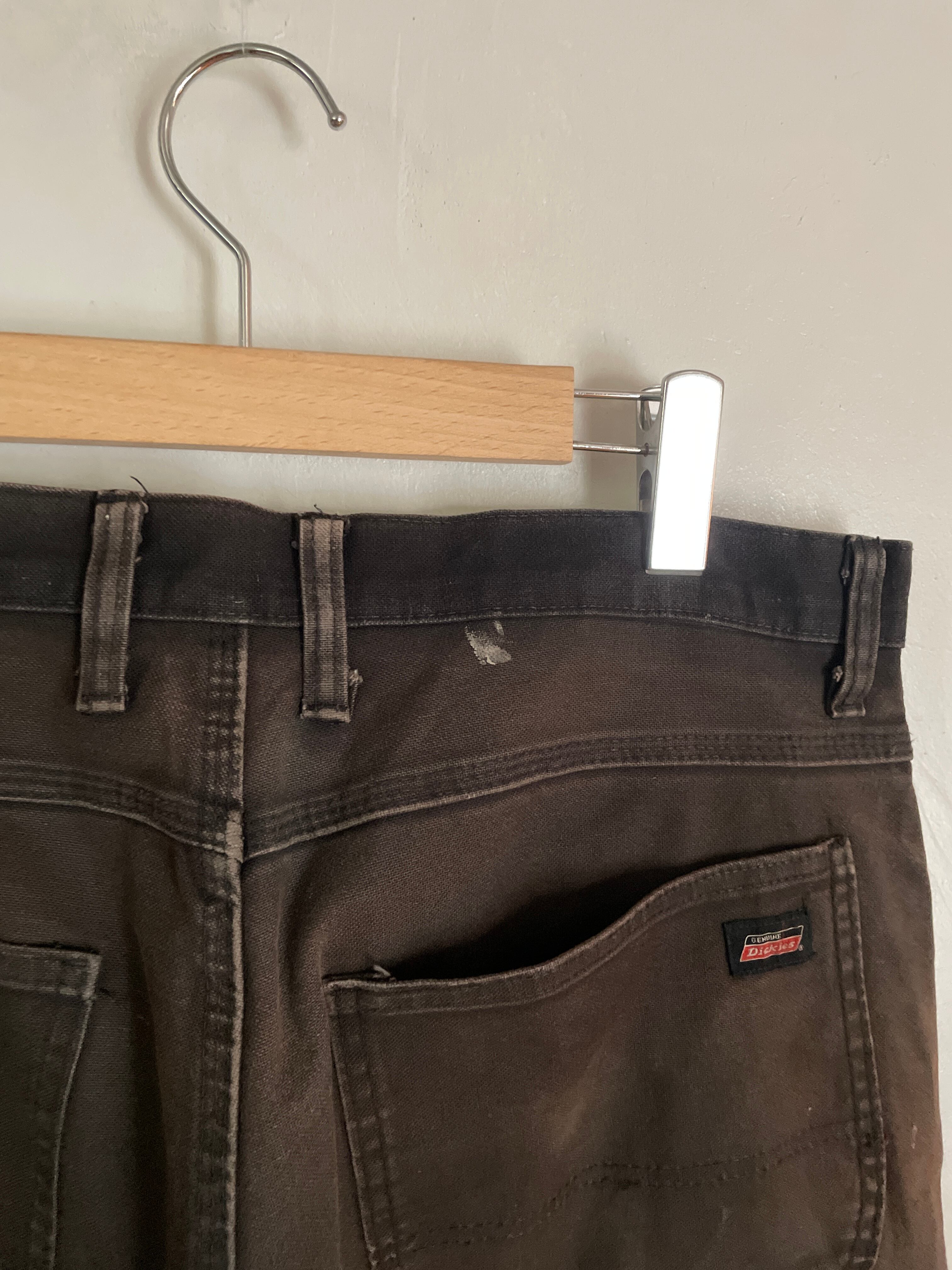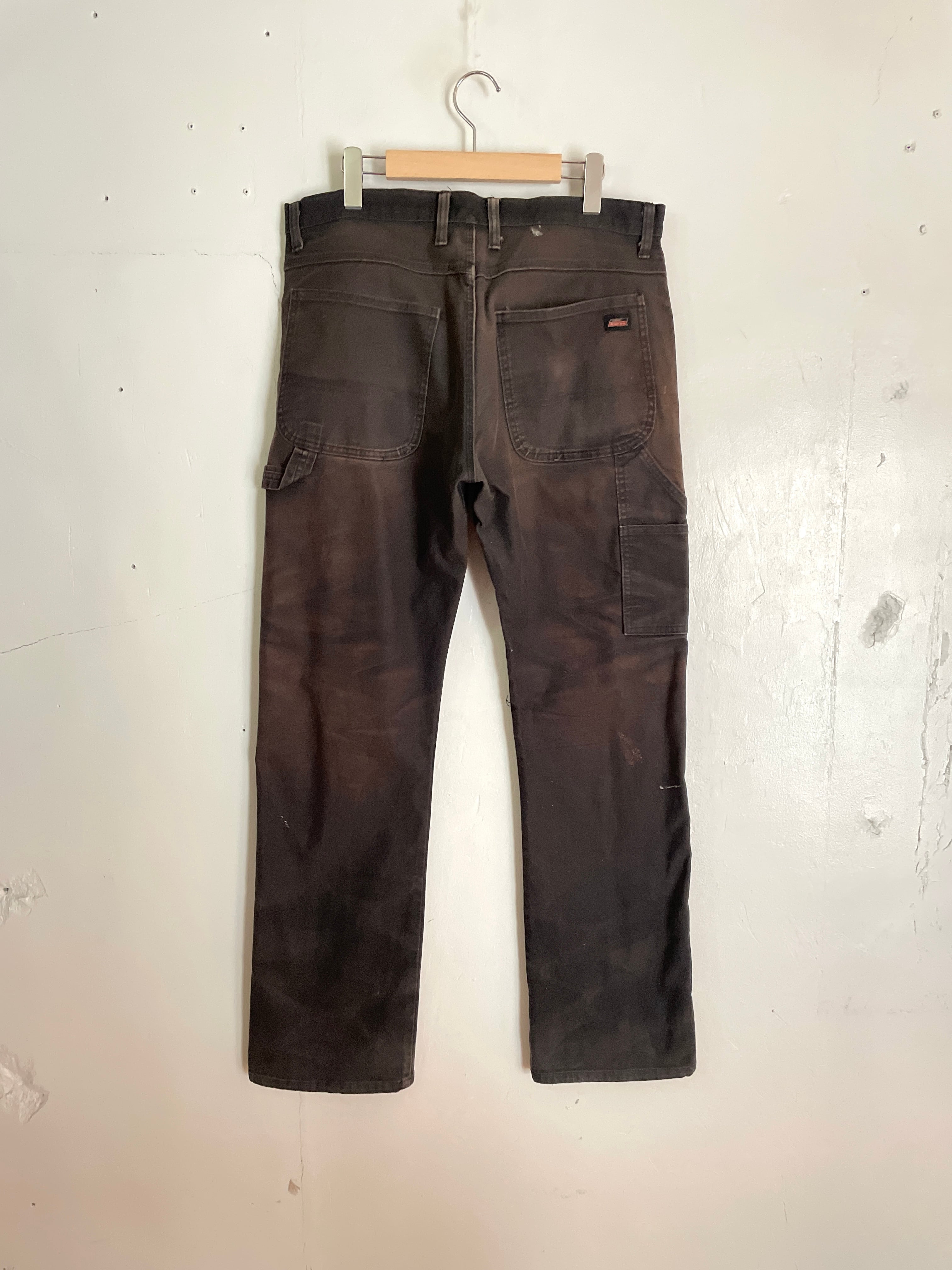暗めのダークブラウンで、所々ペンキ跡が見られるディッキーズのペインターパンツ。ゆったり目の腰回りで、裾に向かってまっすぐ落ちる綺麗なストレートシルエットです。またオールドデニムに見られるような非常に綺麗な色落ちが雰囲気抜群。コットンにスパンデックスが混ざっているため、ストレッチも効いていて穿きやすいです。無骨さのある、カッコいい一本。