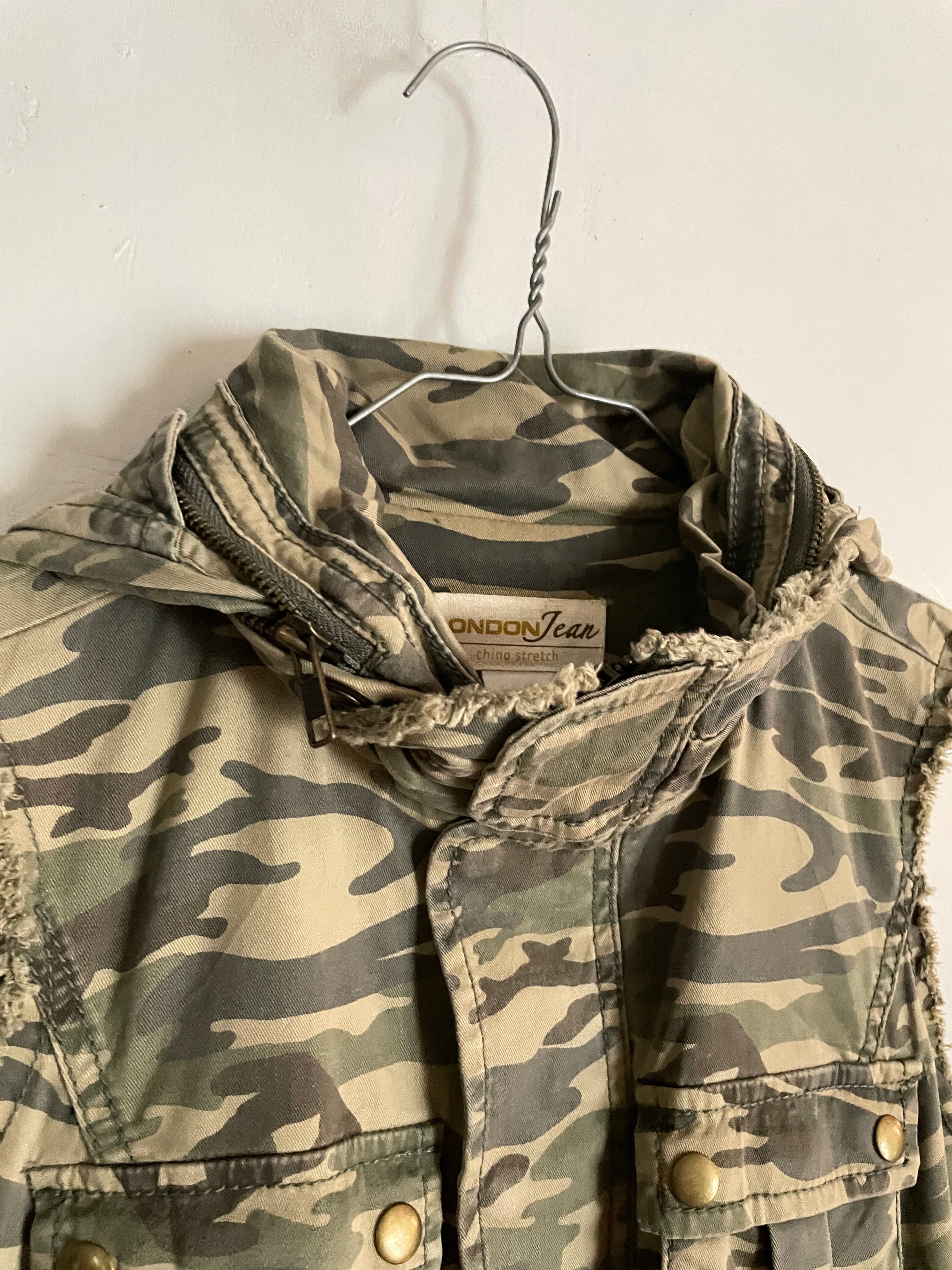 やや褪せた迷彩柄で、袖なし、フード付きのデザインベスト。前開きはジップと、スナップボタンの比翼仕様、フードは収納可能です。やや短丈でハイネック気味のシルエットで、Y2Kの雰囲気も感じられるアイテム。コーディネートにスパイスを与える、お洒落で便利なレイヤードアイテムです。