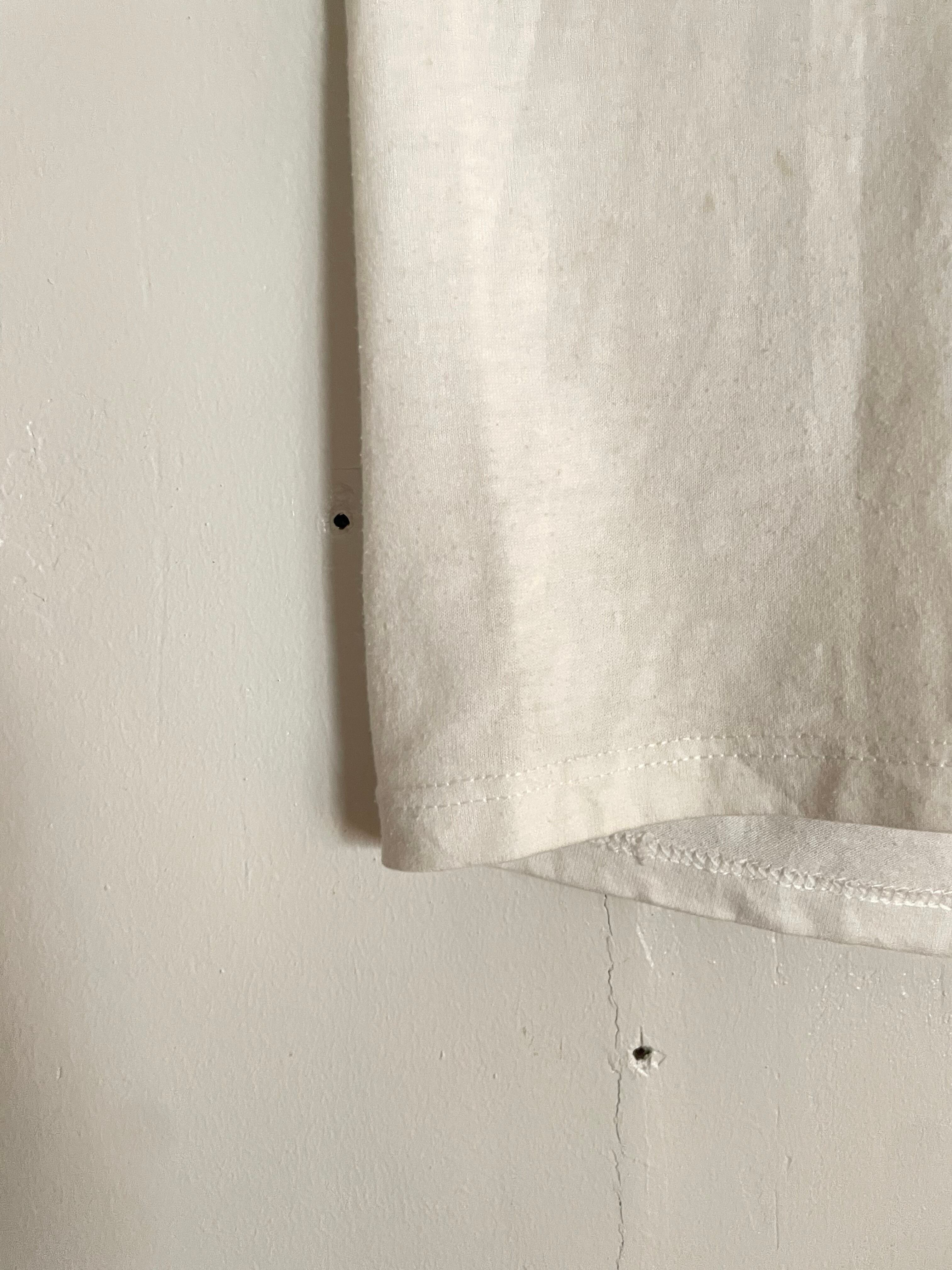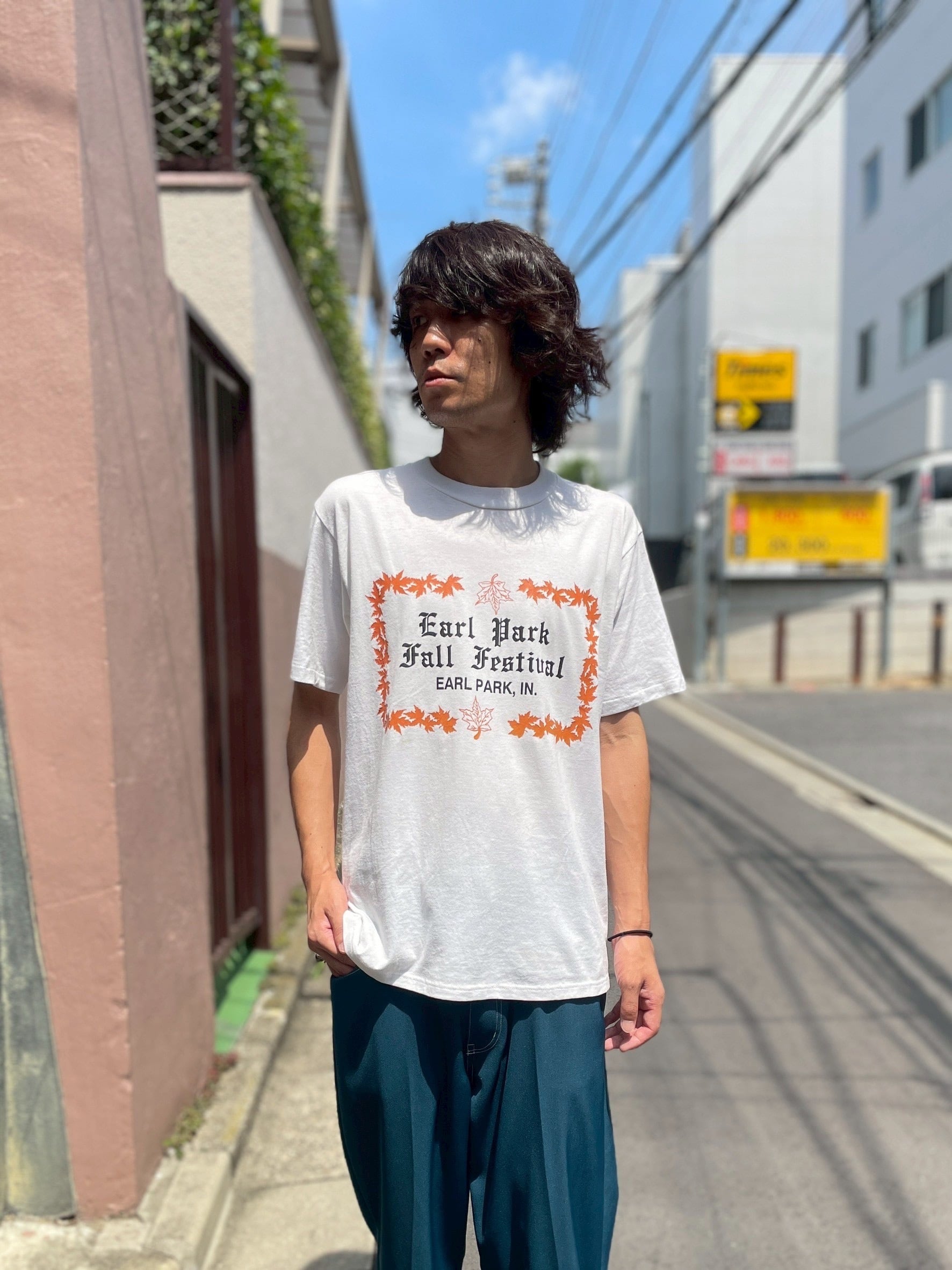 アメリカ合衆国インディアナ州のアール・パークのフォールフェスティバルTシャツです。紅葉がプリントされていて、秋っぽさもありつつ可愛い1枚です。ボディは柔らかめですがしっかりとした質感です。やや丈は長めでイン、アウトどちらでも決まるアイテムです。後ろ右肩に汚れあり。
