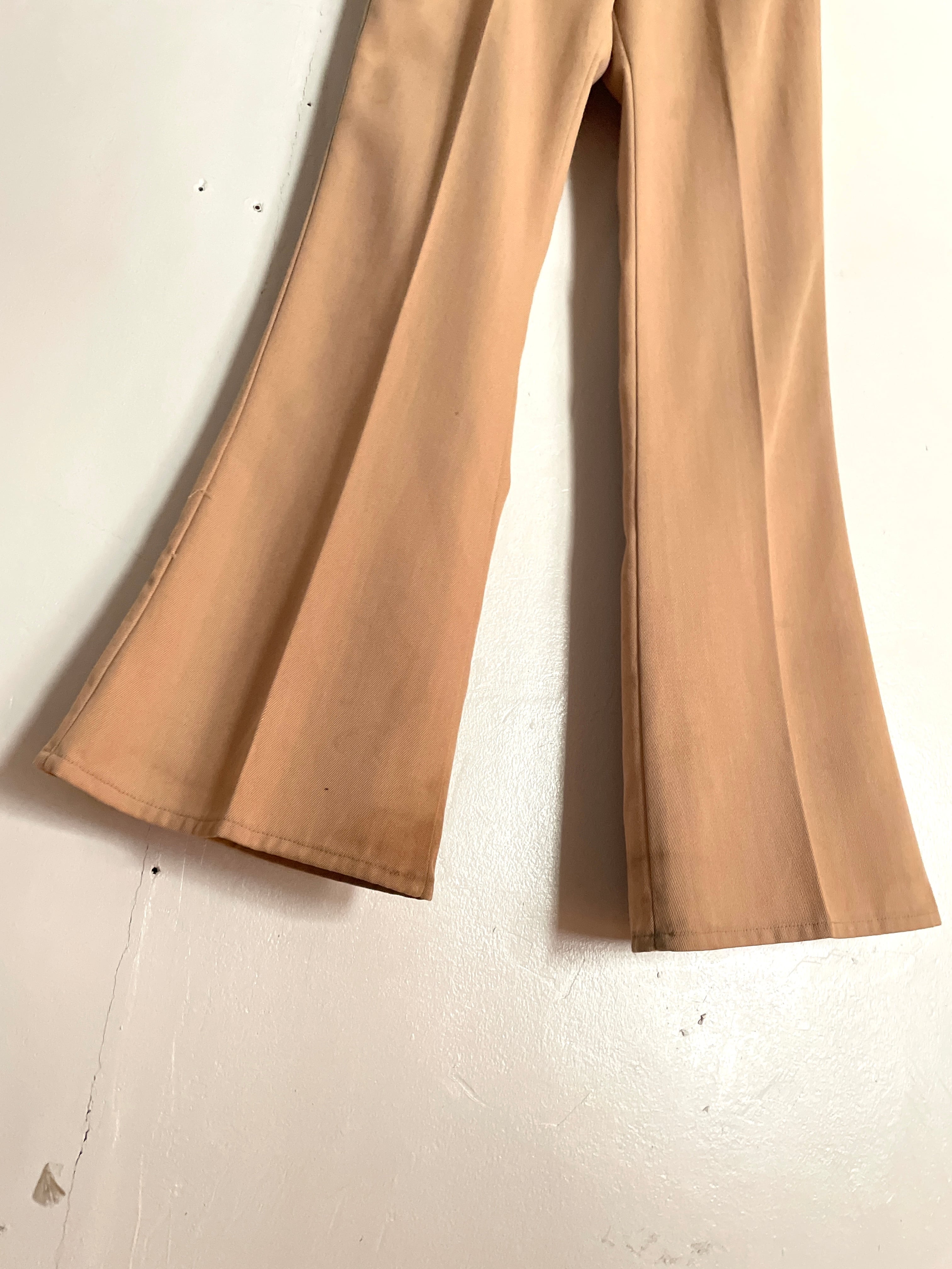 明るめベージュカラーで、縦のラインが非常に綺麗なシルエットのフレアパンツ。素材表記はありませんが、リーバイスのスタプレ、ラングラーのランチャーといったポリスラックスに近い素材感です。年代はおそらく70年代ごろと結構古め。「32LONG」と素材表記があるように確かにレングスはやや長めで、前のオーナーも丈があってなかったのか、かかと部分の汚れが目立ちます。