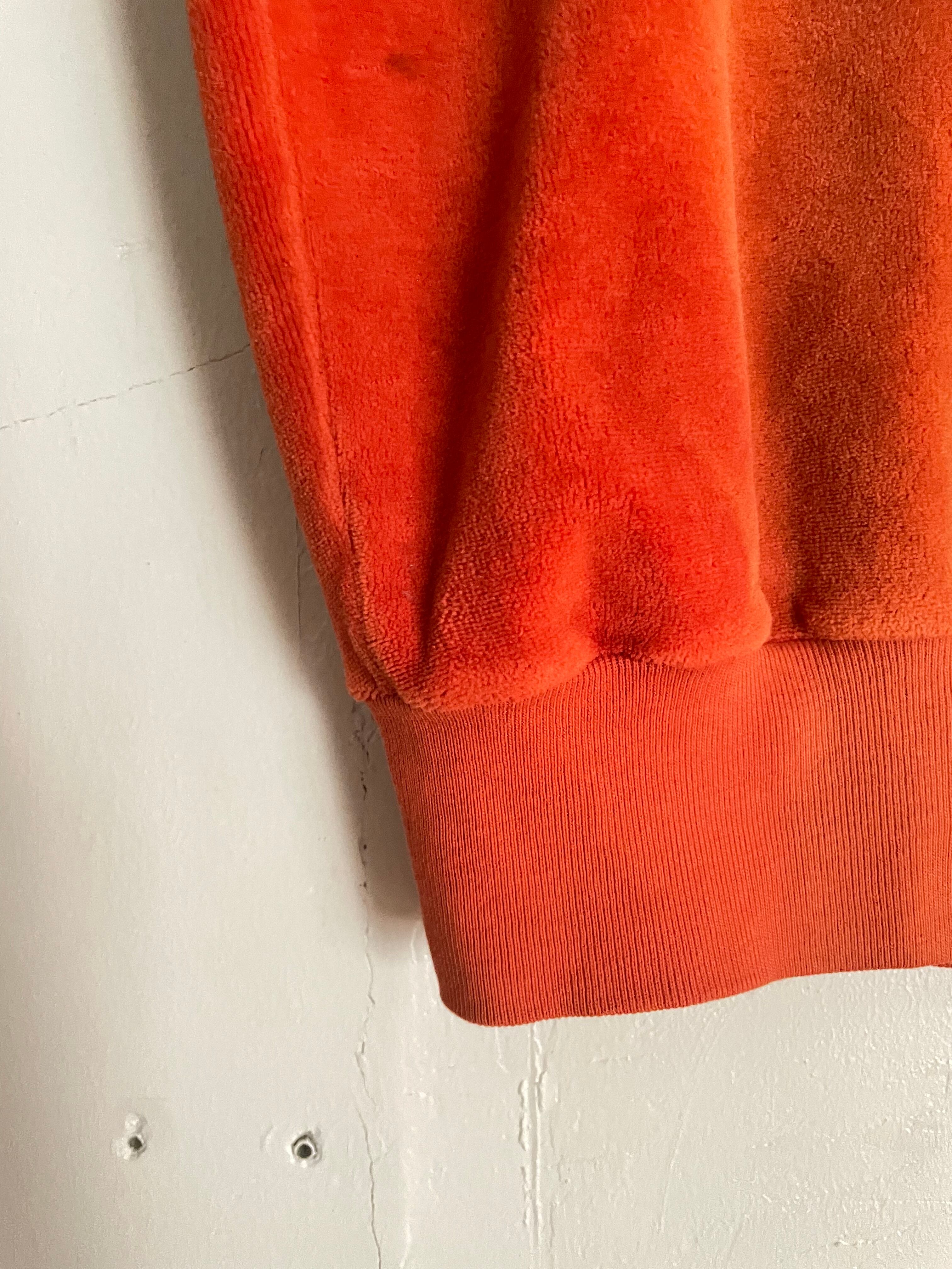 ヴィンテージ感溢れるオレンジカラーの半袖トップス。柔らかいベロア生地を使用しており、光の加減で表情が変わる独特の風合いが魅力的です。胸元はレースアップ仕様になっており、カジュアルさの中に遊び心があります。ゆったりとしたシルエットとリブの聞いた裾が、リラックスする着心地です。中央に黒のシミがありますが古着ならではの使用感が1点ものとしての存在感を高めています。