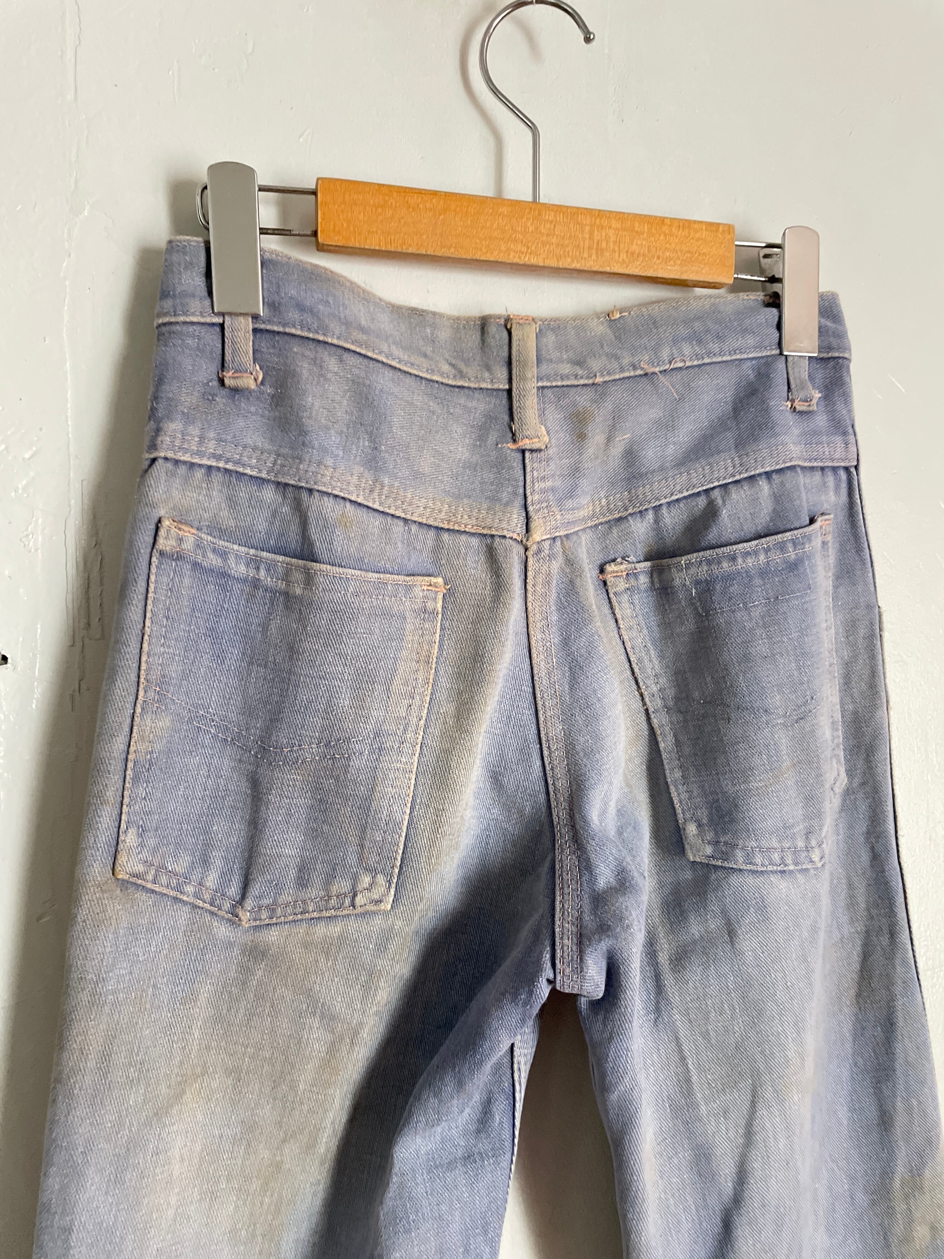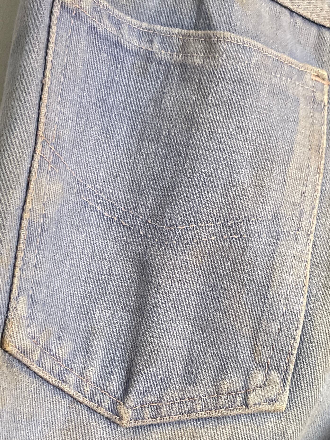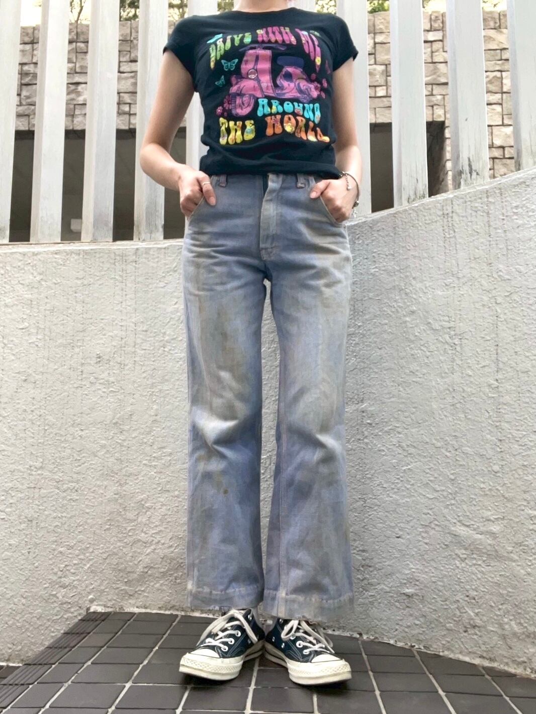 かなり褪せた色落ち具合で、穿き込まれた感のある雰囲気抜群のデニムパンツ。裾に丈詰めの跡が見られ、若干フレアした綺麗なシルエットです。よく見るとステッチ糸にピンクを使っていたり、前開きトップボタンに$マークの刻印が入っていたりと面白い仕様。ブランド等わからない部分は多いですが、古着のパンツらしさを感じる、十分存在感のある一本です。