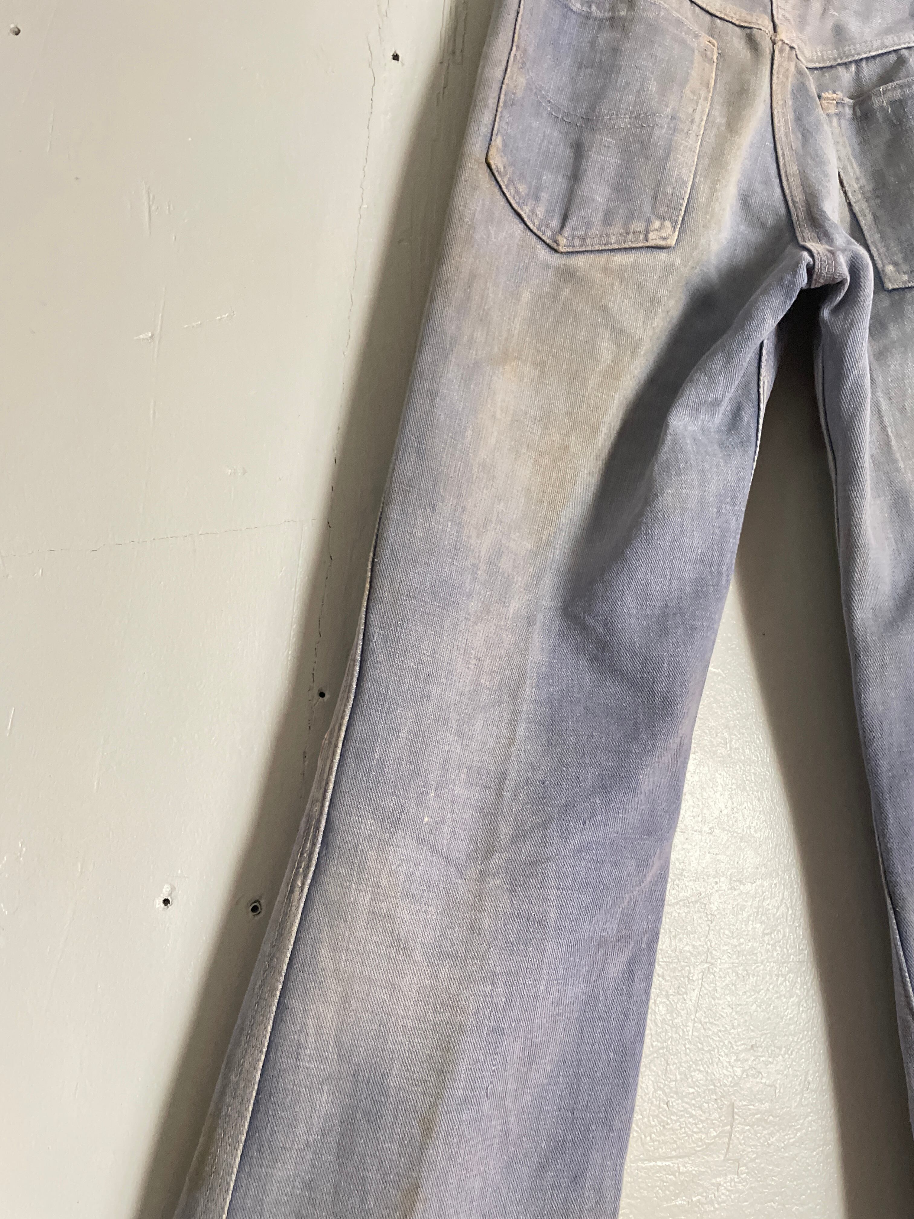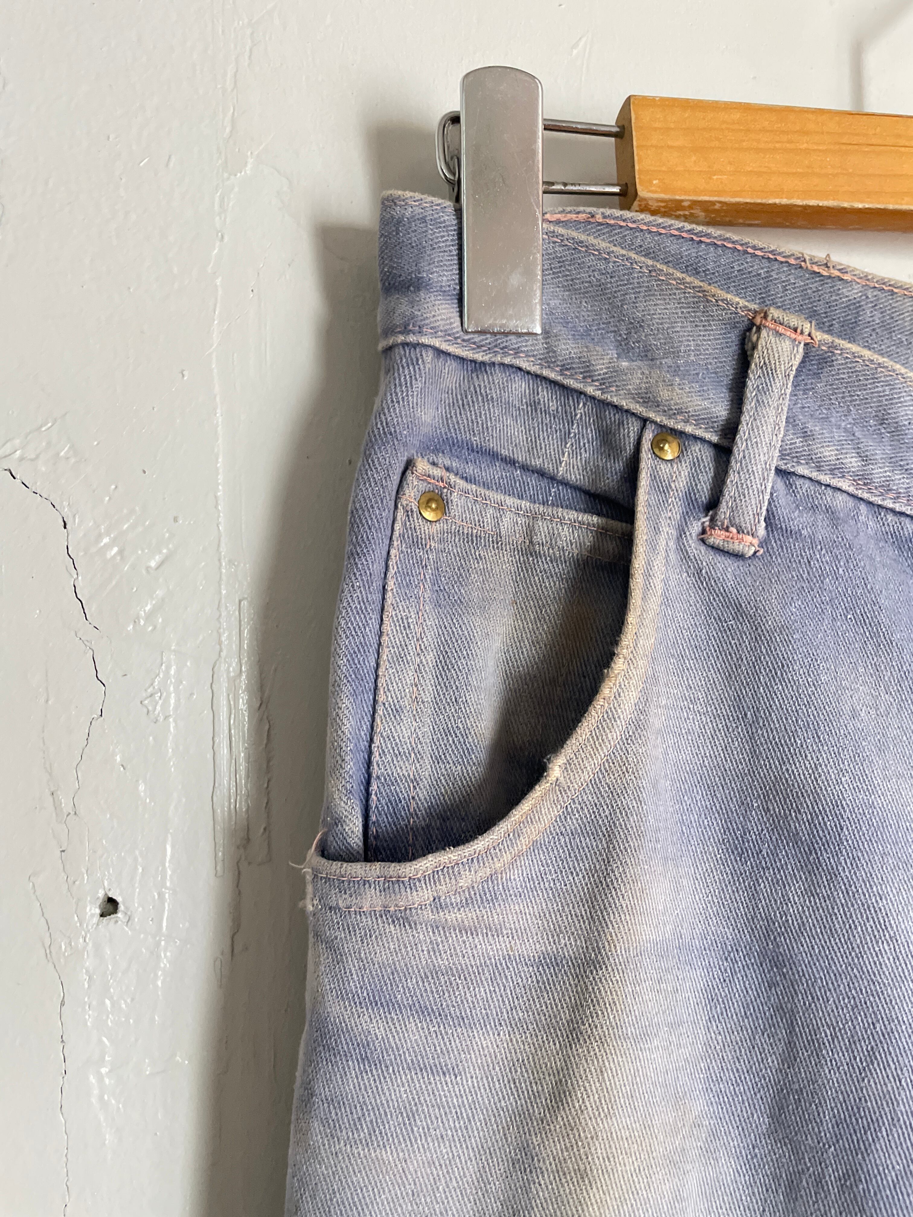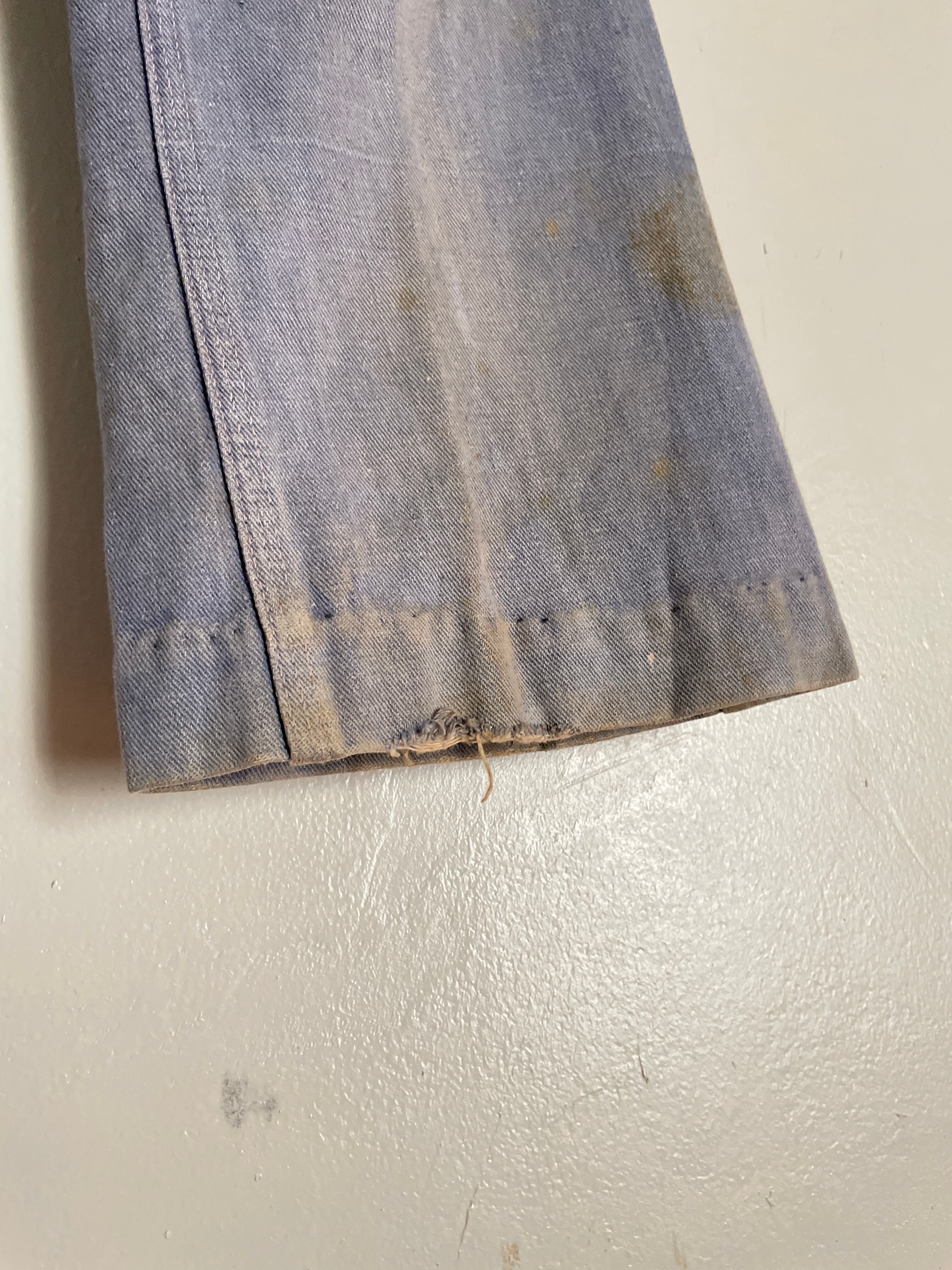 かなり褪せた色落ち具合で、穿き込まれた感のある雰囲気抜群のデニムパンツ。裾に丈詰めの跡が見られ、若干フレアした綺麗なシルエットです。よく見るとステッチ糸にピンクを使っていたり、前開きトップボタンに$マークの刻印が入っていたりと面白い仕様。ブランド等わからない部分は多いですが、古着のパンツらしさを感じる、十分存在感のある一本です。