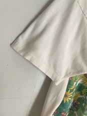 ホワイトボディに、色鮮やかな花や昆虫がプリントされたTシャツ。リアルでアート感のあるプリントデザインが魅力的です。短丈めなシルエットに対して、身幅はたっぷりな今っぽいシルエット。夏っぽさもしっかりと感じられるお洒落な一着です。92年のコピーライト入りで、USA製のアイテムです。所々に汚れが見られますが、古着ならではの味が感じられるTシャツです。