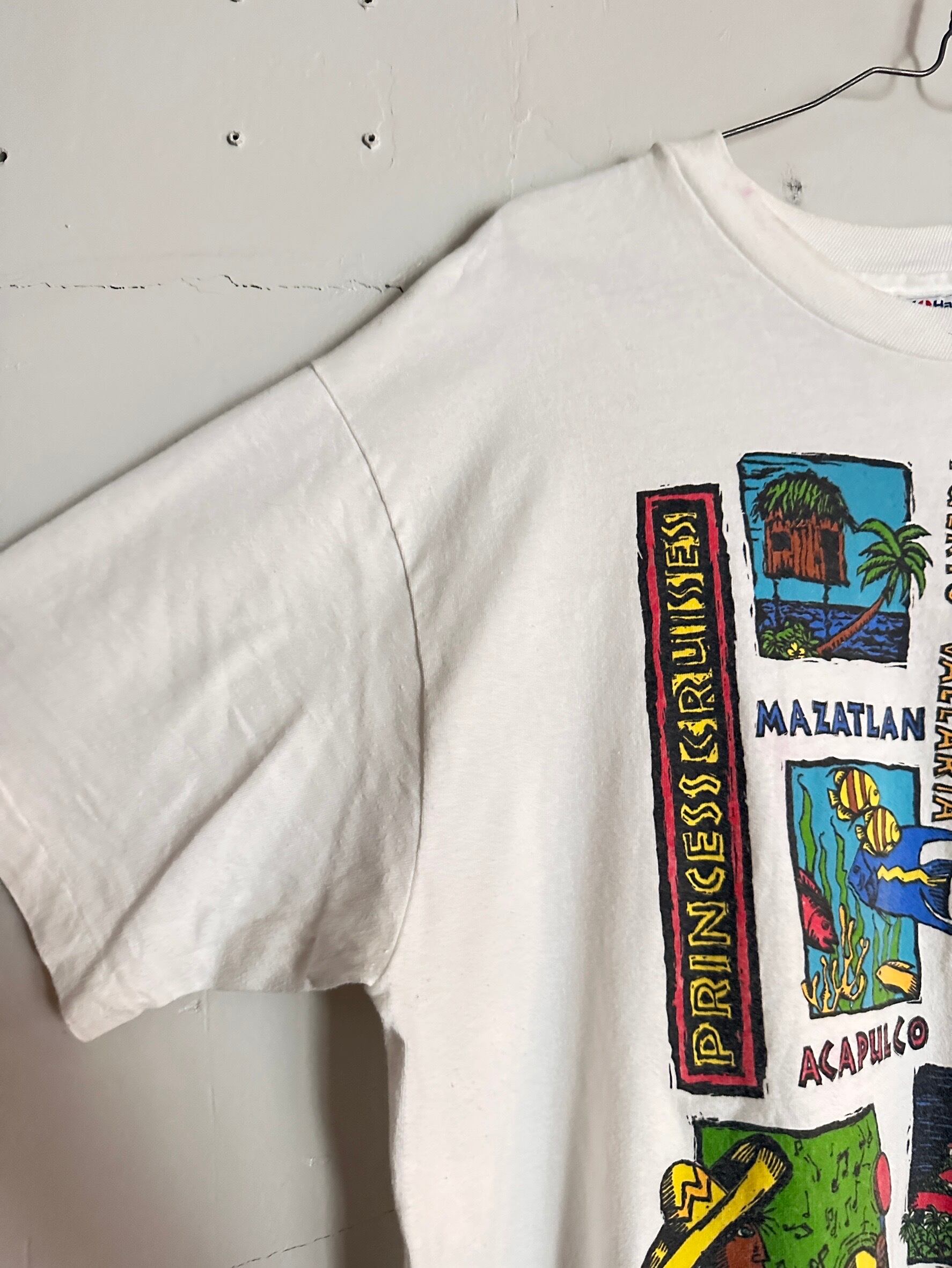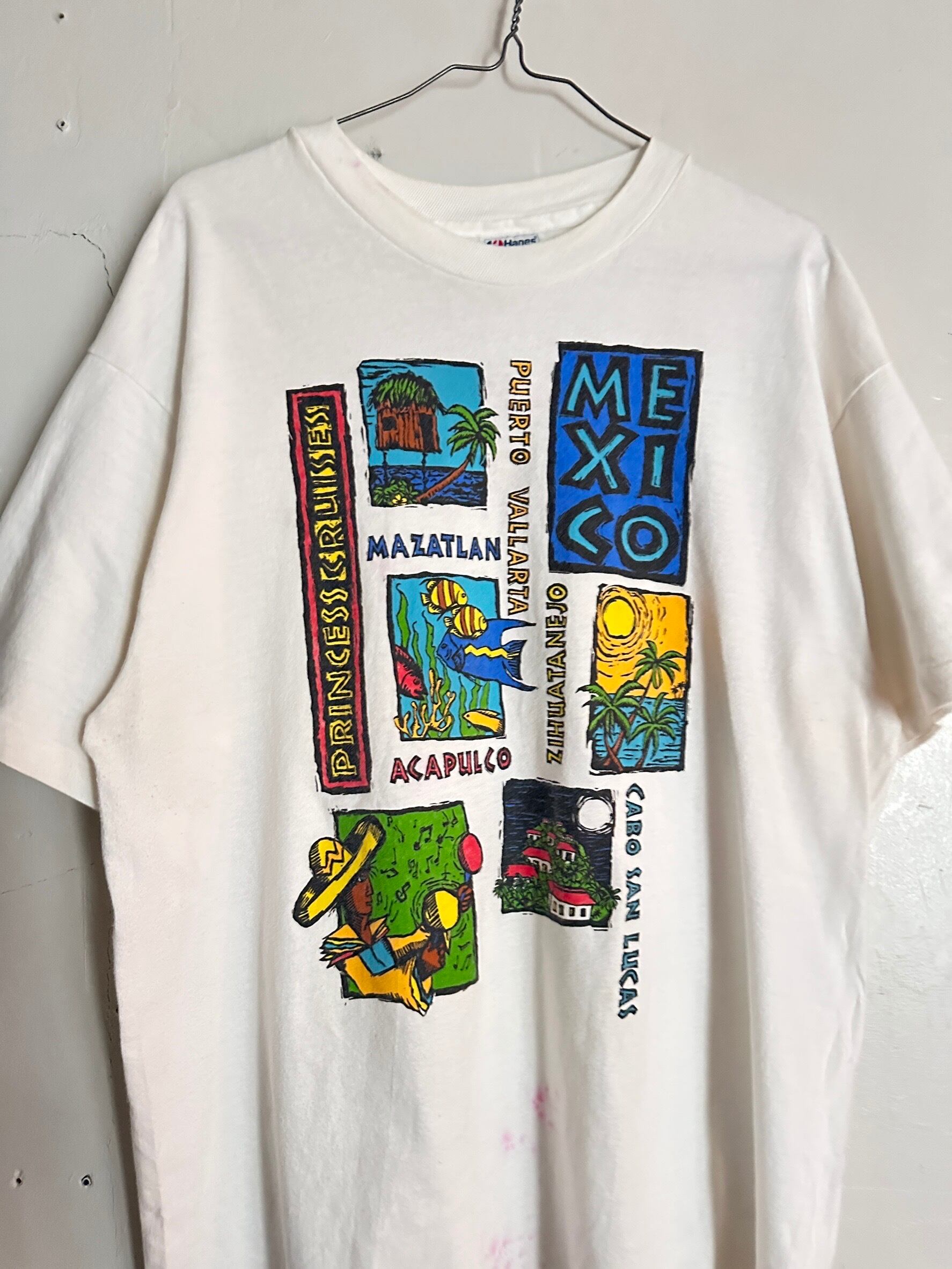 90年代らしいオーバーサイズのTシャツ。様々なメキシコの絵画のようなものがプリントされていて、独特なタッチで描かれたデザインは、少し違った角度でメキシコを感じられます。またサイズ感も大きめで、太めのボトムスと相性抜群な一枚になっております。