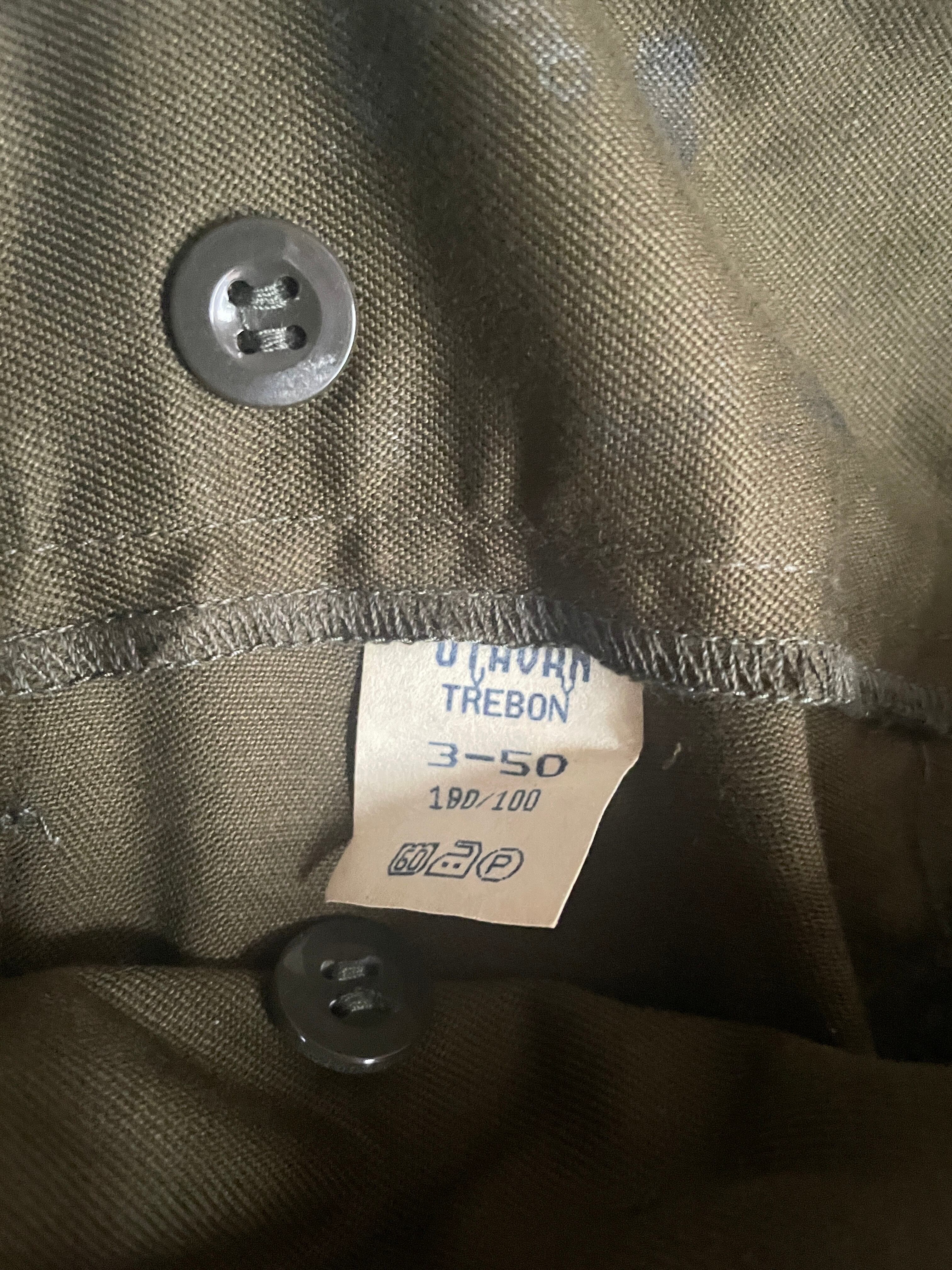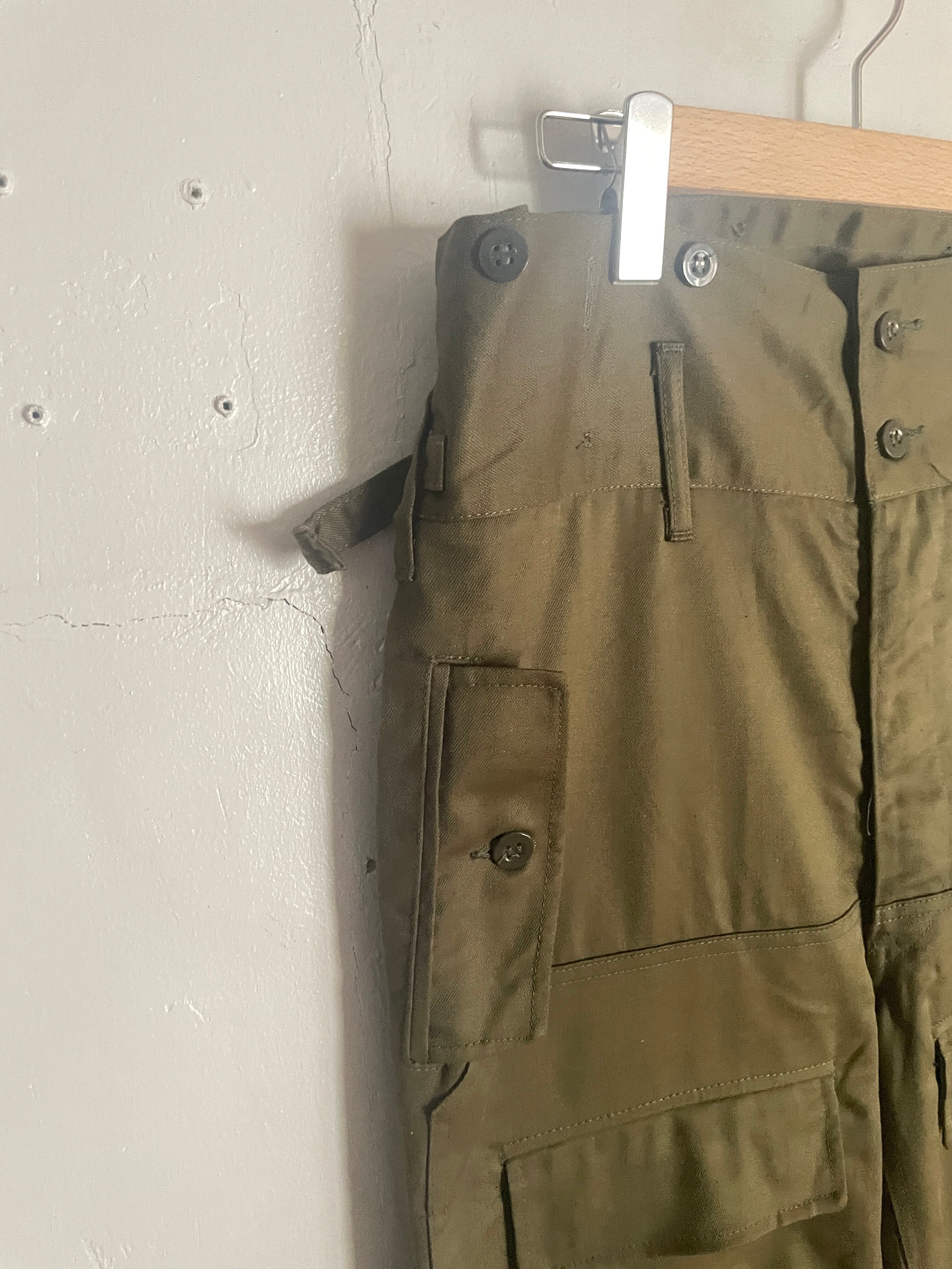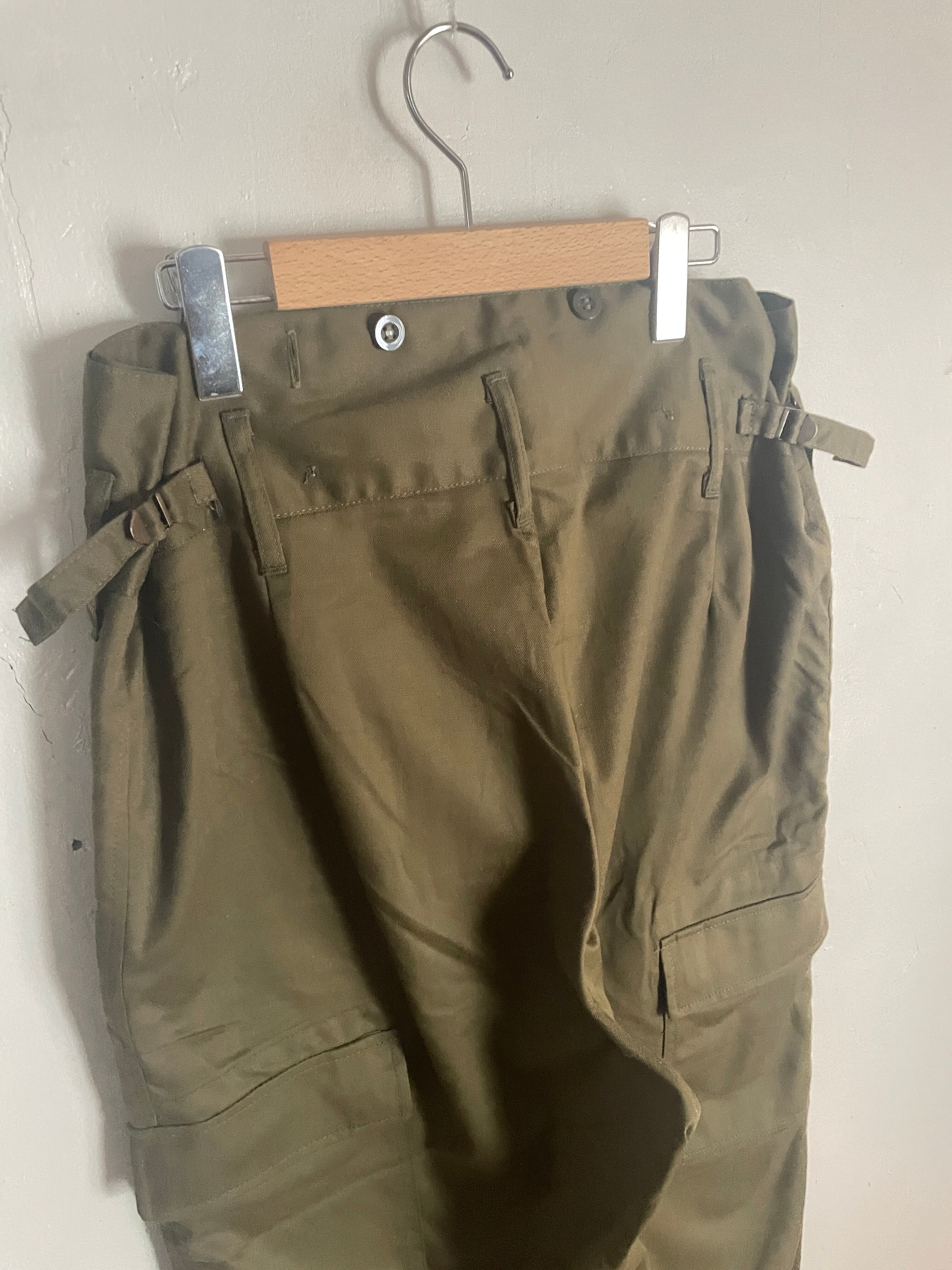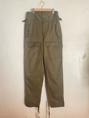 カーキカラーで、ハイウエストデザインでポケットが豊富な、チェコ軍のカーゴパンツ。アジャスタ付きで腰回りのサイズ感は調節可能です。サスペンダーボタン付きなので、こなれた雰囲気で着こなせそうです。わたりから裾にかけてテーパードがかったシルエット。裾部分には紐付きで、スリット仕様になっていてフレアっぽくも履けるお洒落な一本。
