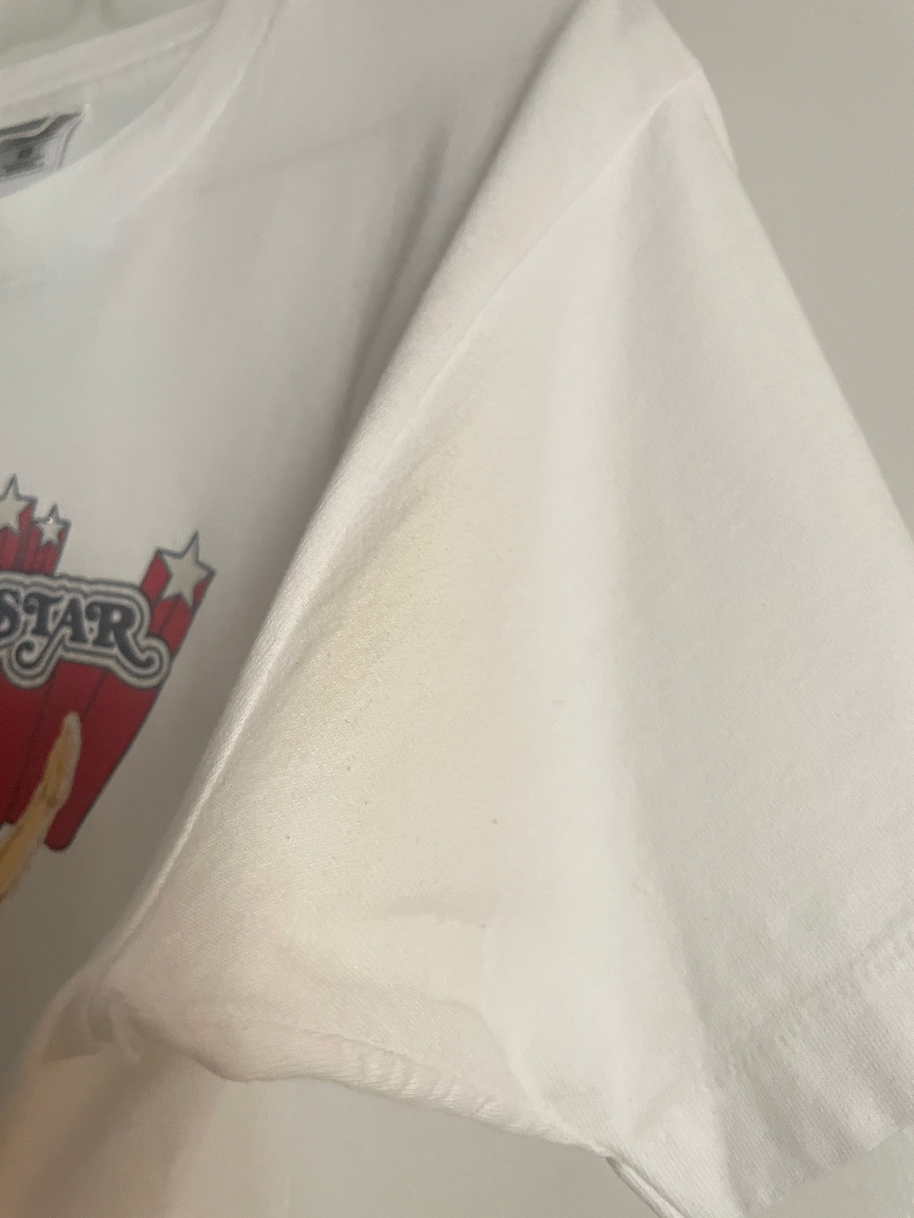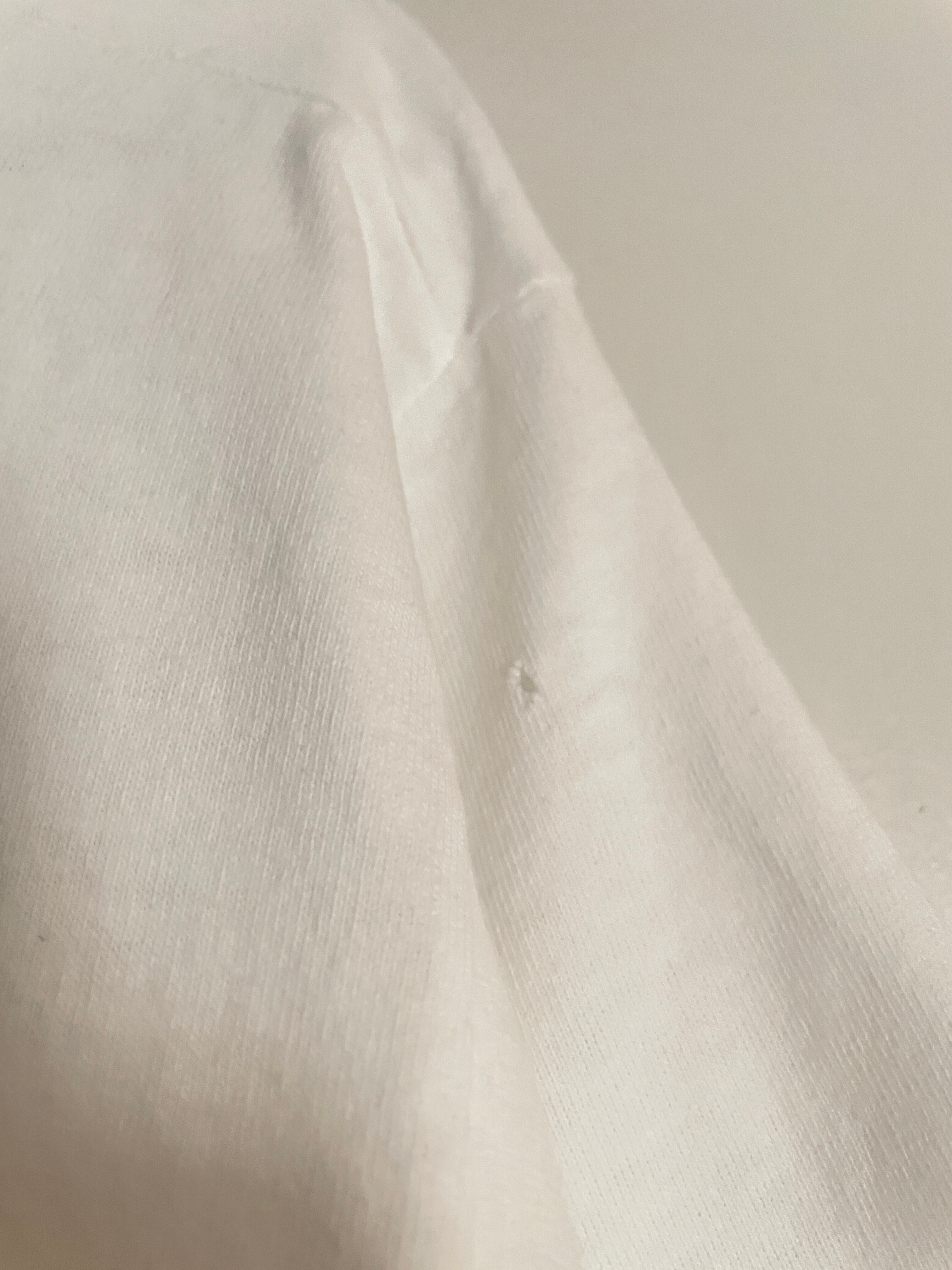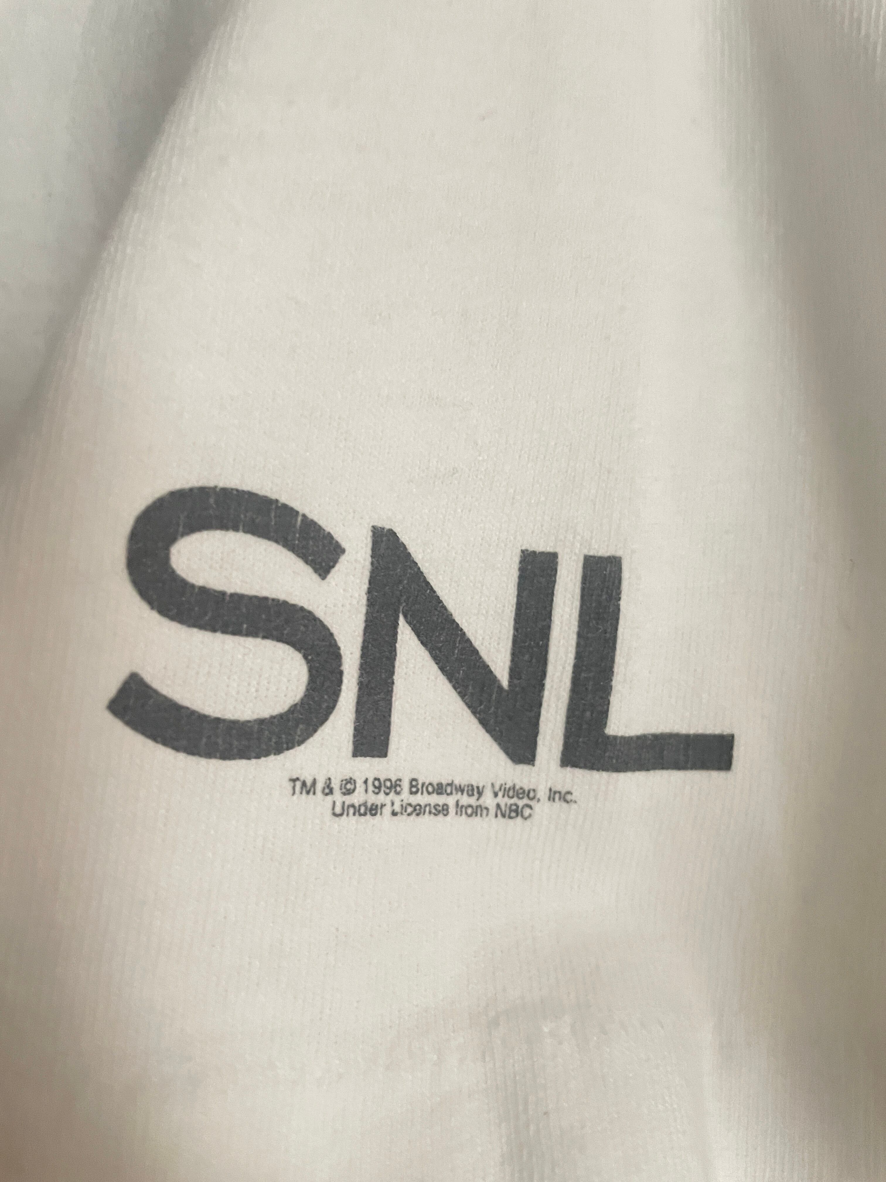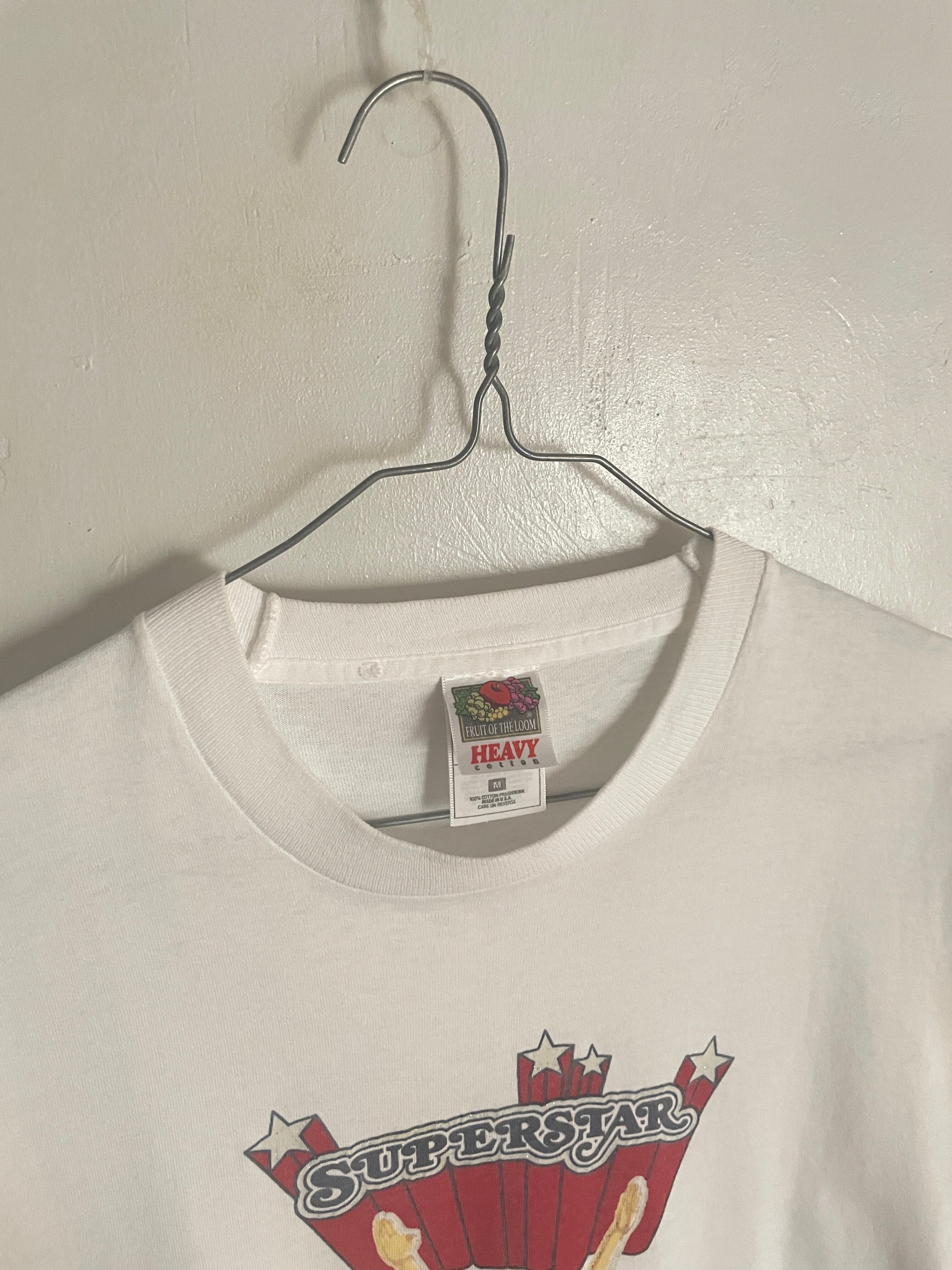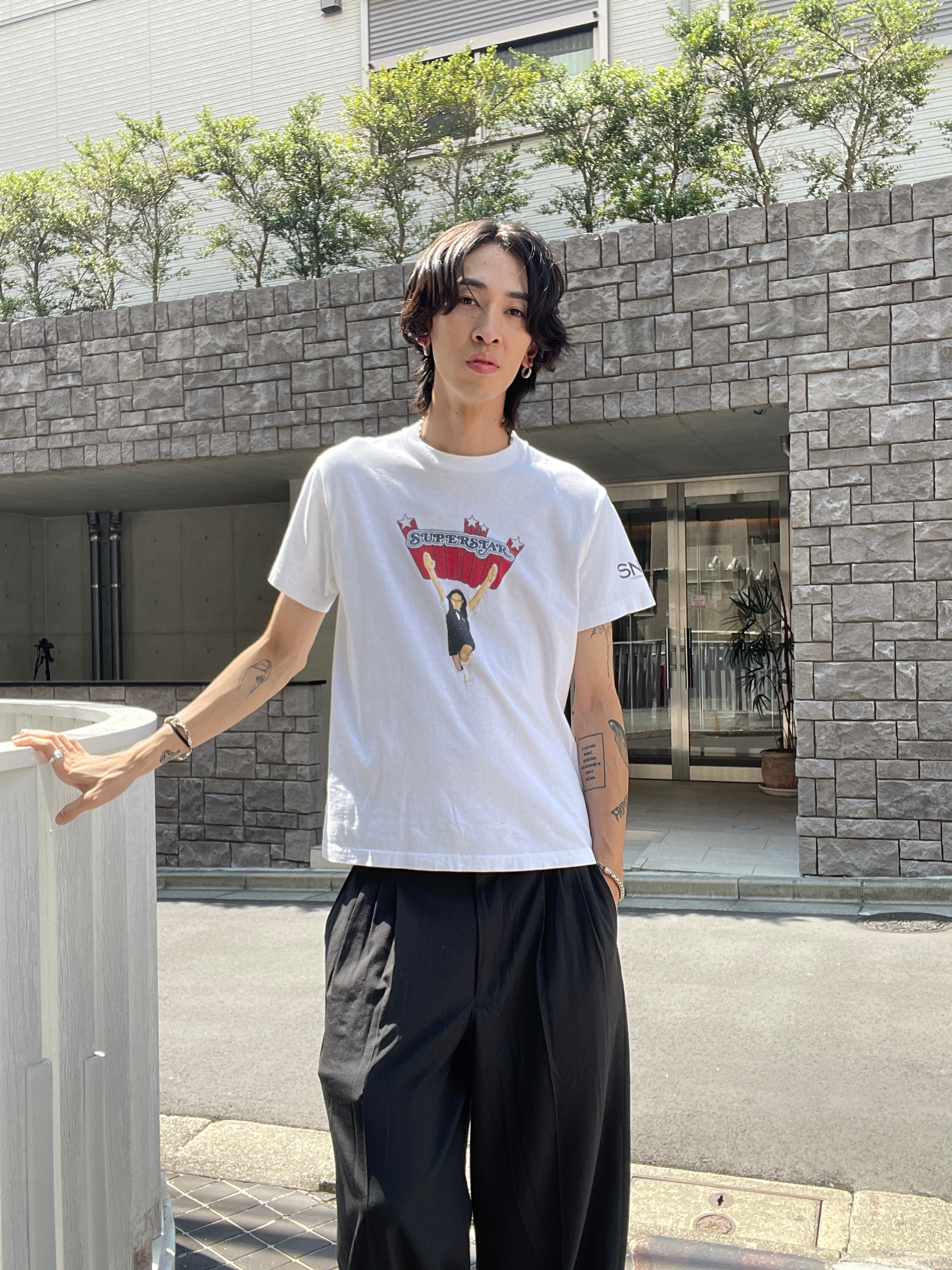 ホワイトボディに、コミカルでコンパクトめなプリントが施されたTシャツ。”SUPERSTAR"の下に制服姿の女性が面白いポーズでプリントされています。左袖部分に”SNL"とプリントがあり、調べてみると、サタデーナイトライブという、アメリカで75年から放送されている長寿番組のようです。プリントとどういった関連があるのかは不明ですが、デザインの効いたお洒落な一着です。大き過ぎず、小さ過ぎないサイズ感なので、男女共におすすめしたい一着です。シングルステッチで、USA製のアイテムです。