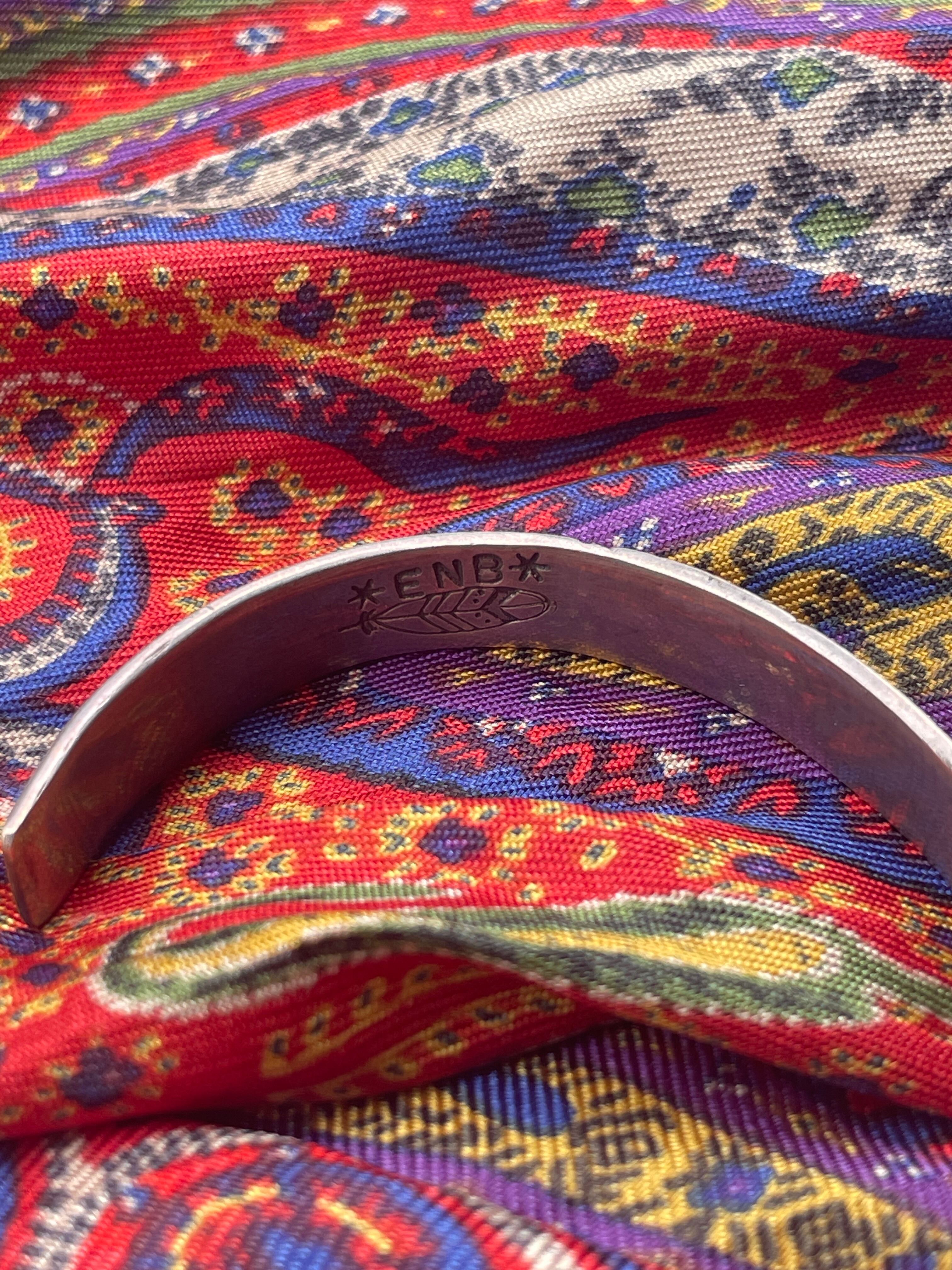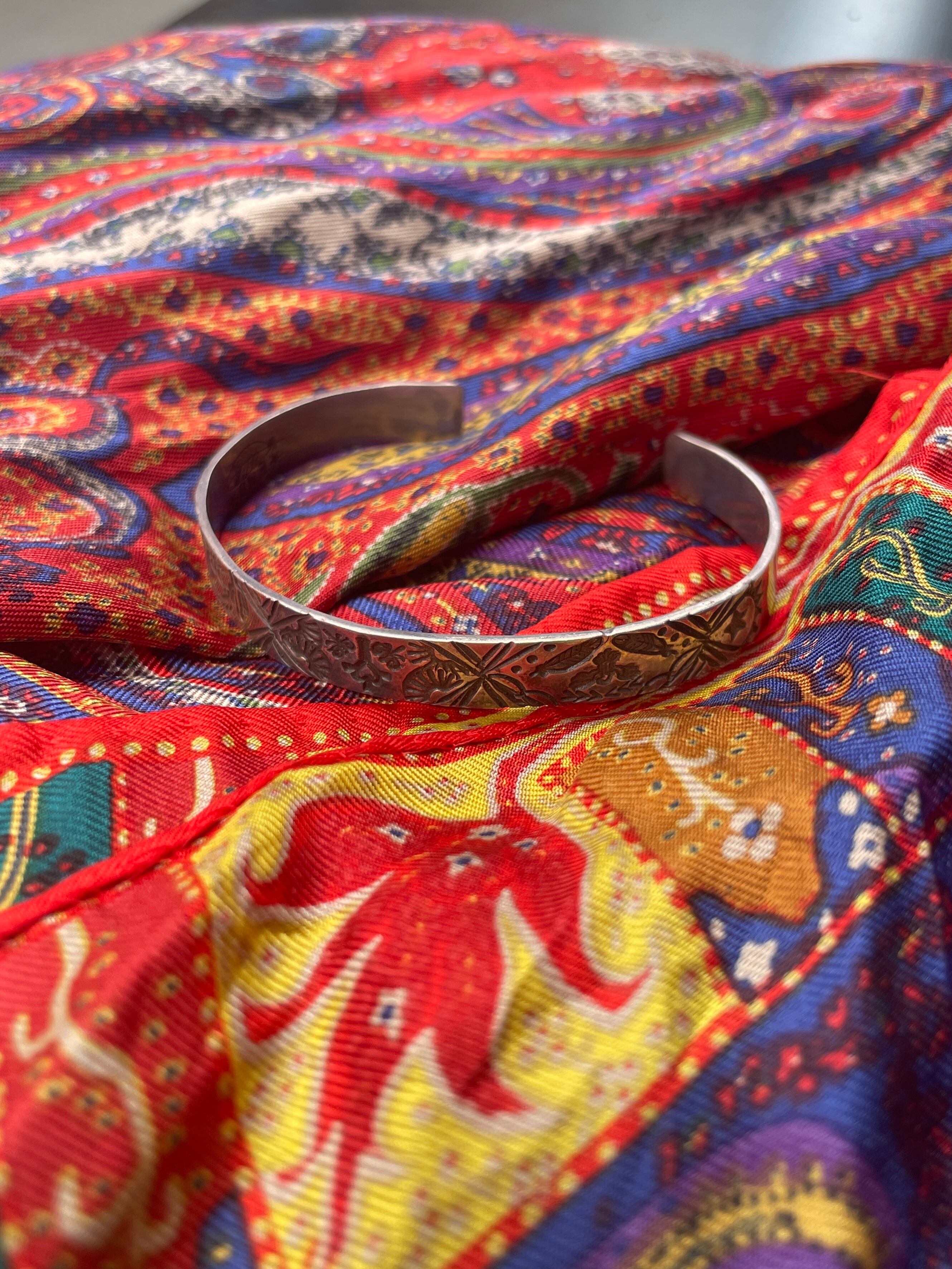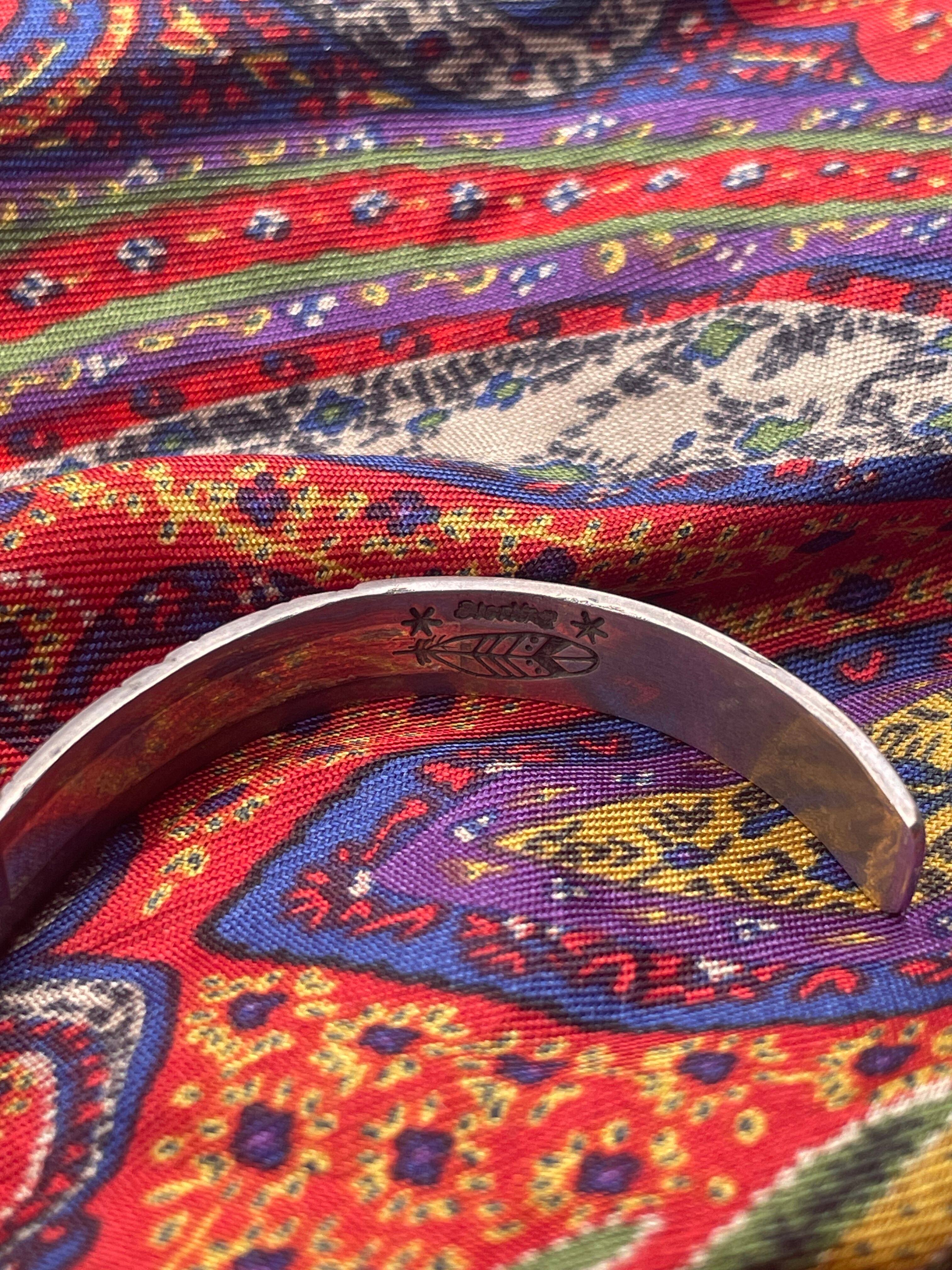 光沢のあるスターリングシルバーで、ネイティブ調のお洒落な柄が刻まれたバングル。細めで付けやすいタイプです。サボテンやハートなど、可愛らしさと渋さがミックスしたようなデザインになっています。こういったデザイン性に優れたアクセサリーは、今の時期には欠かせないアイテムかと思います。