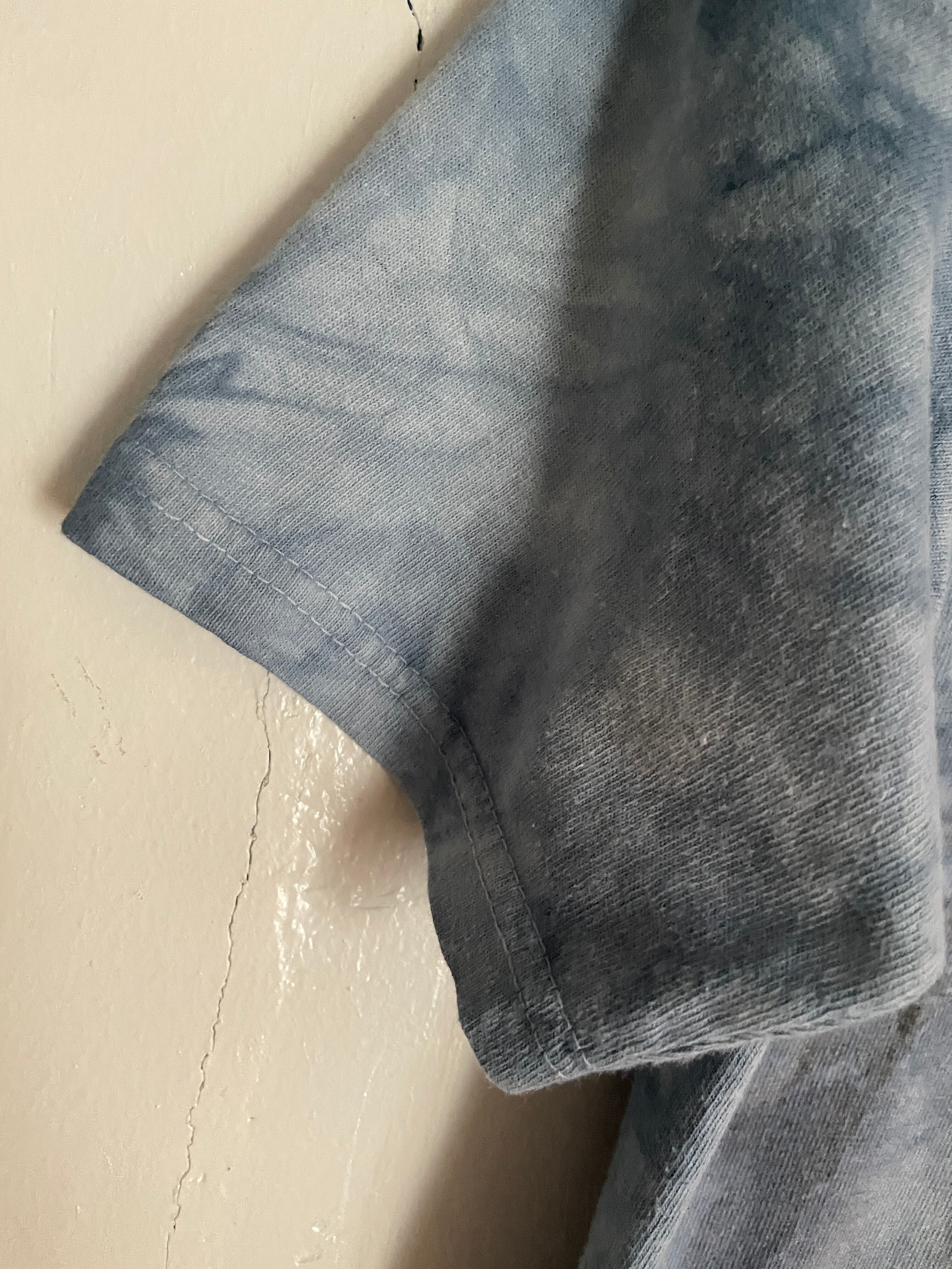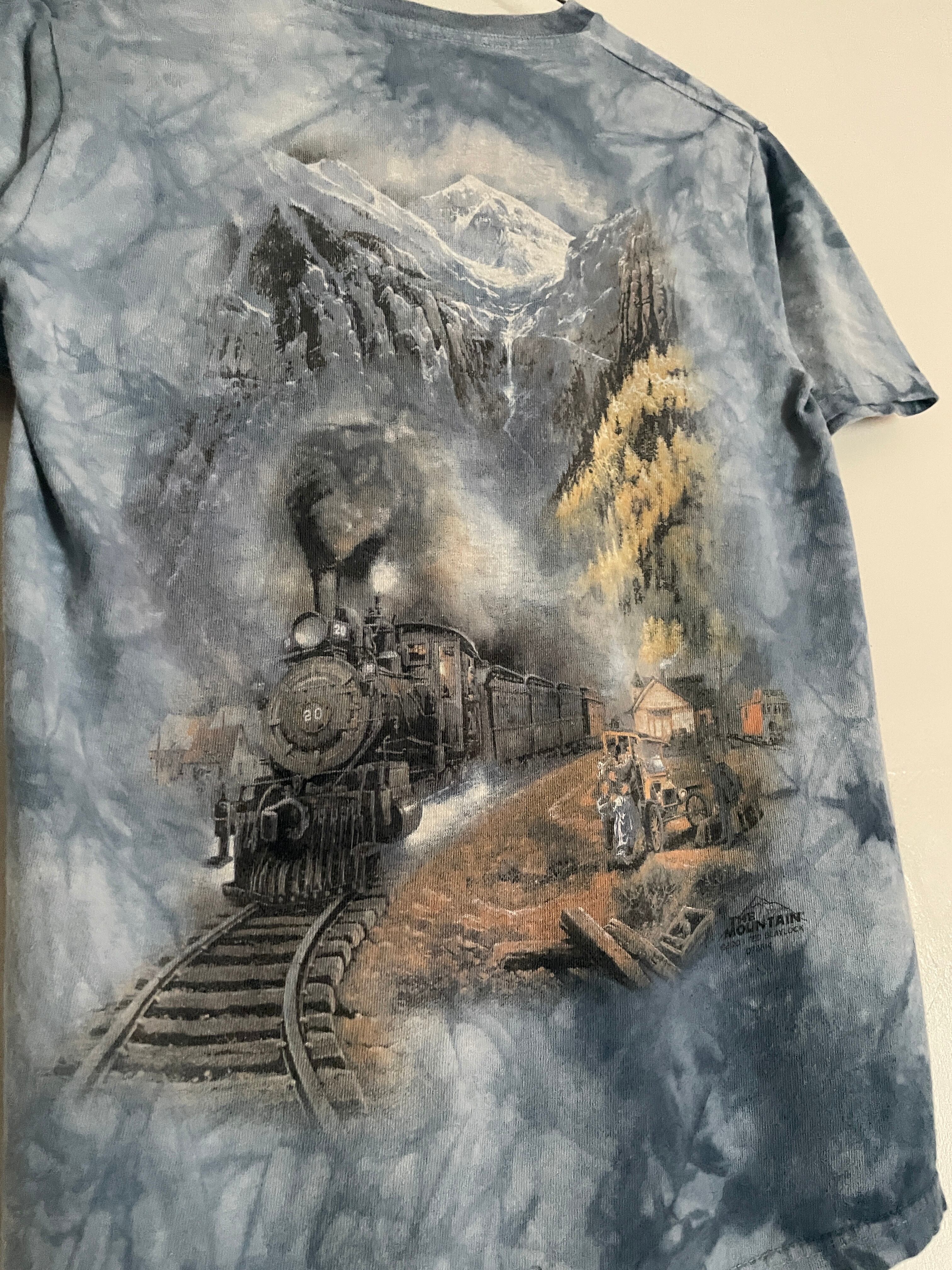 鮮やかなブルーベースのタイダイボディに、機関車や山などが両面プリントされたTシャツ。ネイチャーテイストなプリントがグッド。ブルーベースのタイダイは空を表現している様です。デザインの効いた、こだわりが詰まった一着です。タイトめなサイズ感で、ワイドパンツやフレアパンツなどとは相性抜群です。