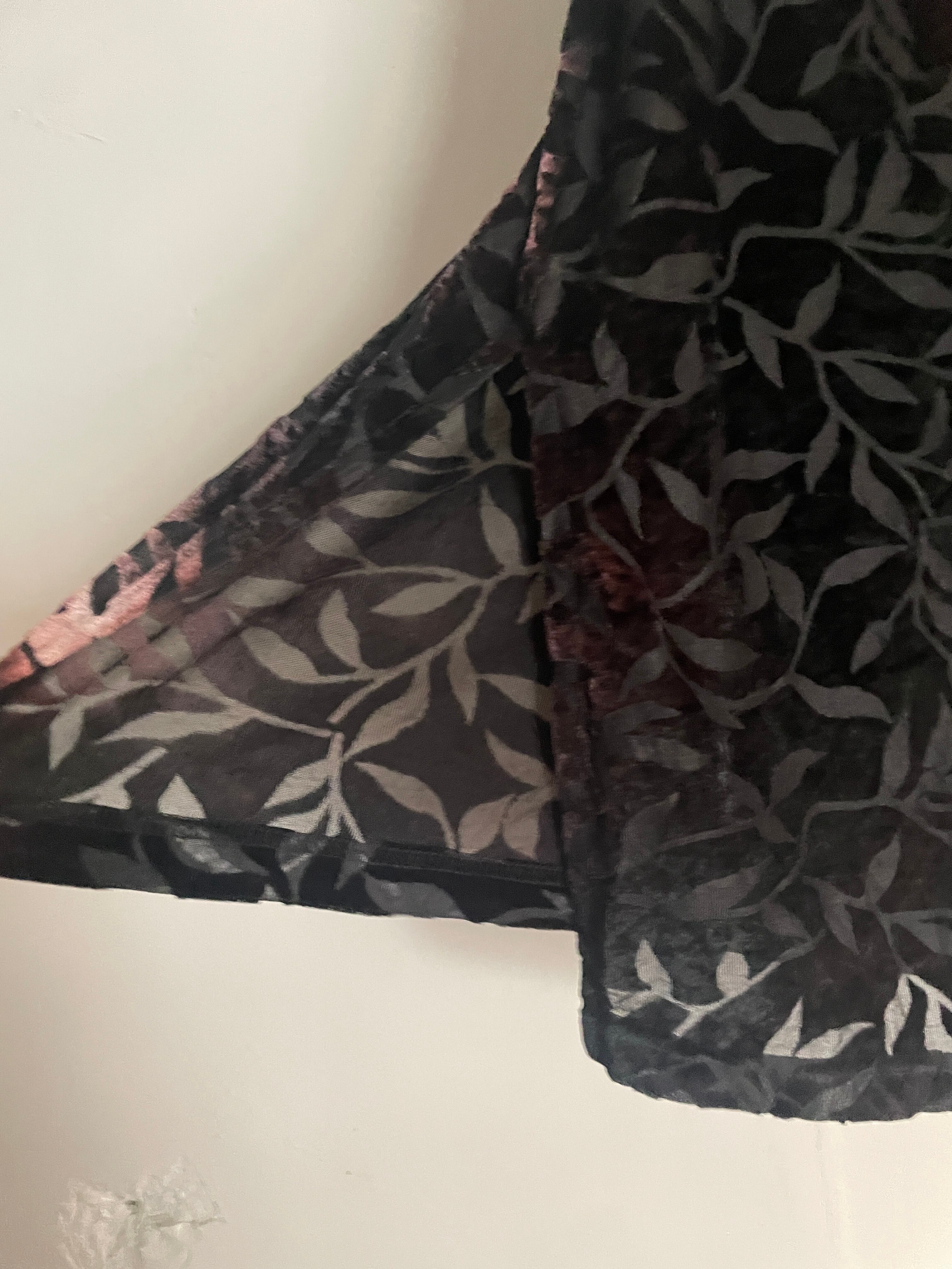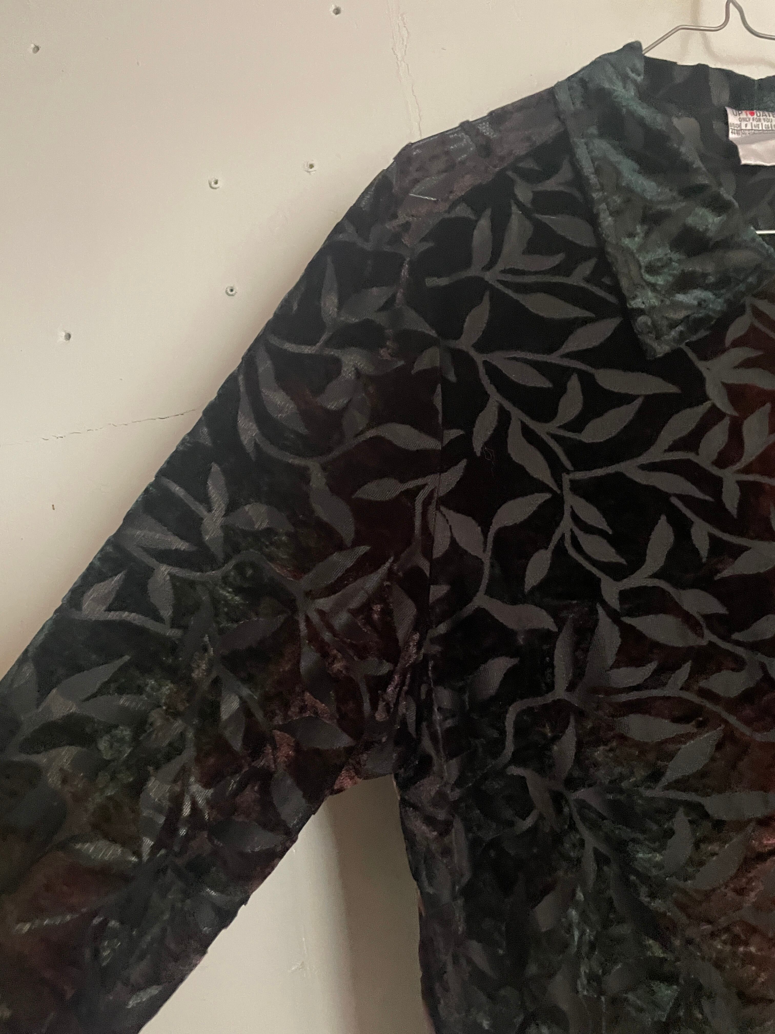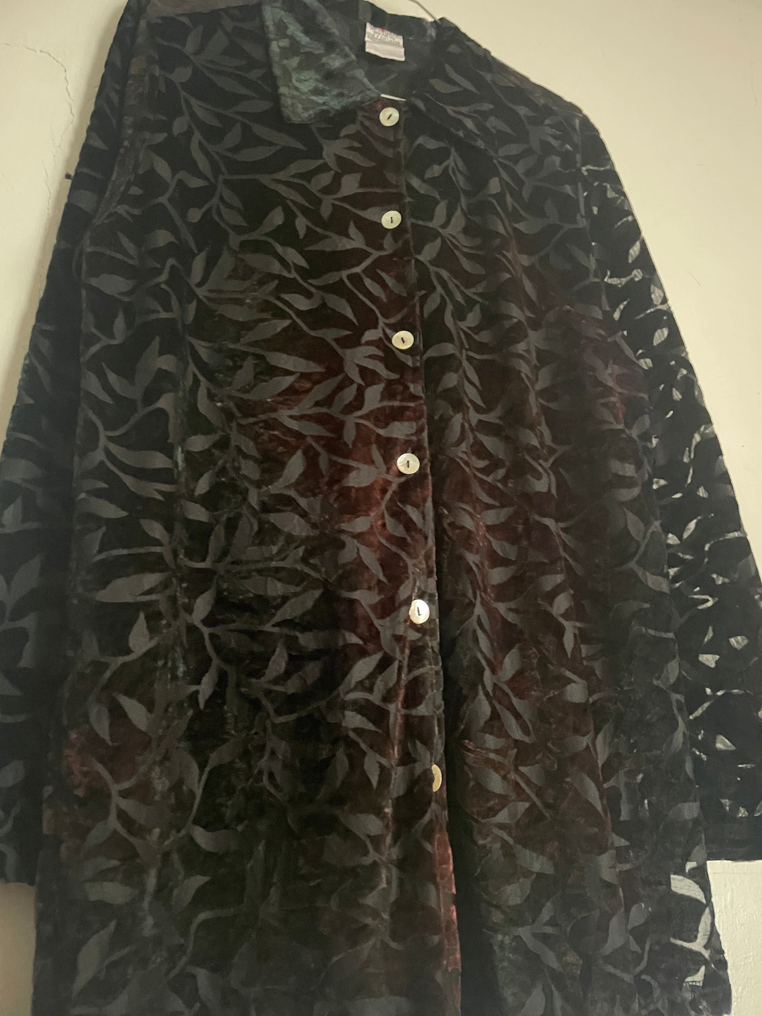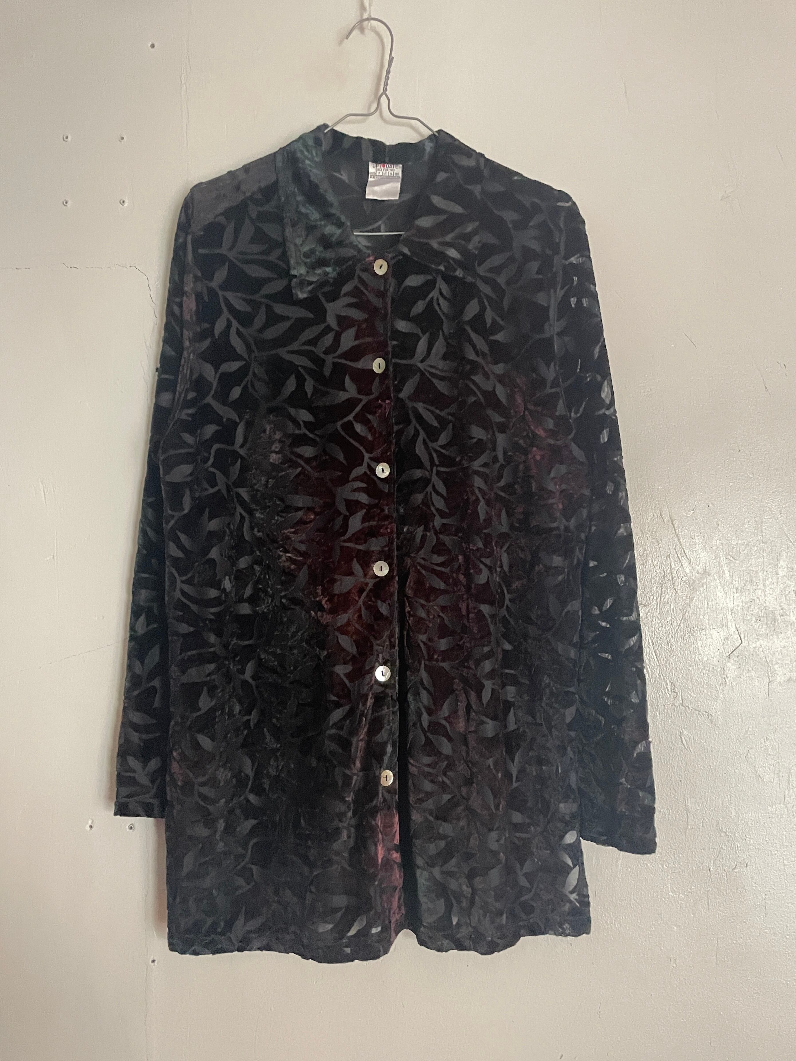 ブラックボディをベースに、グラデーションの様な柄デザインが魅力的な、シースルーシャツ。柄部分はベロアのような素材感になっています。レーヨンとポリの伸びの良い上品な質感。裾横には深めなスリット入り。デザインにこだわったお洒落な一着です。女性の方にはもちろんですが、男性の方もモードっぽく着たら雰囲気が出そうです。
