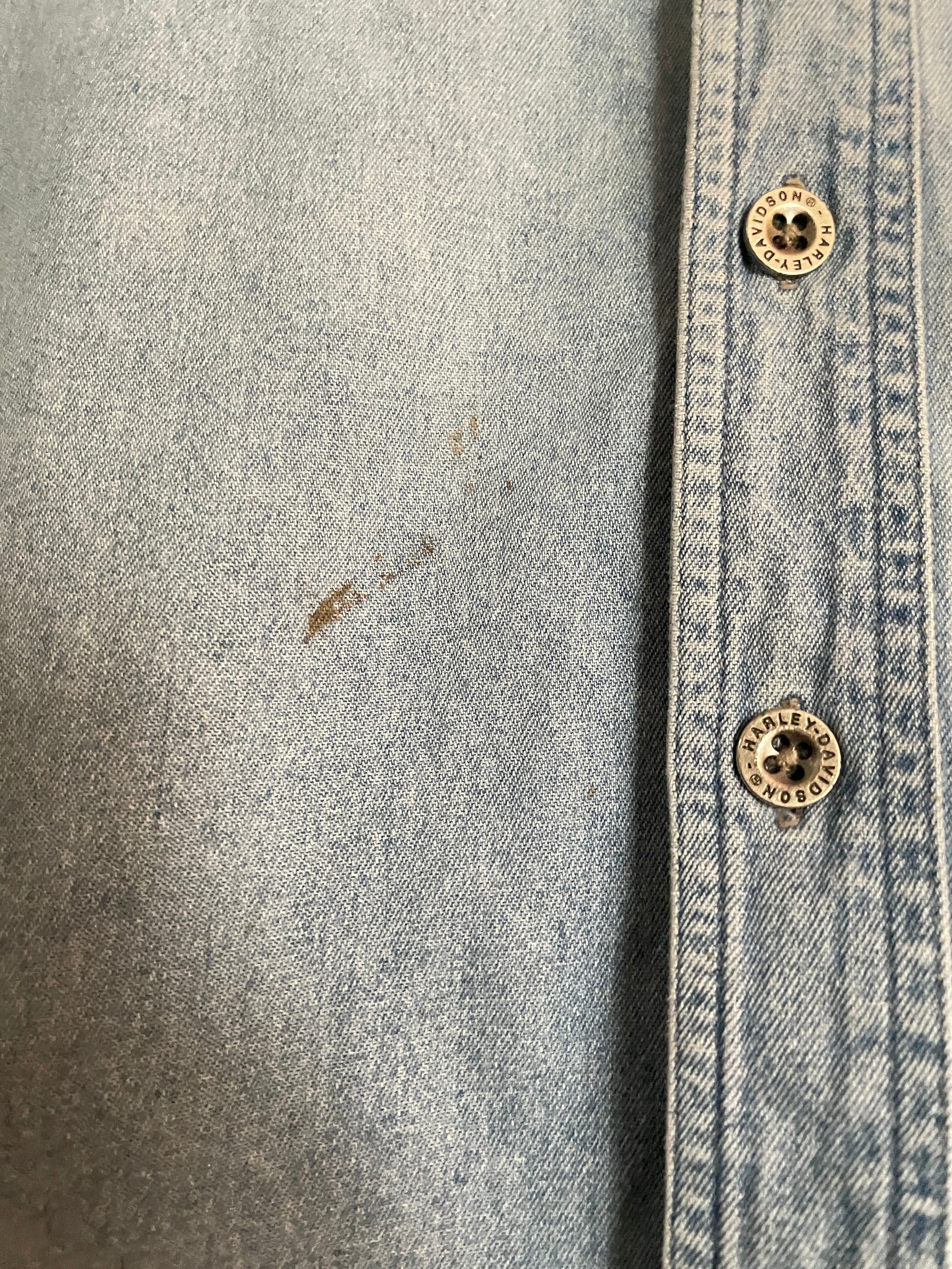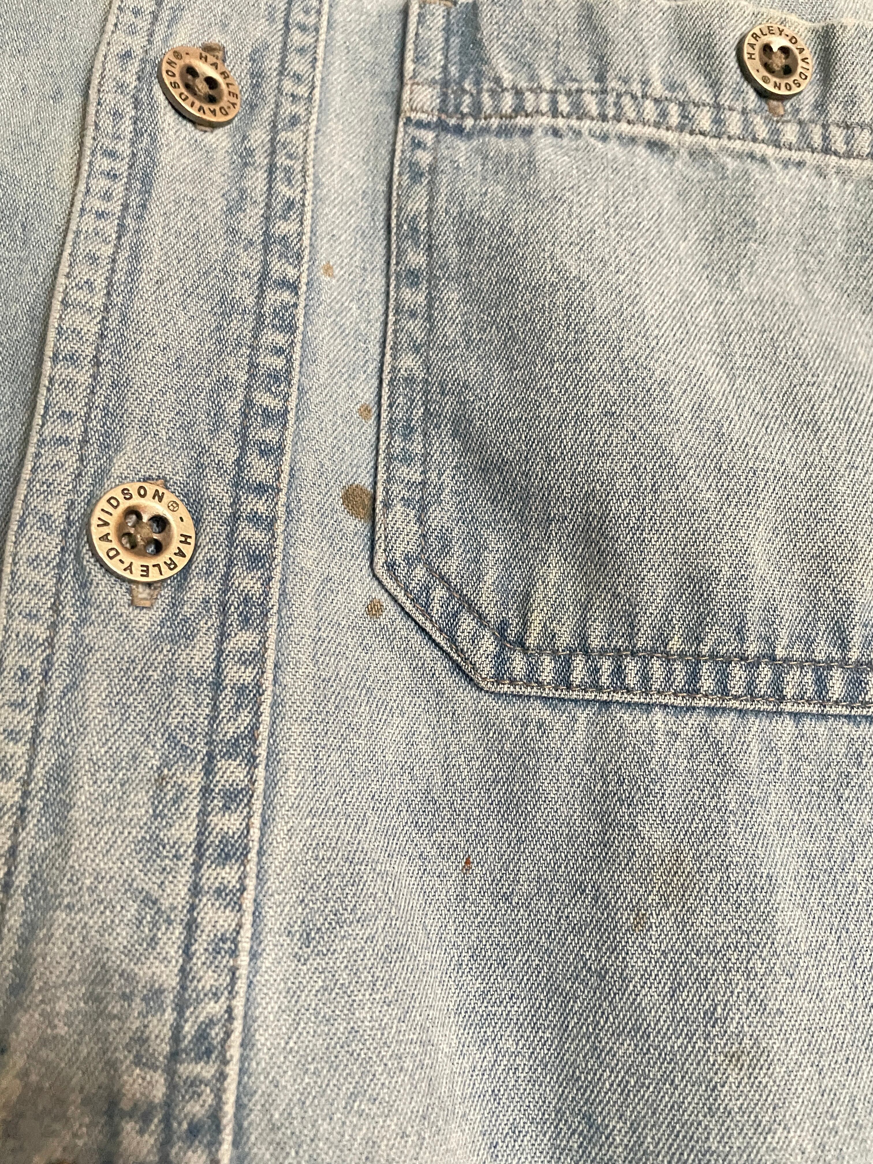 やや褪せた色味で、袖部分が上手くカットオフされた、ハーレーダビッドソンのノースリーブデニムシャツ。フロントにはワンポイントでハーレー刺繍。バックにはインパクトのあるハーレー刺繍とバイクに座っているクールな女性プリント。前後でメリハリのあるデザインがグッドです。多少の汚れ、ダメージが見られますが、それも込みで雰囲気のある一着です。使い方によっては、季節問わず活躍してくれるレイヤードアイテムです。1番下のボタンがありません。